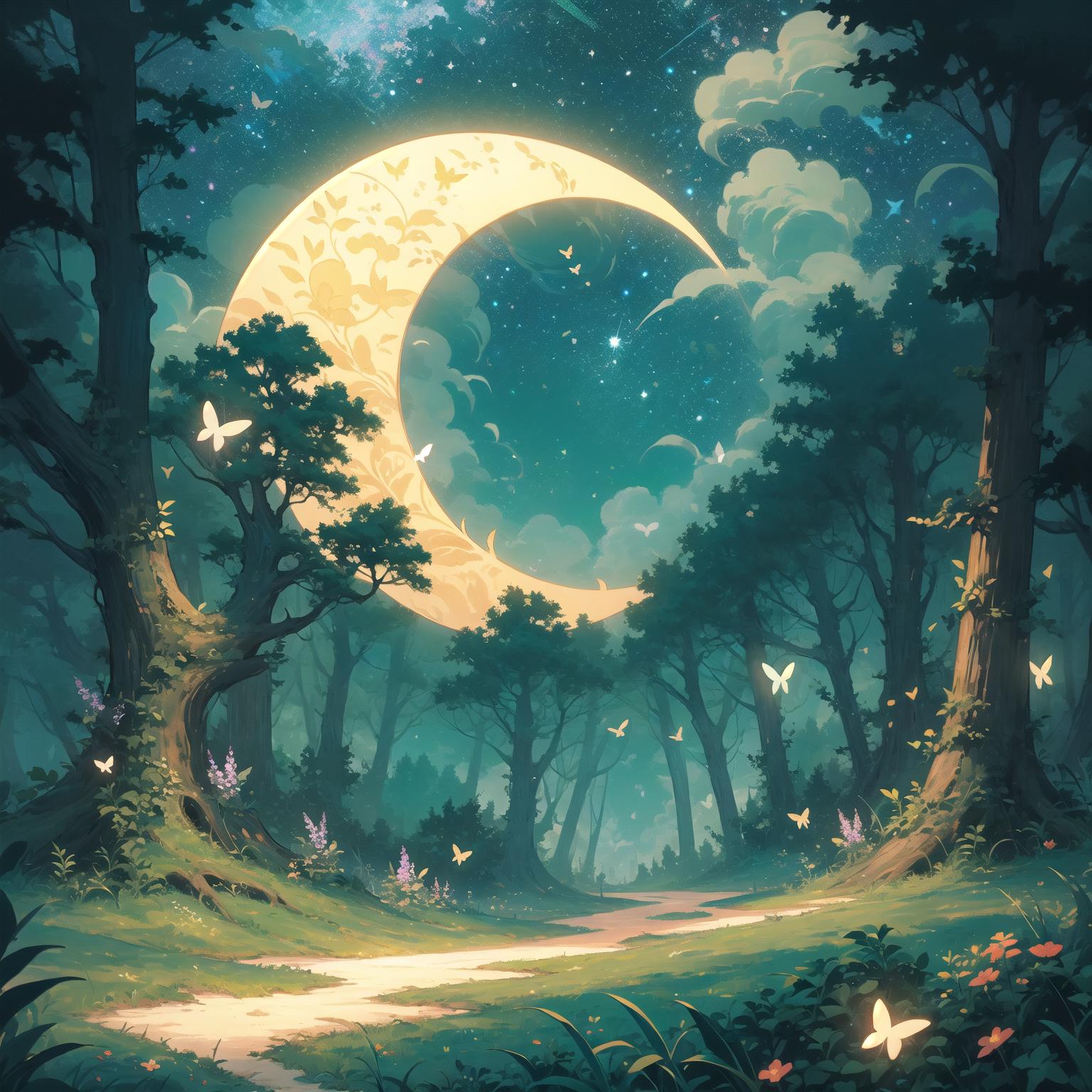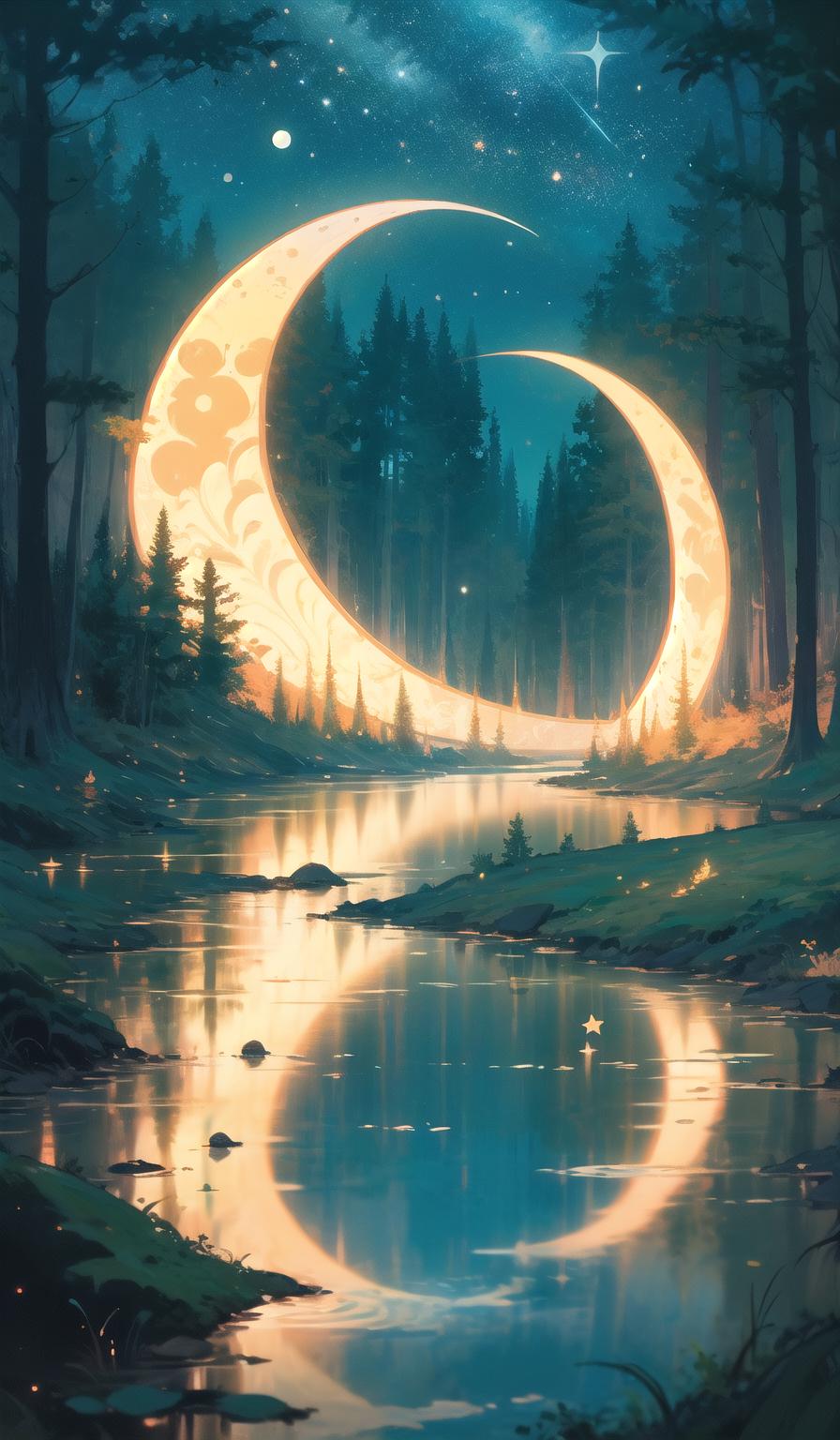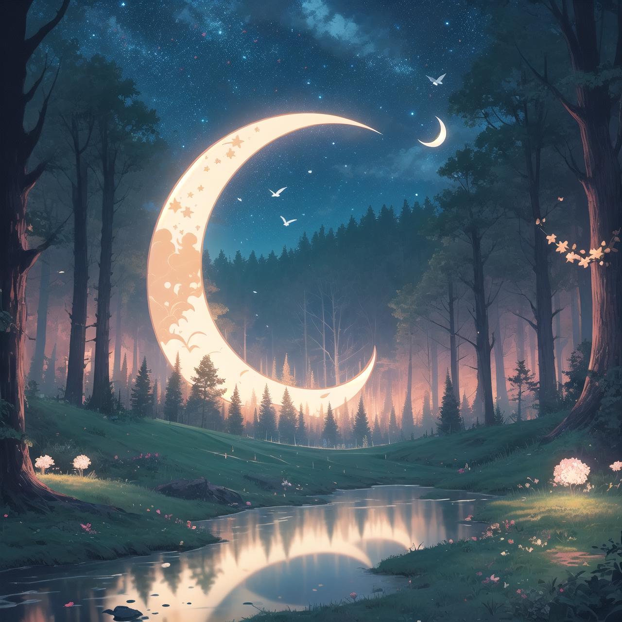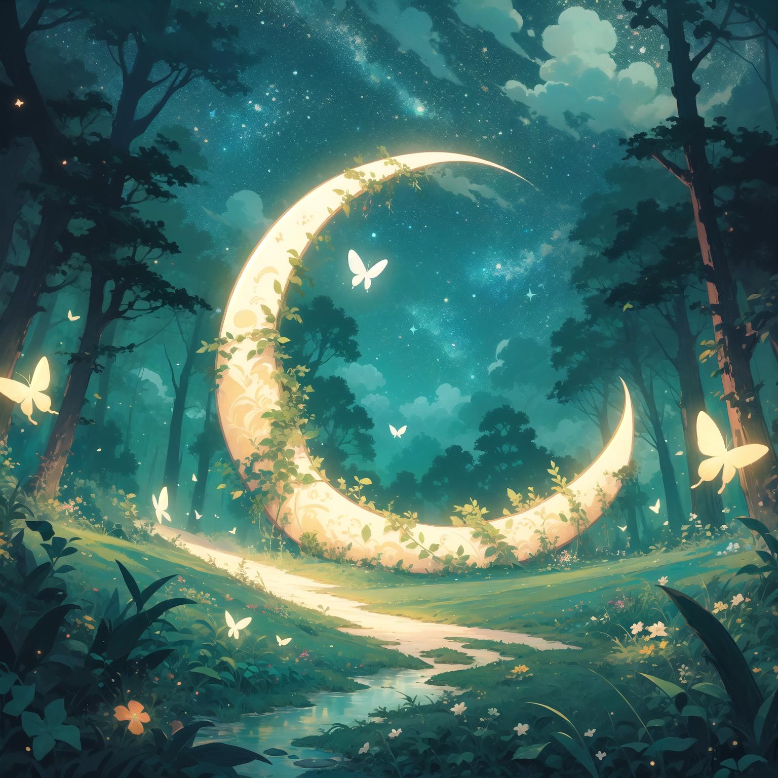 This model can generate a background of a forest with a surreal atmosphere where the moon is hanging upside down, decorated with laurel tree garlands for either a new moon or full moon, creating a drunk-like atmosphere.