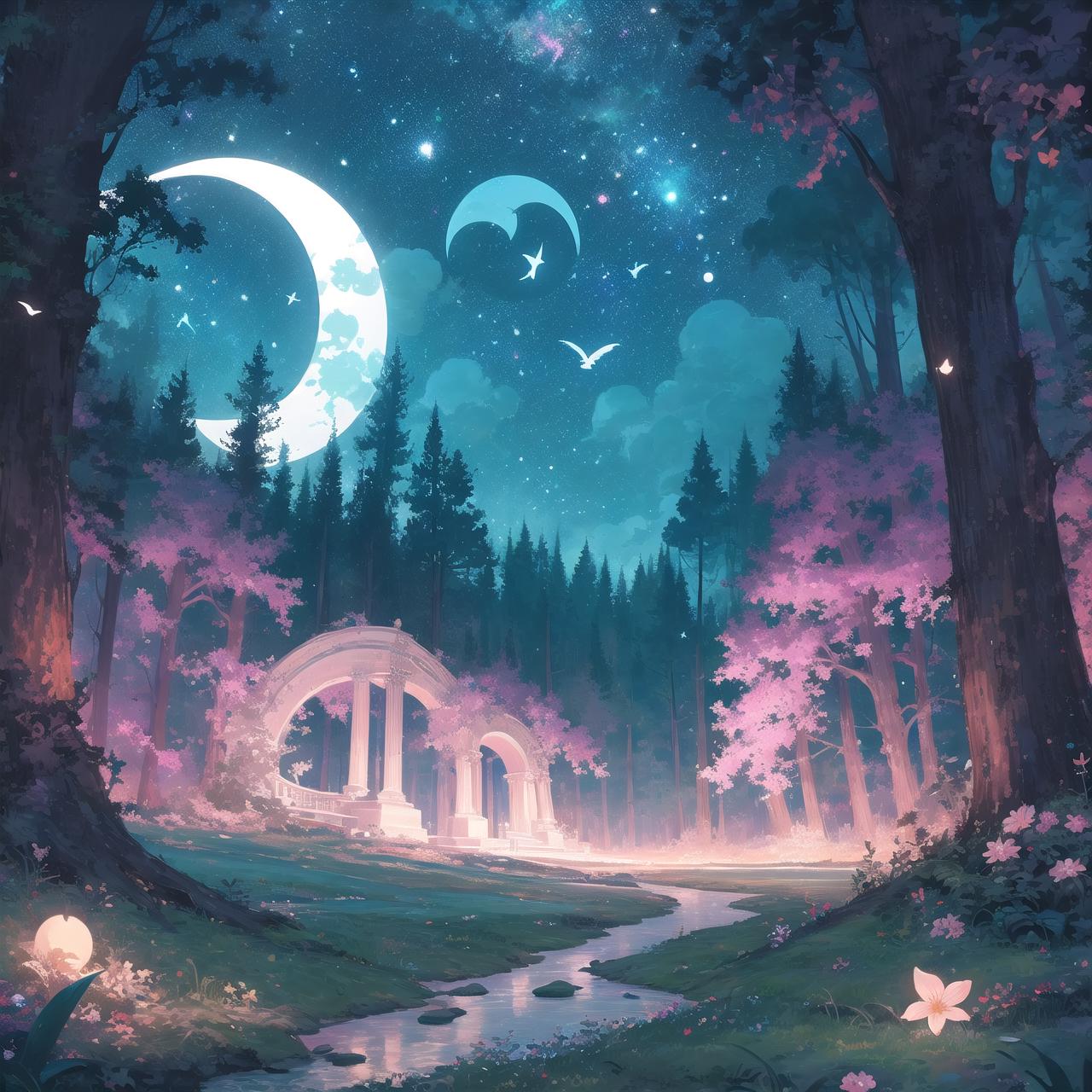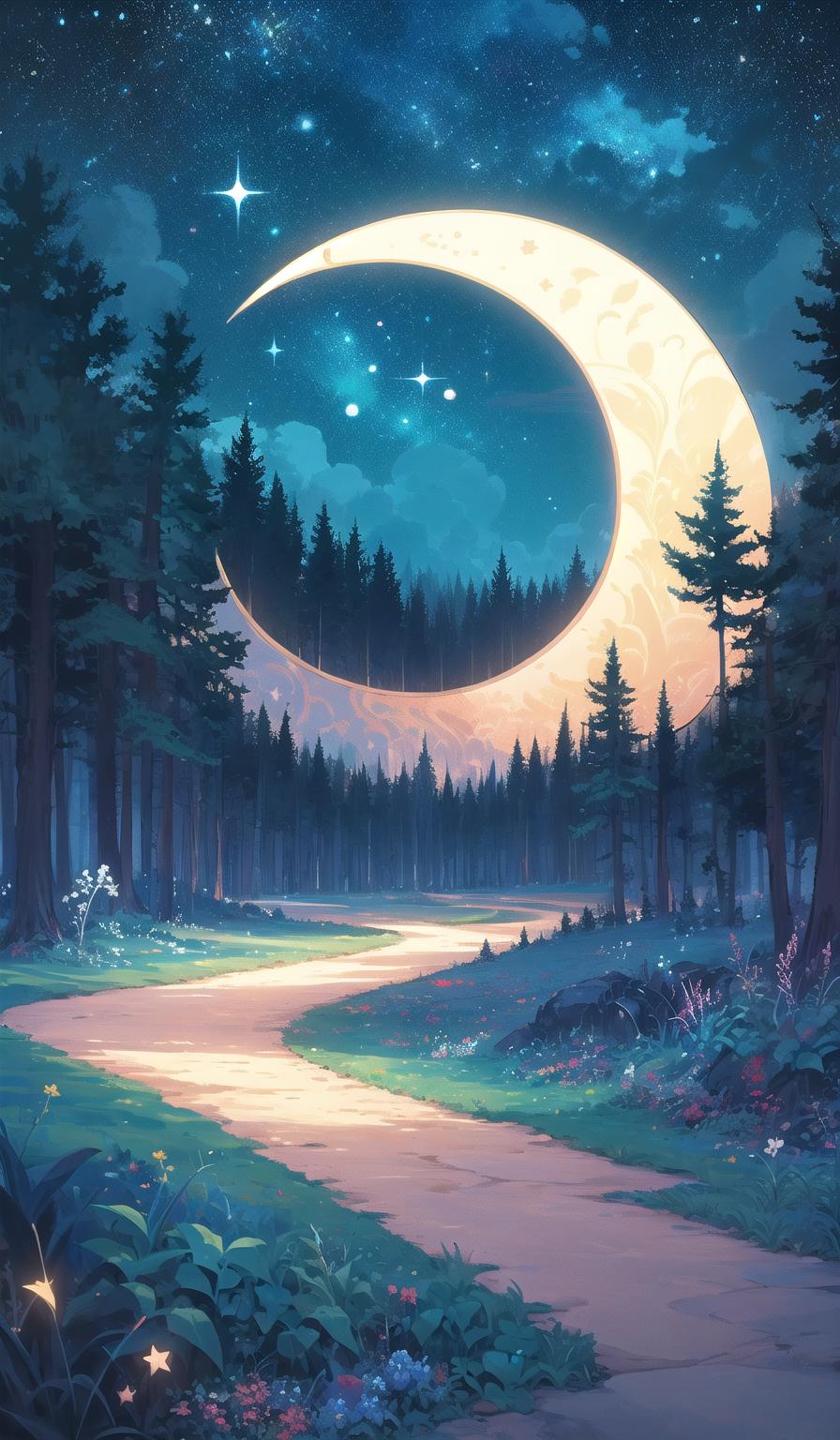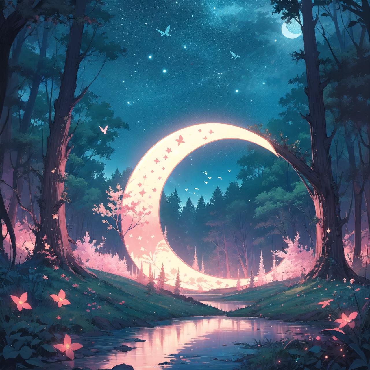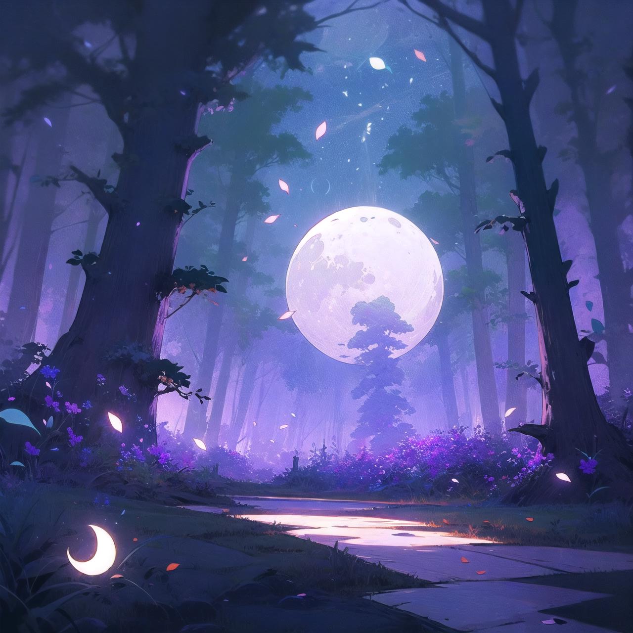 This model can generate a background of a forest with a surreal atmosphere where the moon is hanging upside down, decorated with laurel tree garlands for either a new moon or full moon, creating a drunk-like atmosphere.