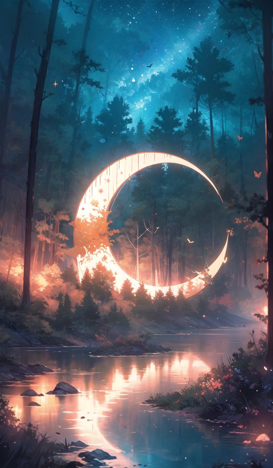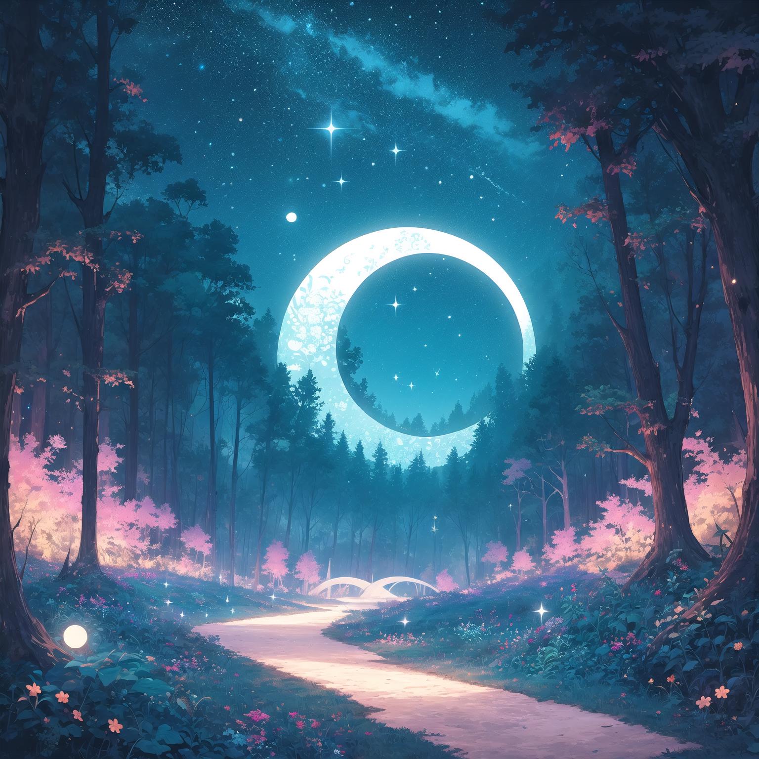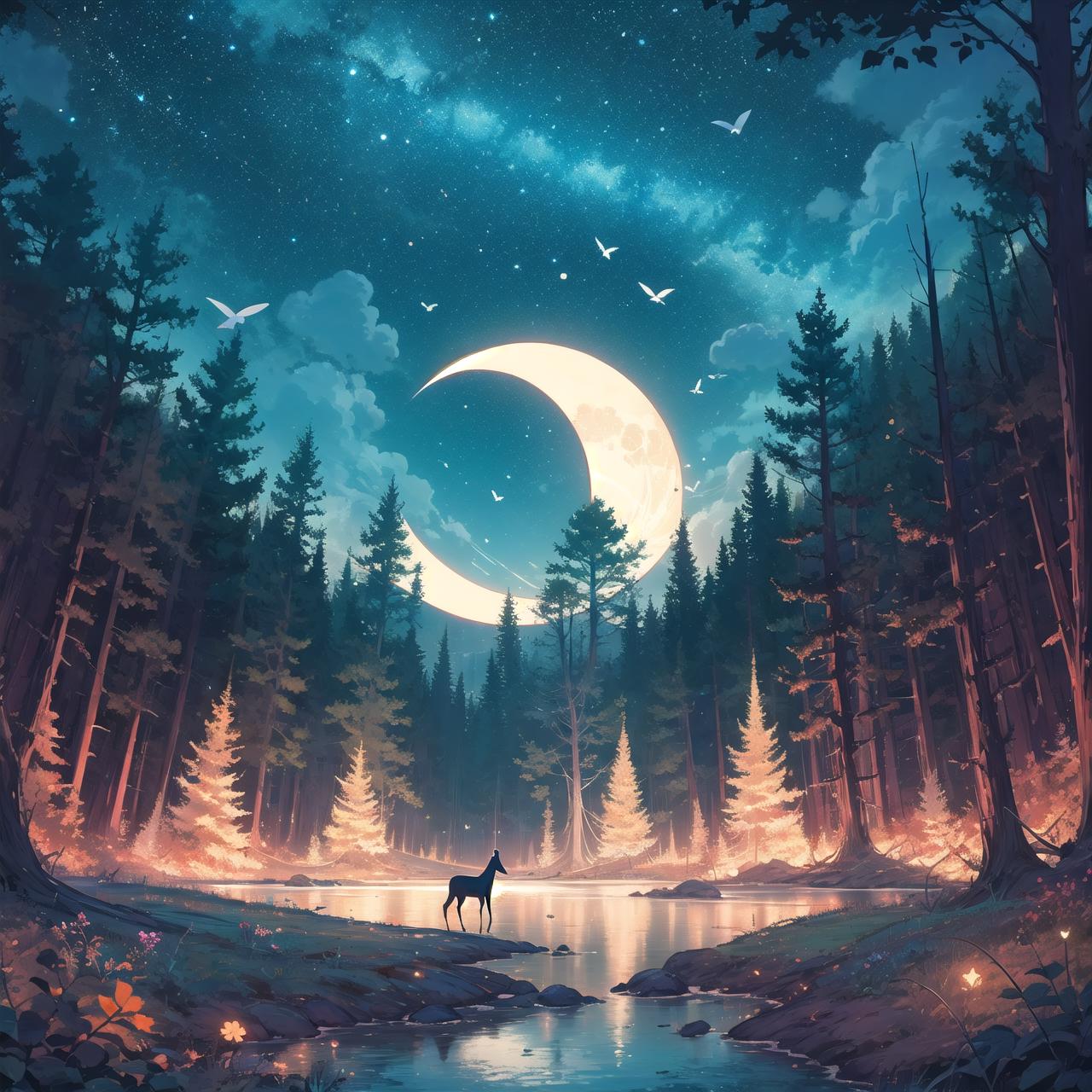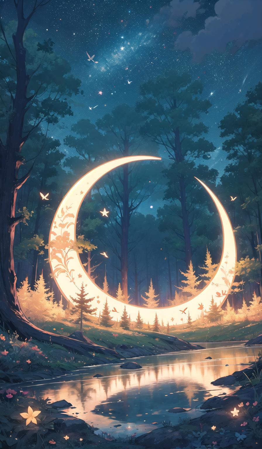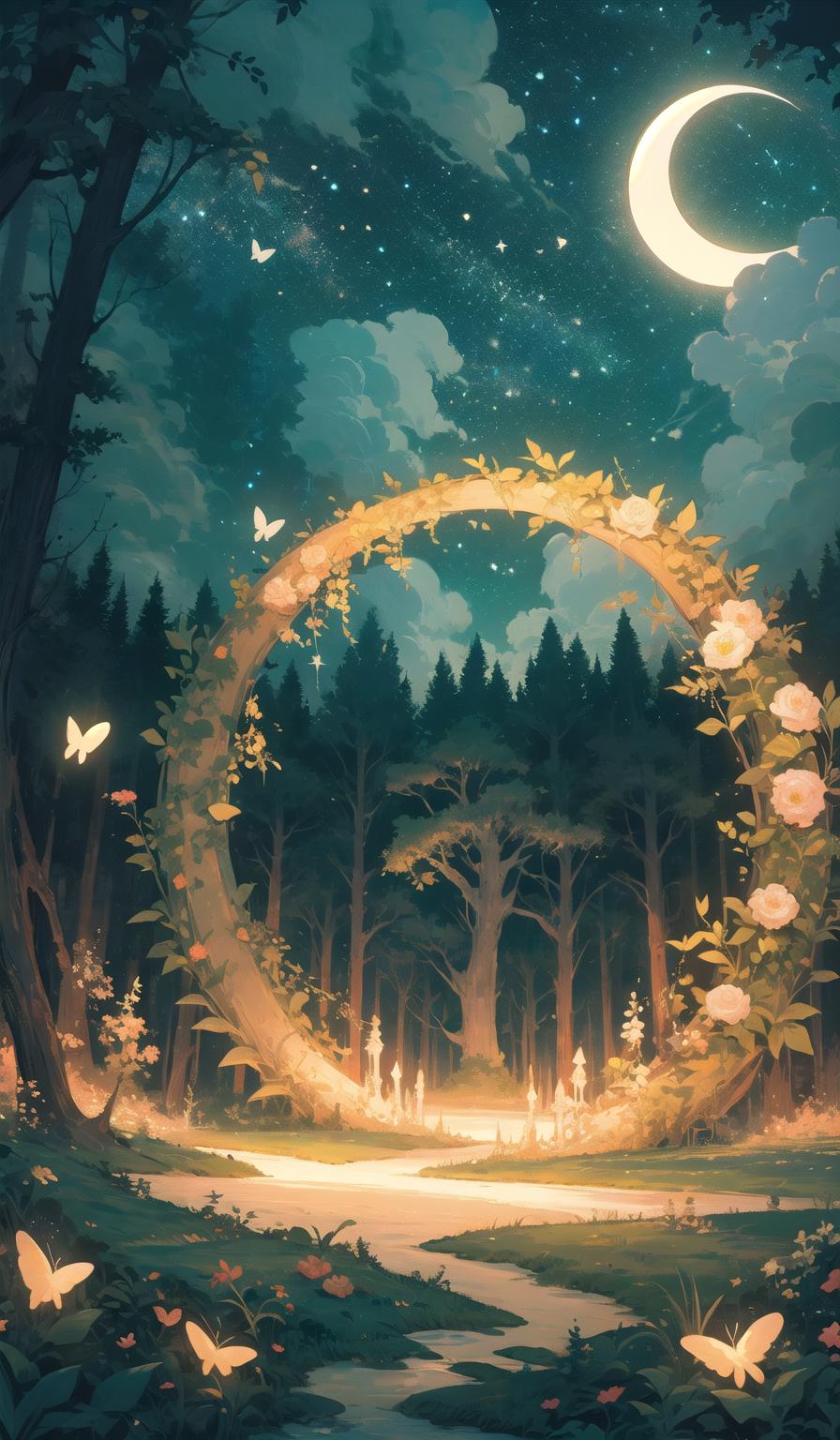 This model can generate a background of a forest with a surreal atmosphere where the moon is hanging upside down, decorated with laurel tree garlands for either a new moon or full moon, creating a drunk-like atmosphere.