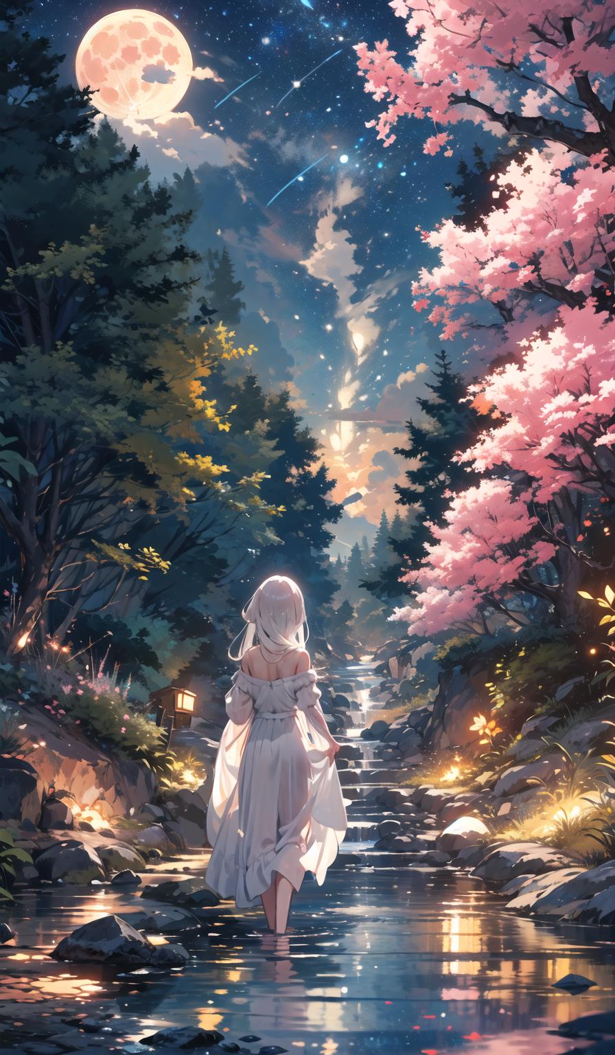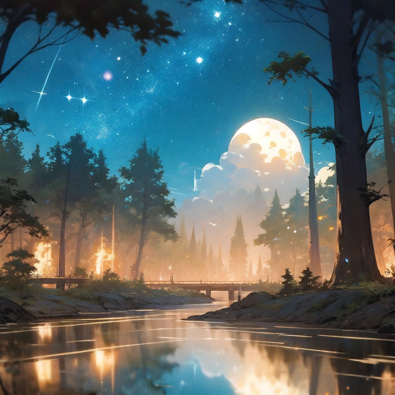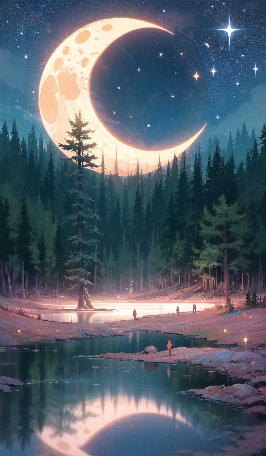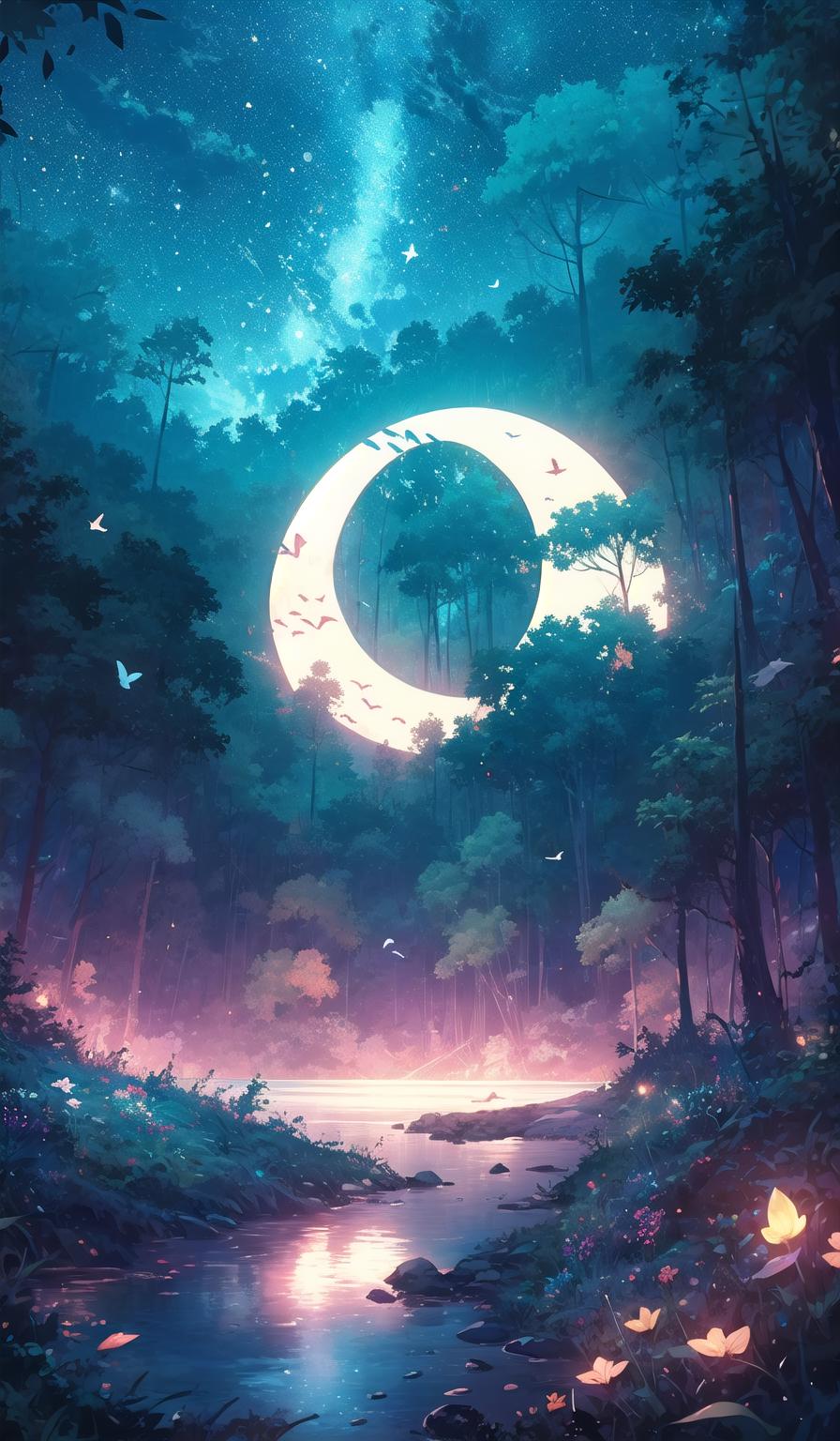 This model can generate a background of a forest with a surreal atmosphere where the moon is hanging upside down, decorated with laurel tree garlands for either a new moon or full moon, creating a drunk-like atmosphere.