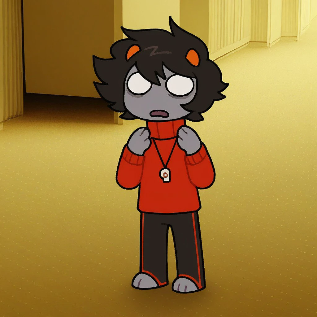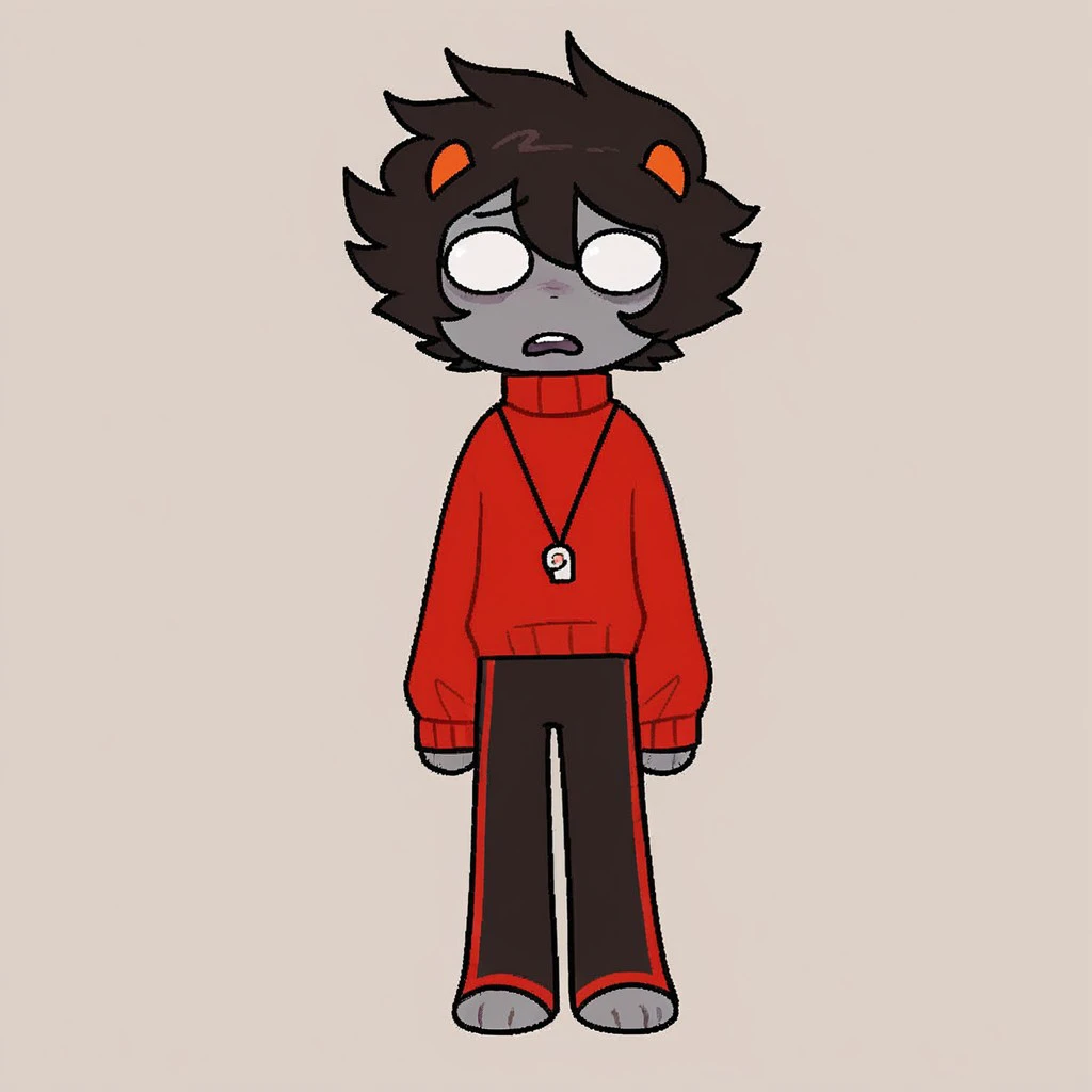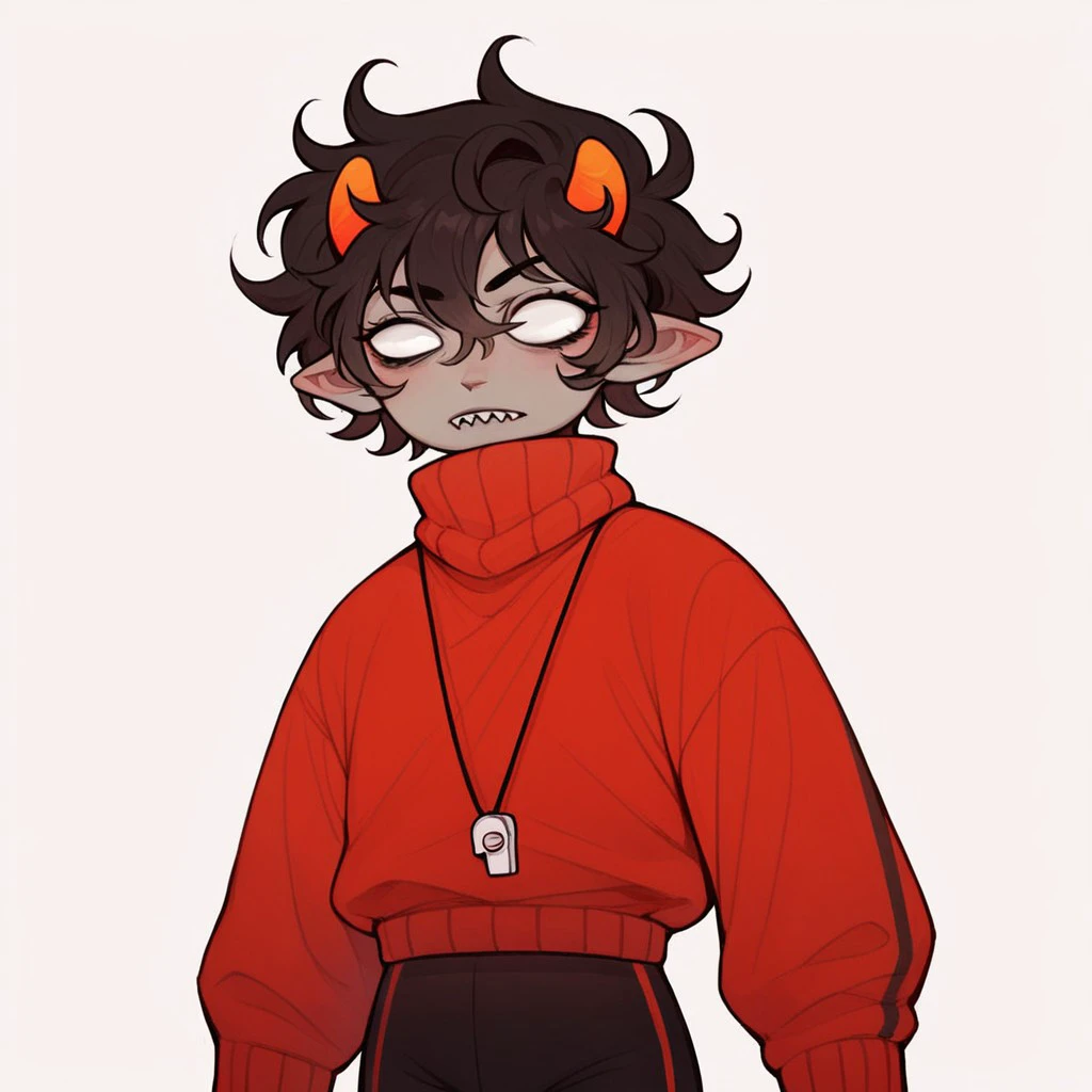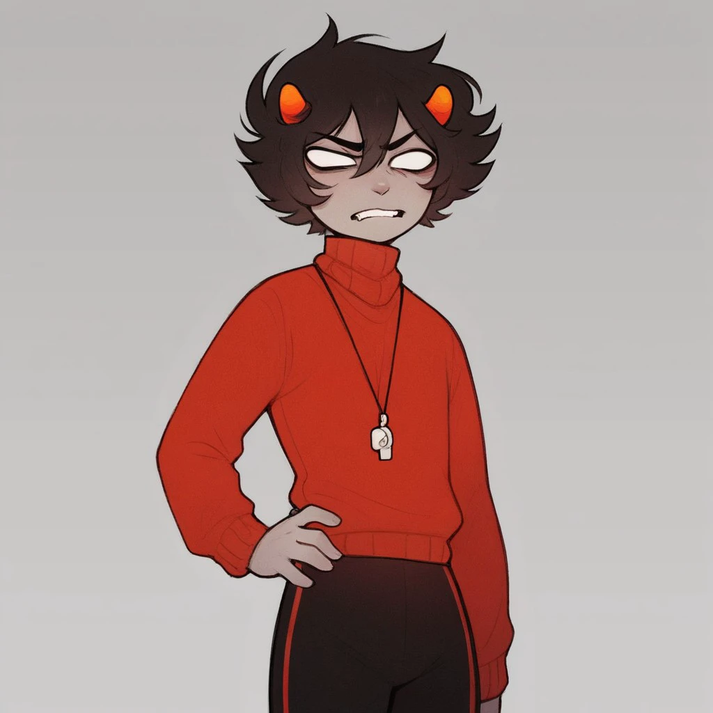 Kankri Vantas, solo, solo focus, black hair, short hair, small horns, gray skin, colored skin, white eyes, no pupils, sweater, red sweater, long sleeves, high collar, whistle around neck, whistle, black pants, red stripe on pants