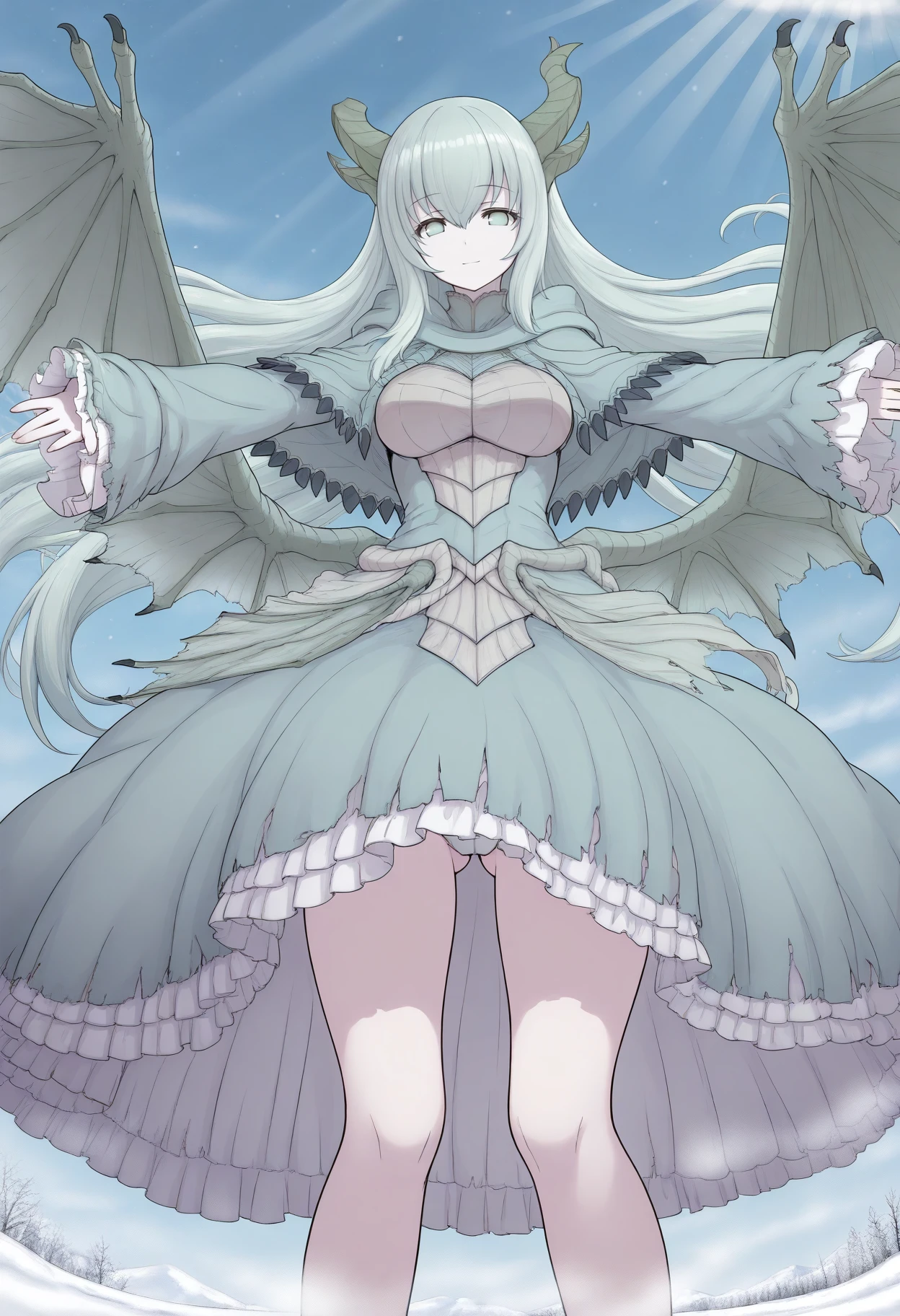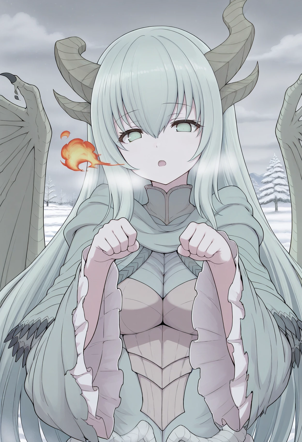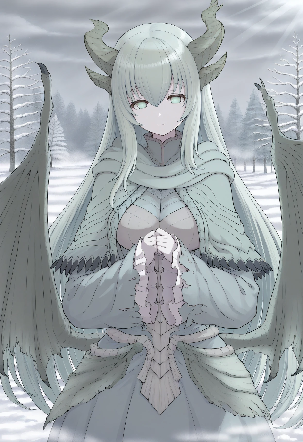PAARTHURNAX, dragon horns, broken horn, dragon girl, dragon wings, very long hair, green hair, hair between eyes, green eyes, breasts,