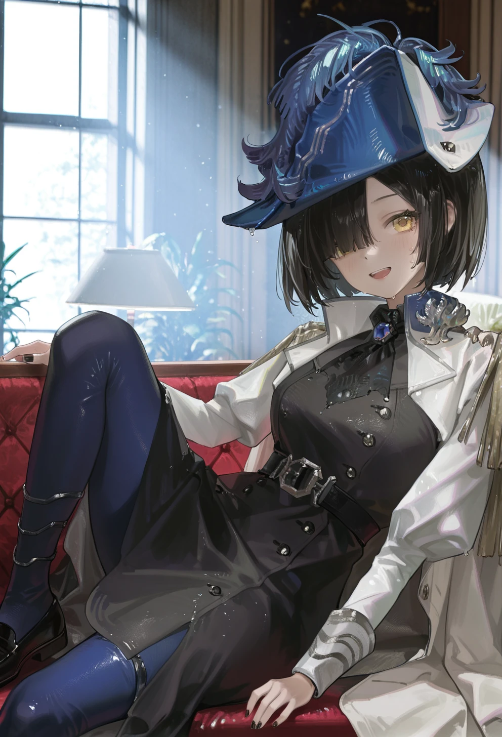 necrologist3, 1girl, solo, black hair, bob cut,parted bangs,hair over one eye, one eye covered, short hair,yellow eyes,black nails,blue hat,blue hat feathers, tricorne,black ascot,black dress,long dress,silver epaulette, white coat,open coat,coat on shoulders,long sleeves,juliet sleeves,anchor,black belt,gem,buttons,coat on shoulders, covered legs,leg ring,blue stockings,black loafers,