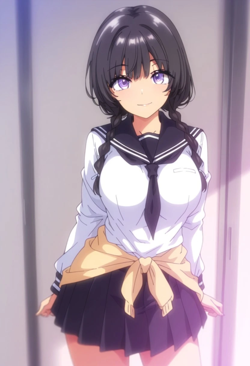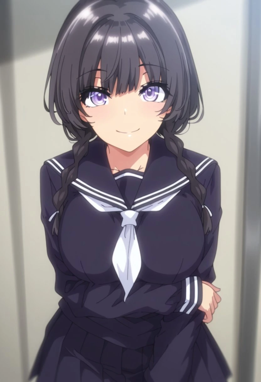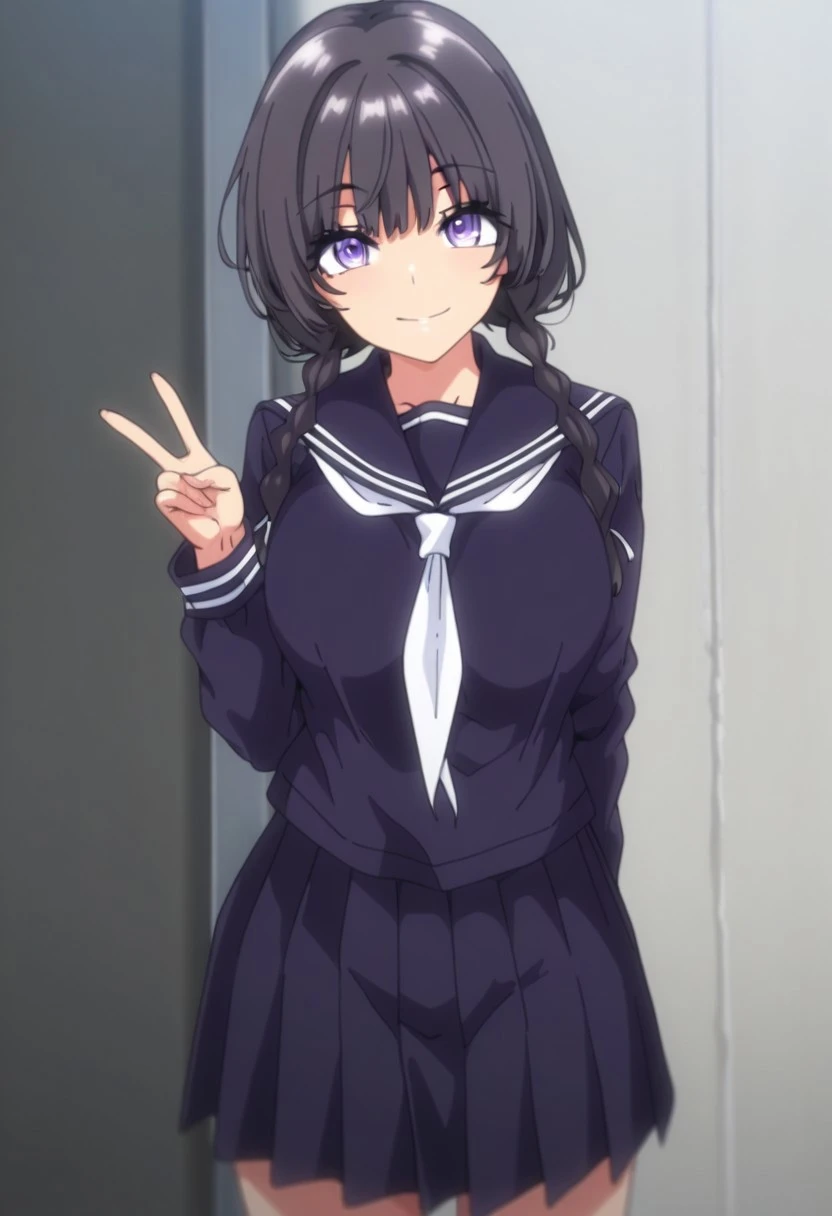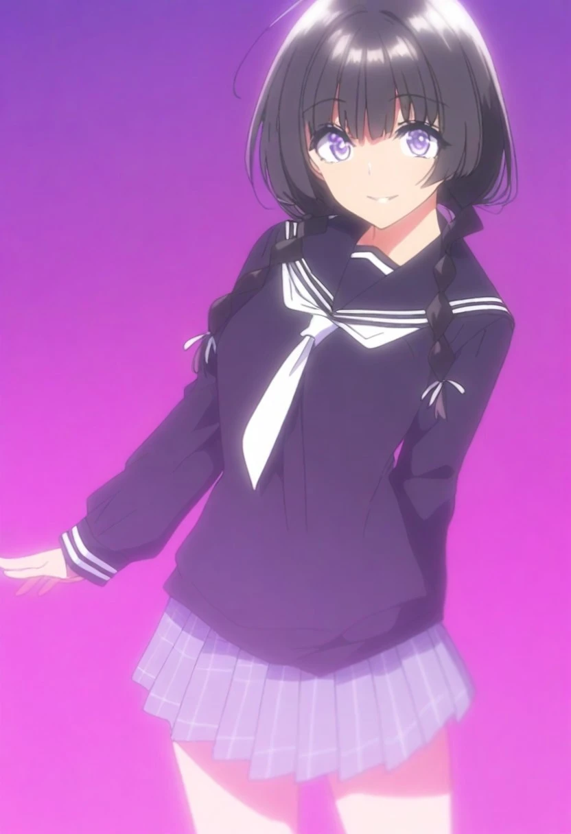 suzune kagami, 1girl, solo, black hair, twin braids, purple eyes, long hair