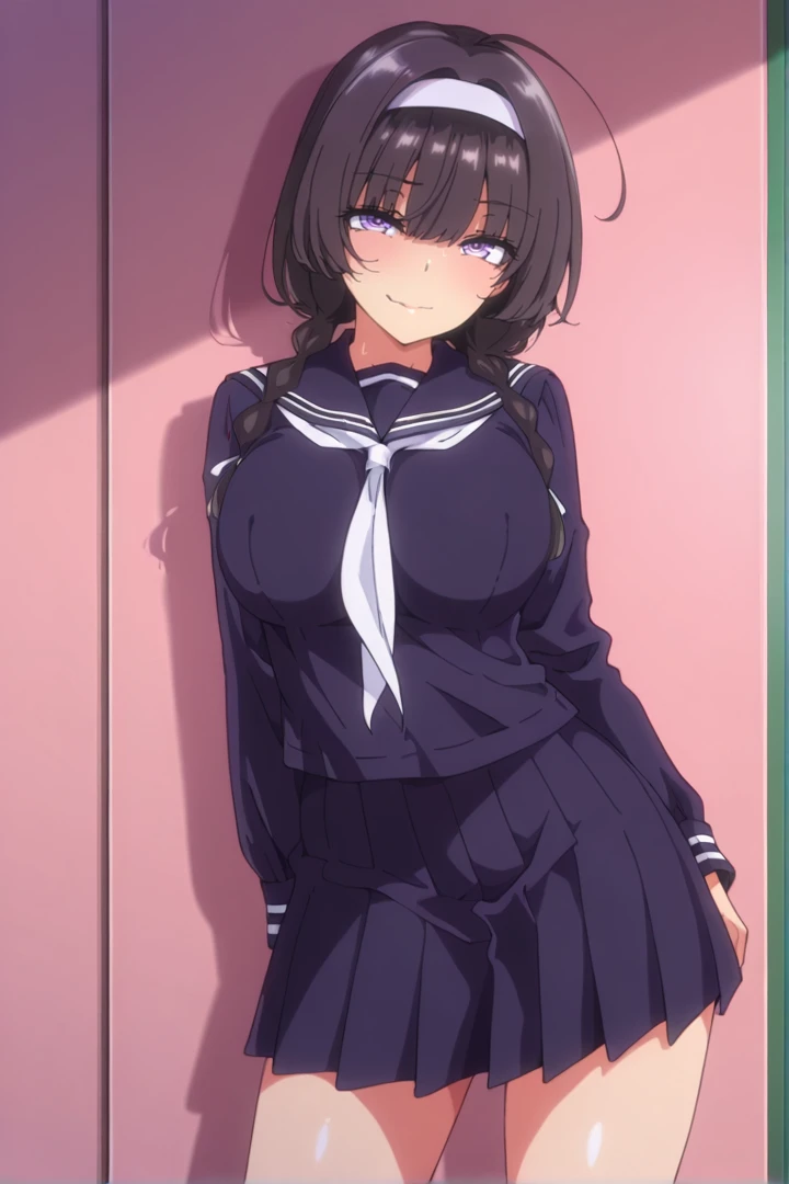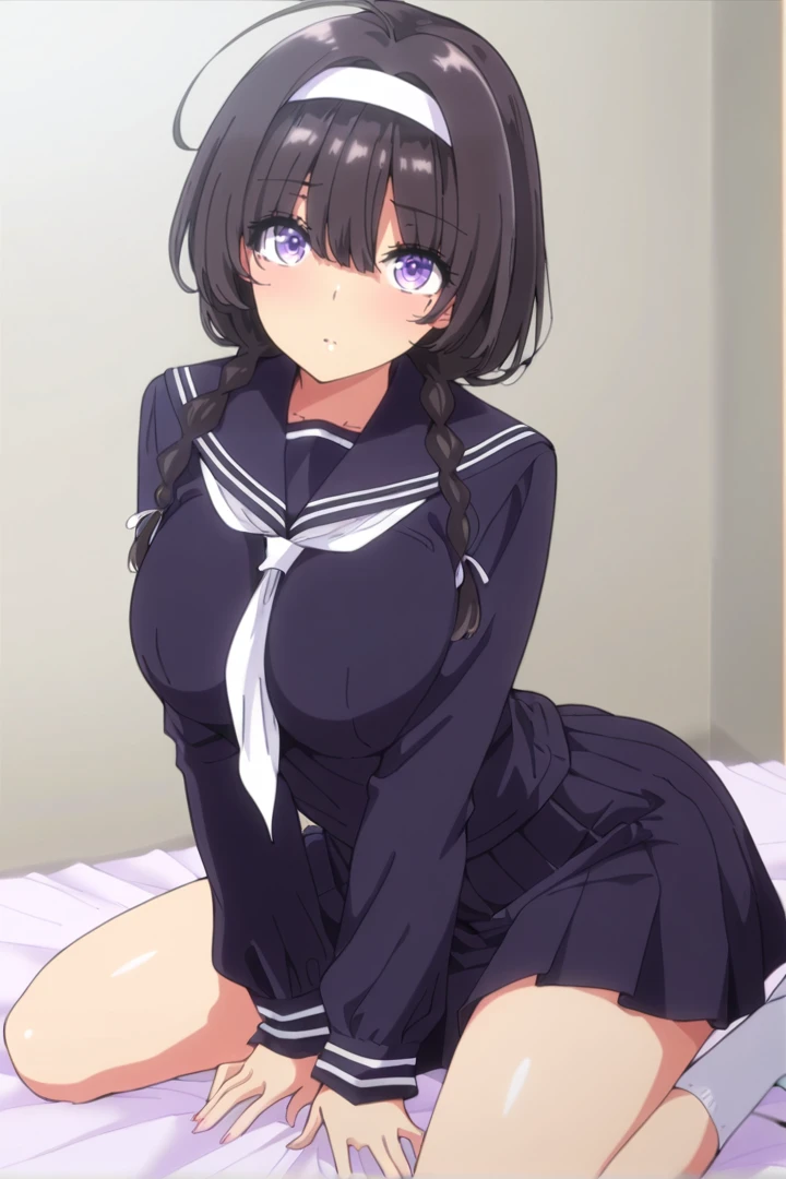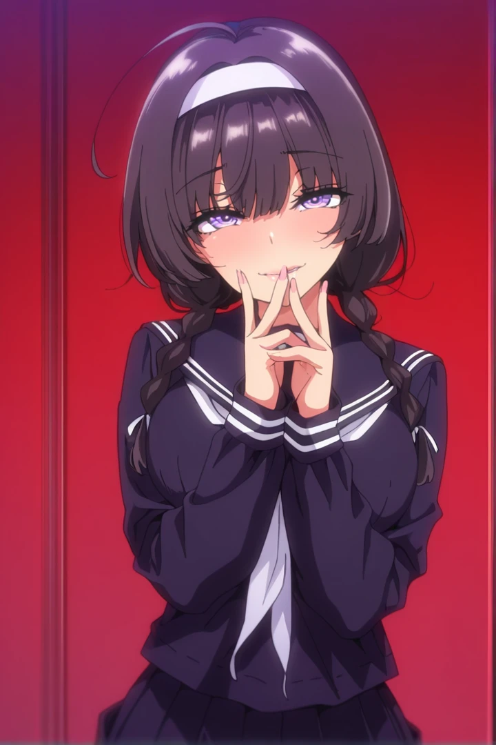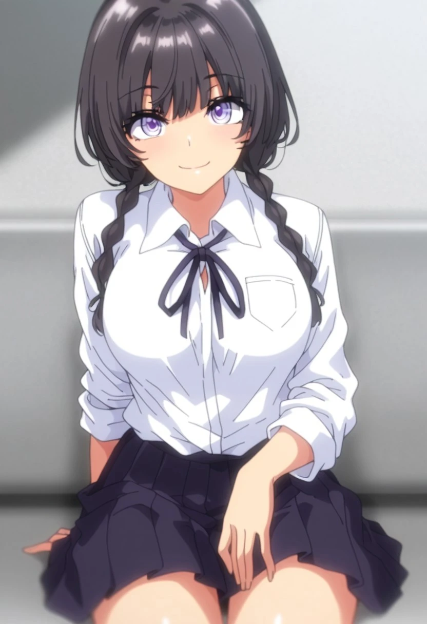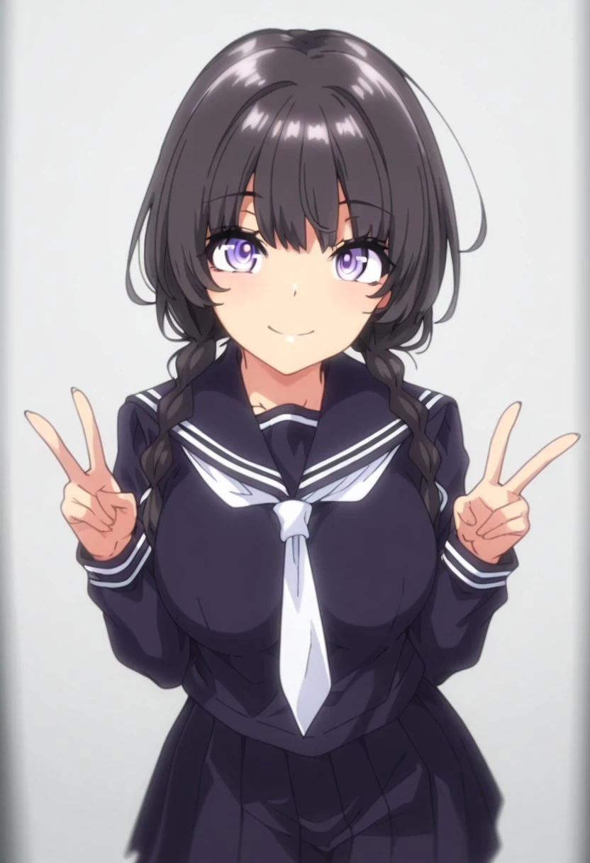 suzune kagami, 1girl, solo, black hair, twin braids, purple eyes, long hair