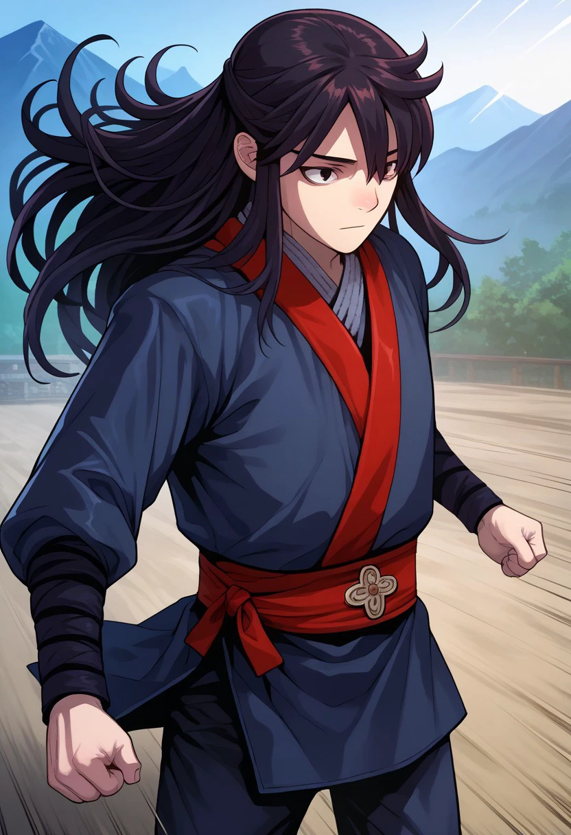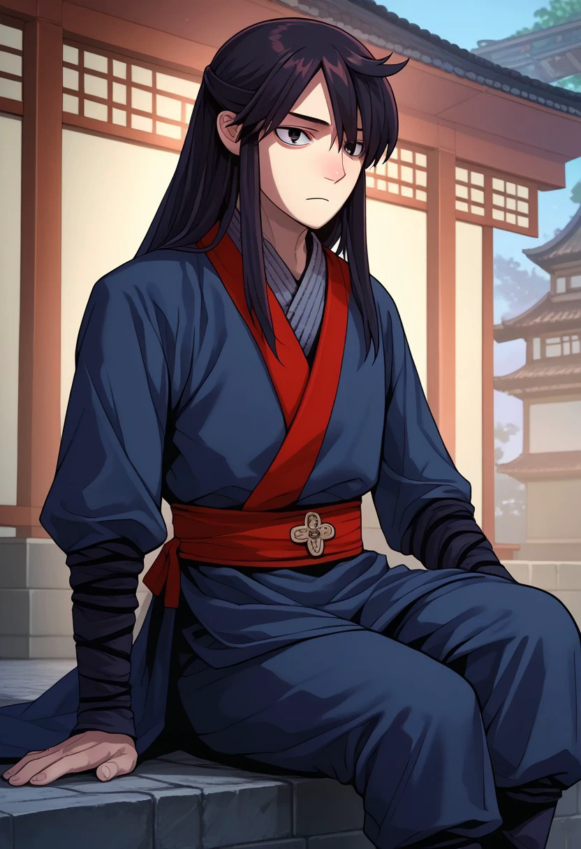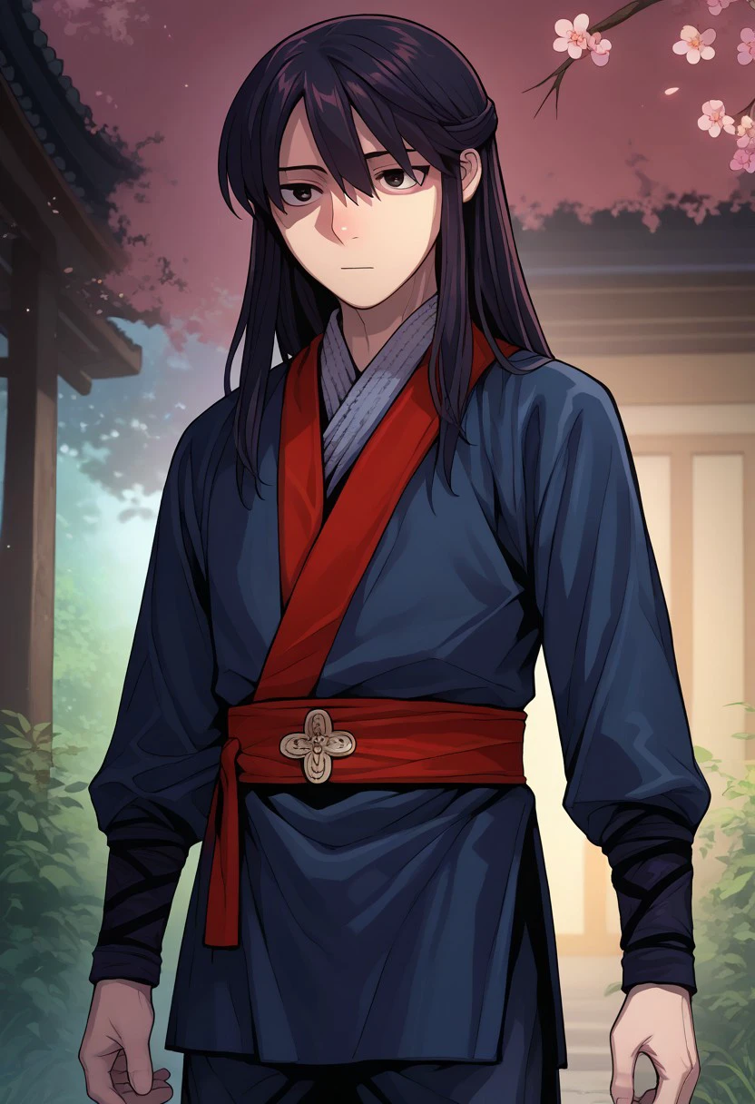 mokgy, 1boy, male focus, solo, black eyes, black hair, long hair, half updo, bangs, chinese clothes, hanfu, shirt, black shirt, long sleeves, sash, pants, black pants, boots, black footwear,