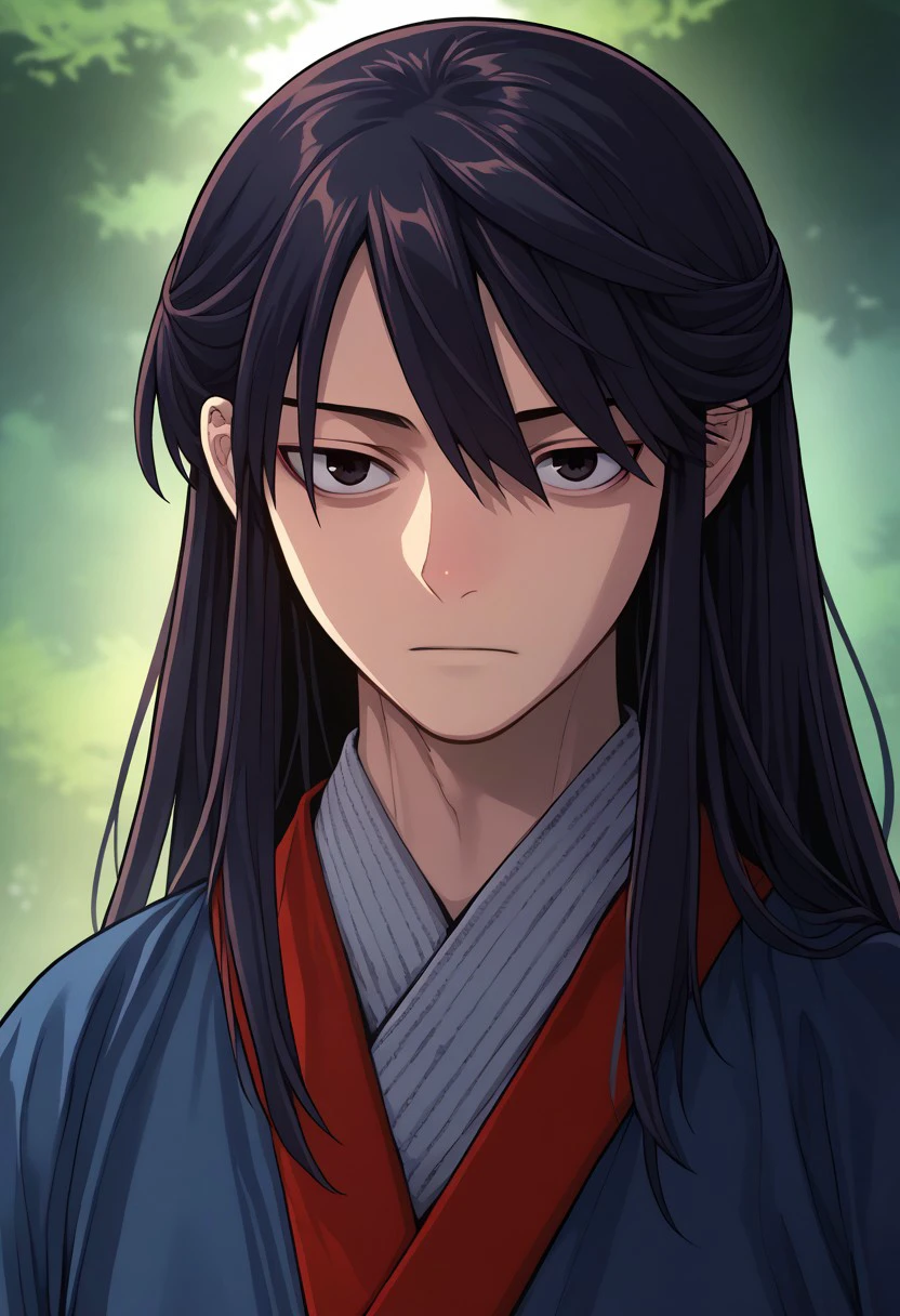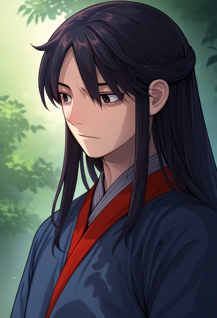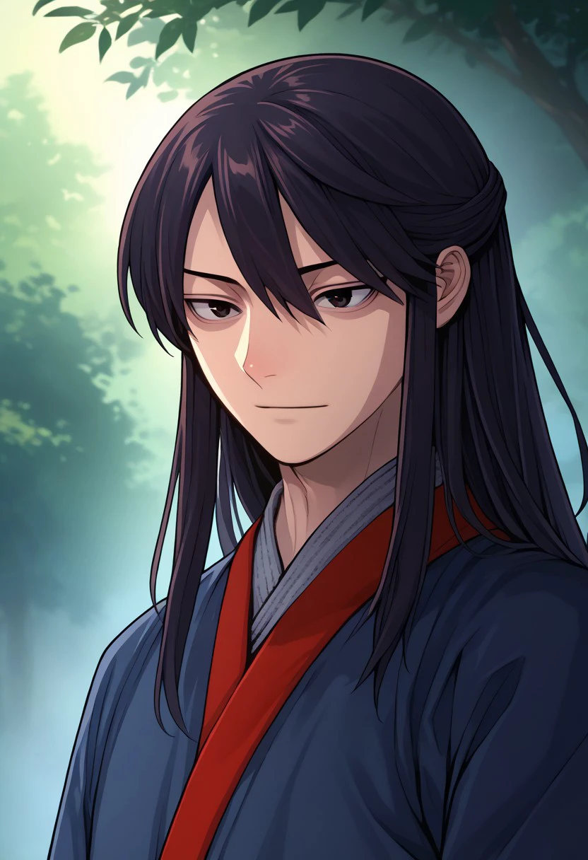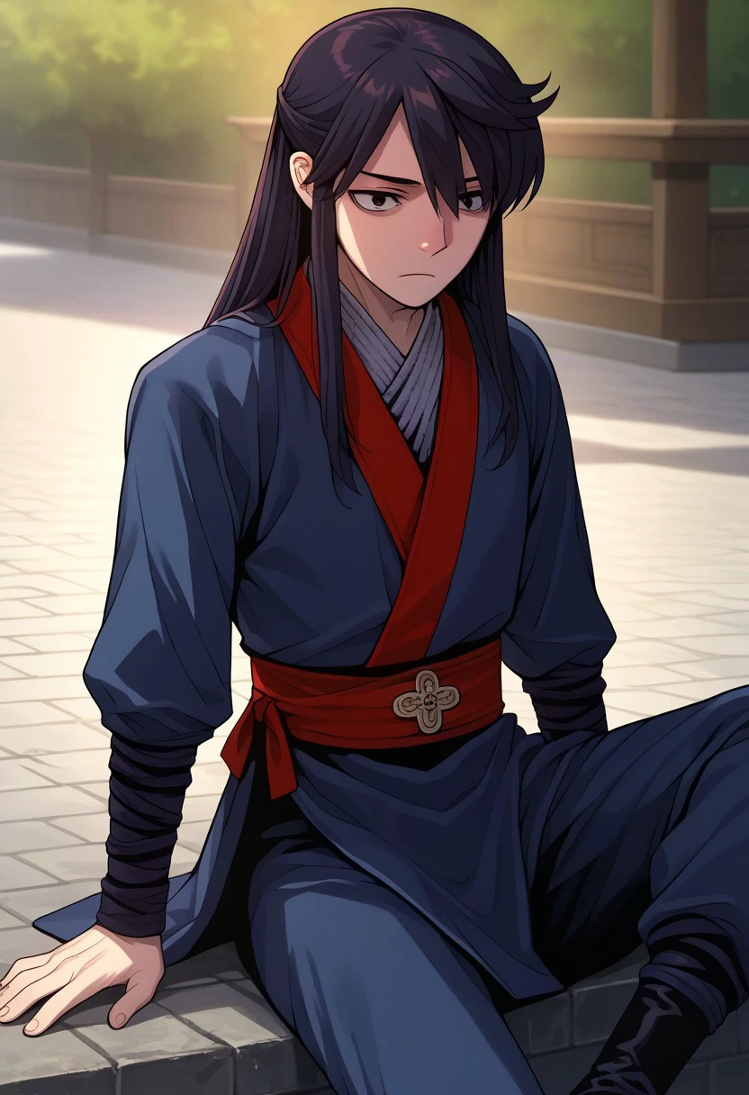 mokgy, 1boy, male focus, solo, black eyes, black hair, long hair, half updo, bangs, chinese clothes, hanfu, shirt, black shirt, long sleeves, sash, pants, black pants, boots, black footwear,