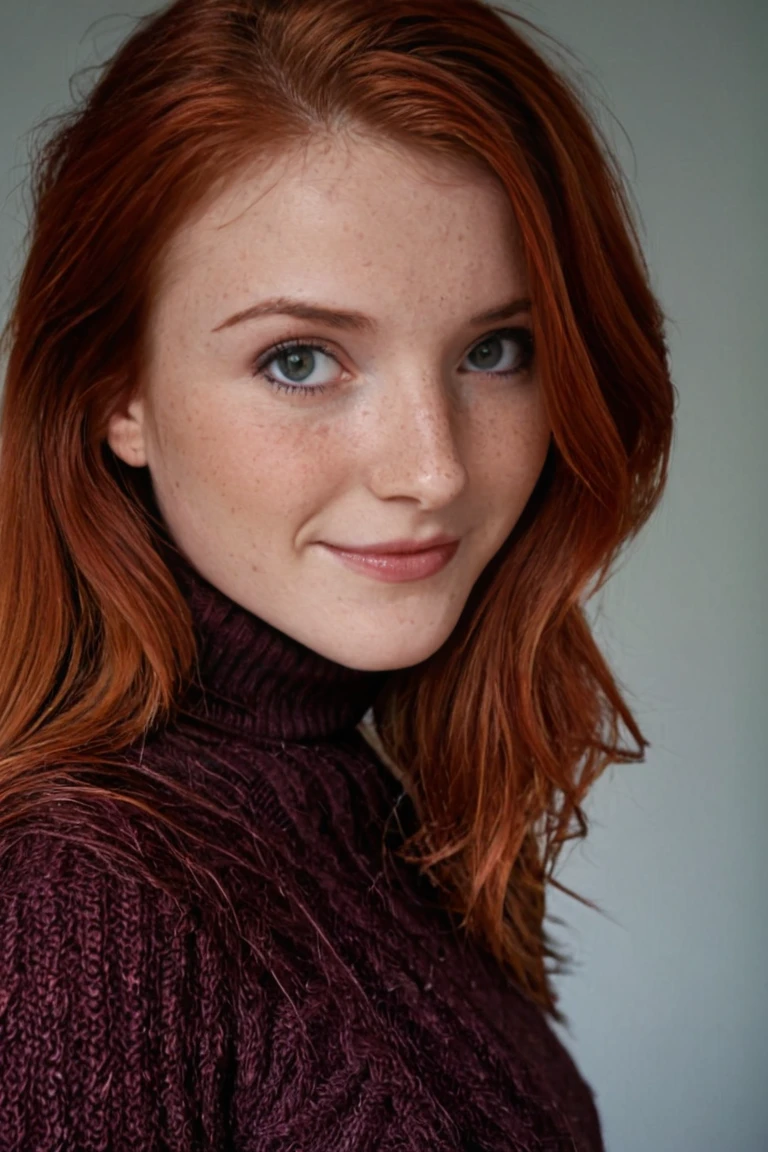 Face photo of a 24-year-old Irish woman, long red hair, green eyes, medium size chest, slim figure, soft jawline, fair skin with freckles around the nose, neutral backdrop.