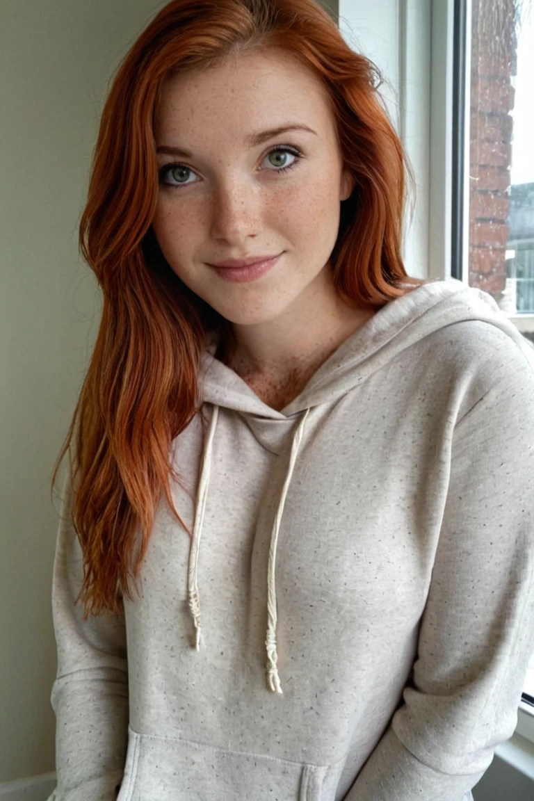 A 24 year old Irish woman with fair skin and freckles, long red hair, green eyes, slim figure with a medium sized chest and a soft jawline.