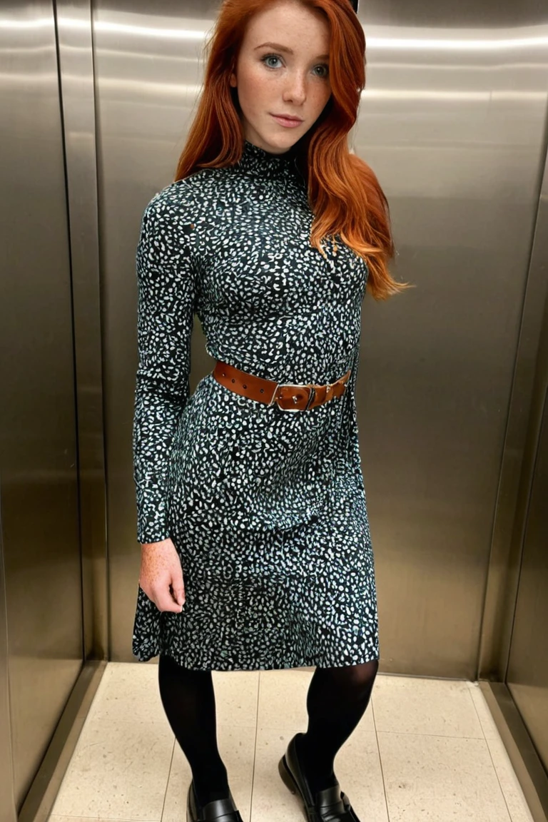 "wearing a long-sleeve high-collar floral print dress that falls mid-calf, cinched with a narrow leather belt, black tights and loafers"