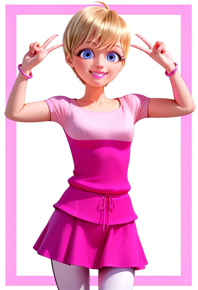 Rose Lavillant, blonde hair, short hair, pixie cut, bangs, blue eyes, pink lipstick