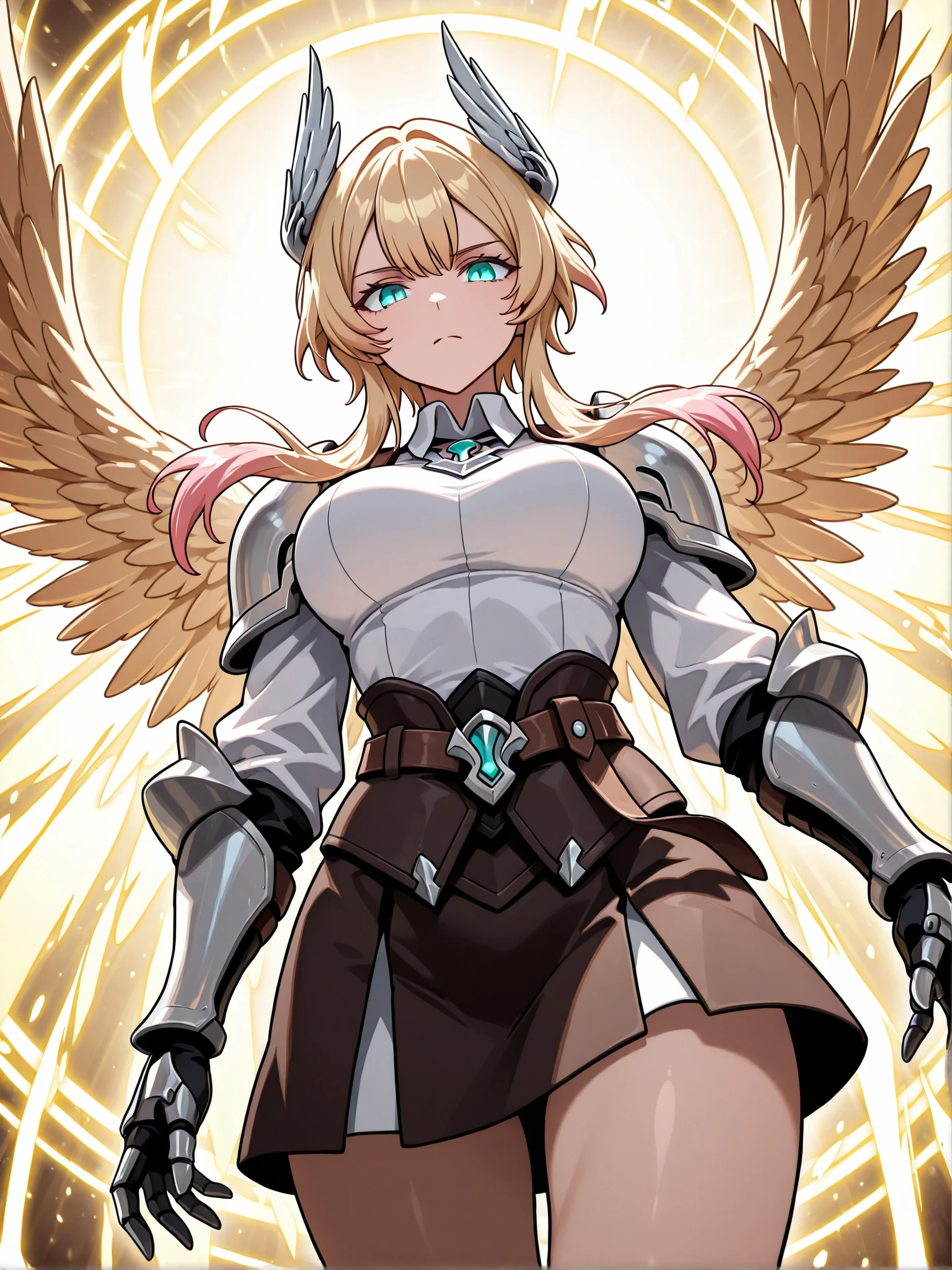 1girl, Valkyrie_Ingrid_(Valhalla Saga), short blonde hair, long sidelocks, light pink gradient tips, parted bangs, loose strands framing face, light blue eyes, wing-shaped crown, small pointed metallic horns, tall athletic feminine build, strong physique, large chest