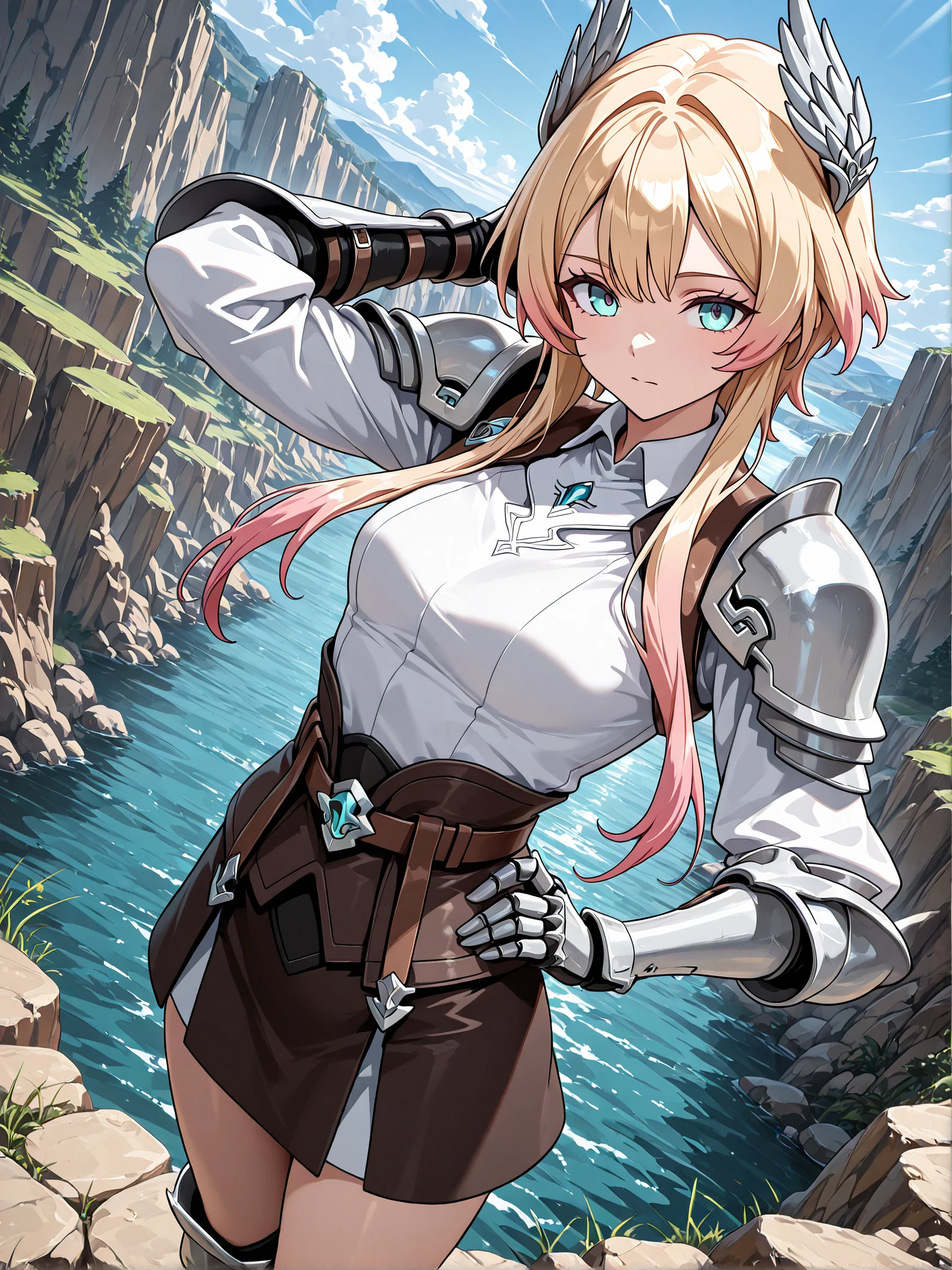 white clothes, long sleeves, brown waist skirt (angular cut, short length), silver steel pauldron, silver gauntlet, waist belt, brown belt