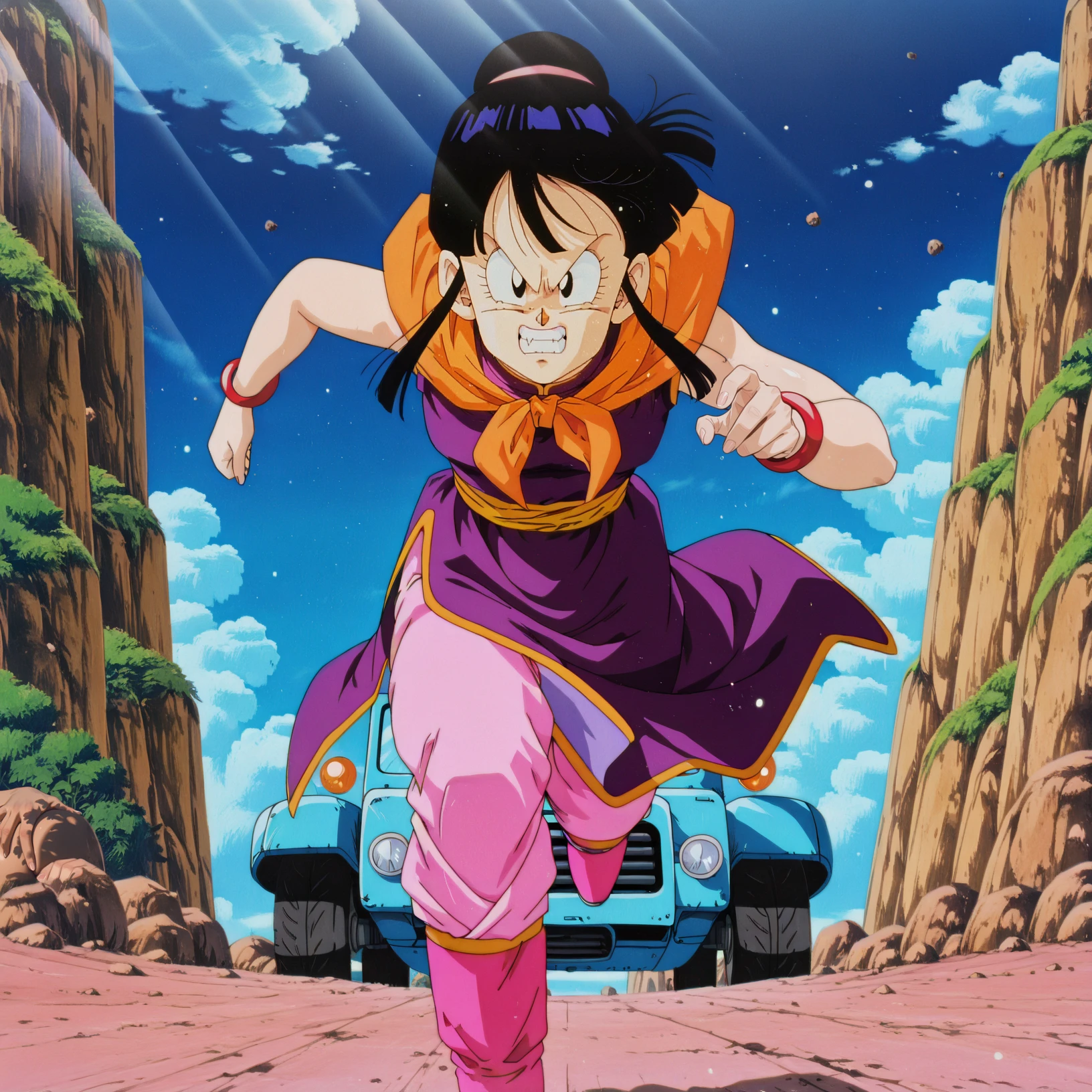 chi-chi, DBZ, end of buu, alternate hairstyle, parted bangs, black hair, black eyes, single hair bun,