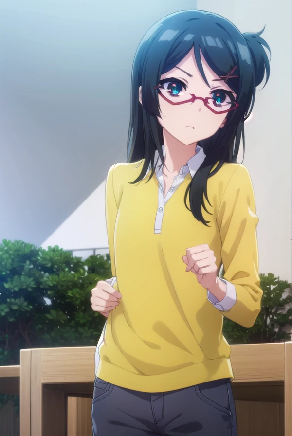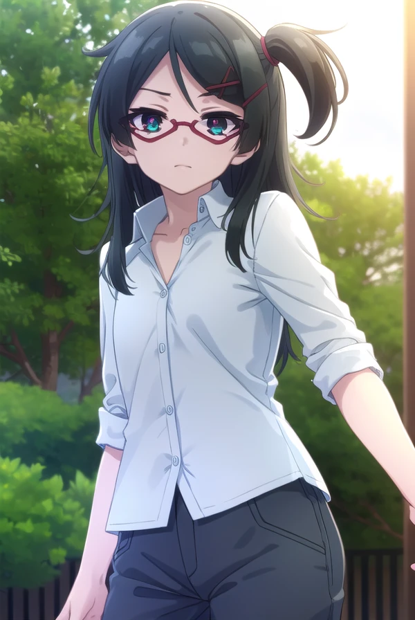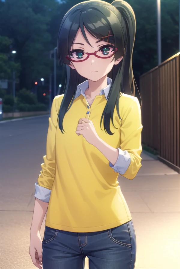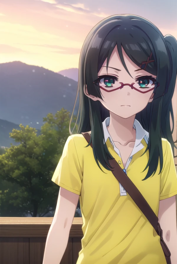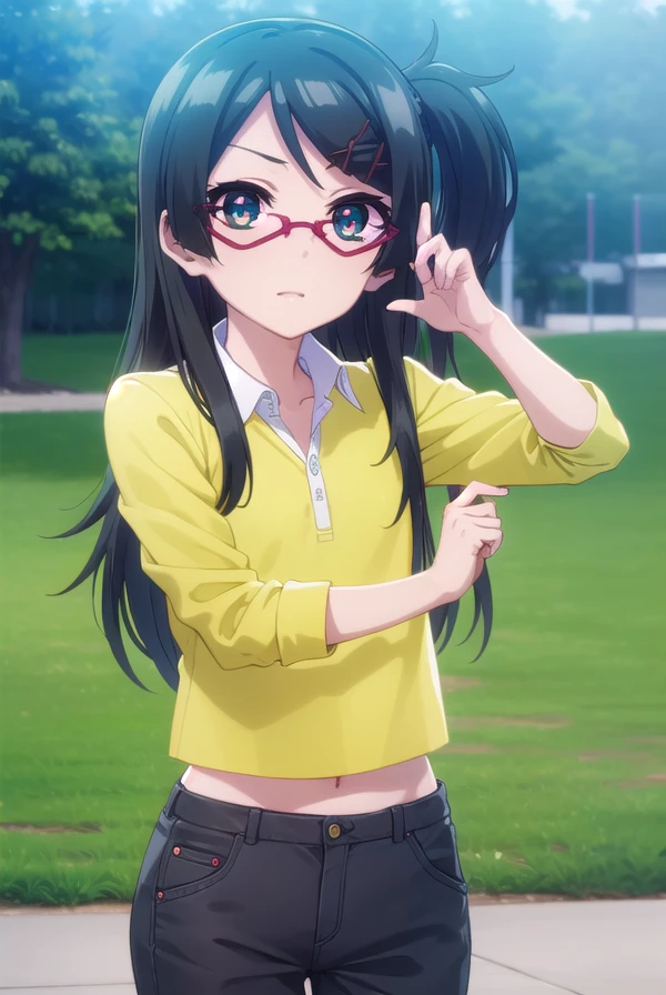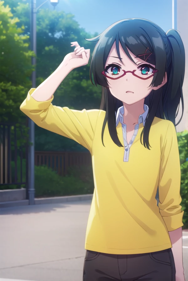 suzuka kurihara, long hair, black hair, hair ornament, (green eyes:1.3), glasses, hairclip, one side up, red-framed eyewear,