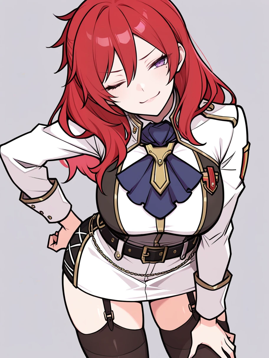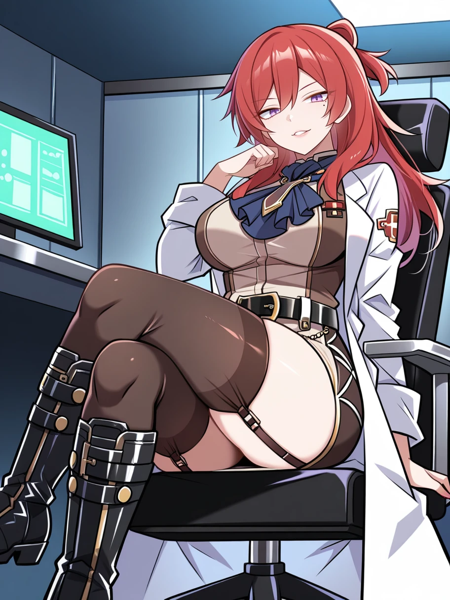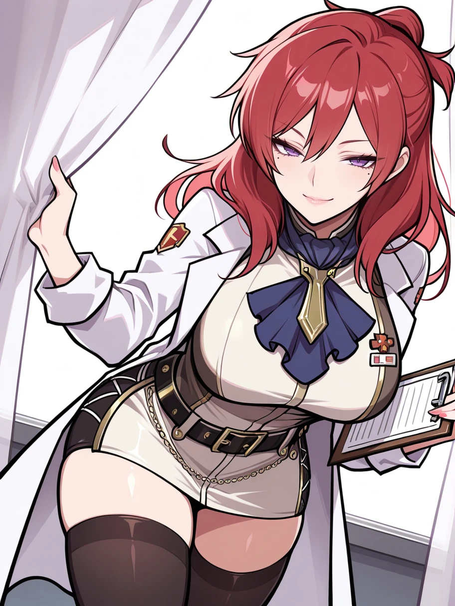 ge2lh_cld, red hair, long hair, purple eyes, mole under eye, blue ascot, large breasts, uniform, multicolored outfit, lab coat, badge, white pencil skirt, black belt, black thighhighs, garter straps, knee boots, black footwear