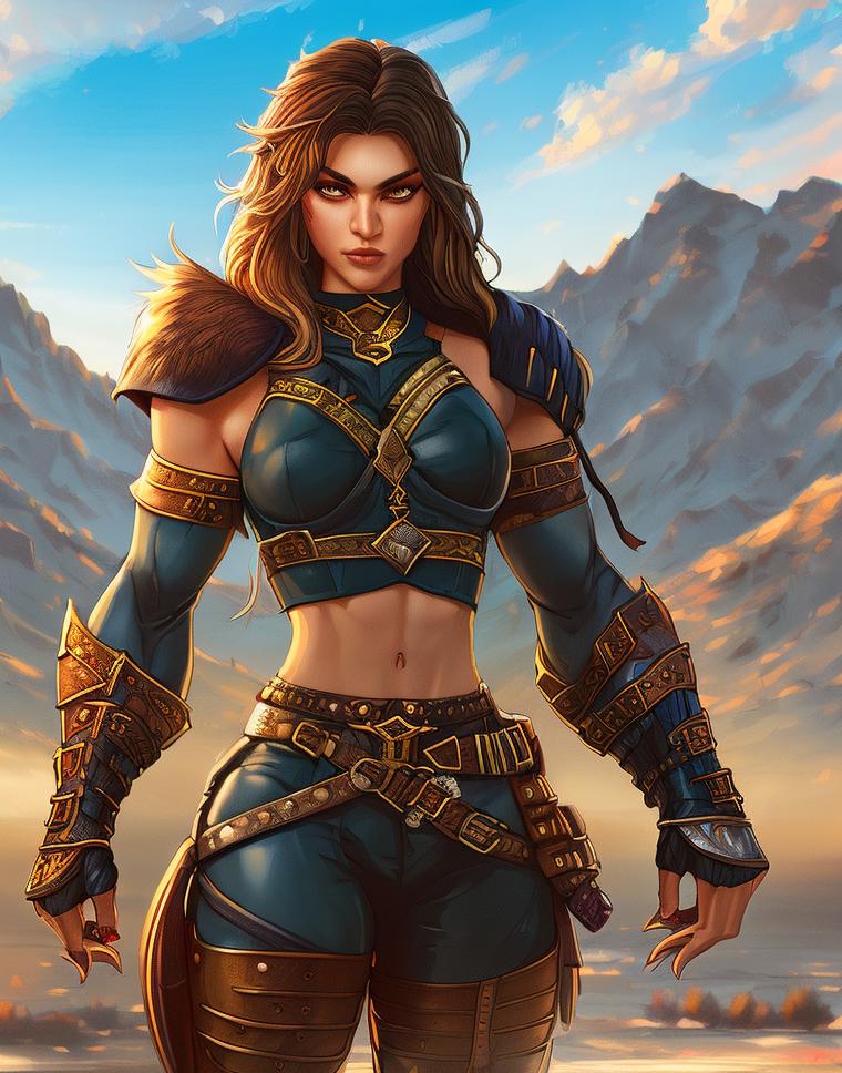 digital illustration, (young barbarian woman), leather pants, soldier, warrior, highly detailed, (abs, flat stomach, thicc:1.5) (muscular:1.5), (mountain background:1.3)