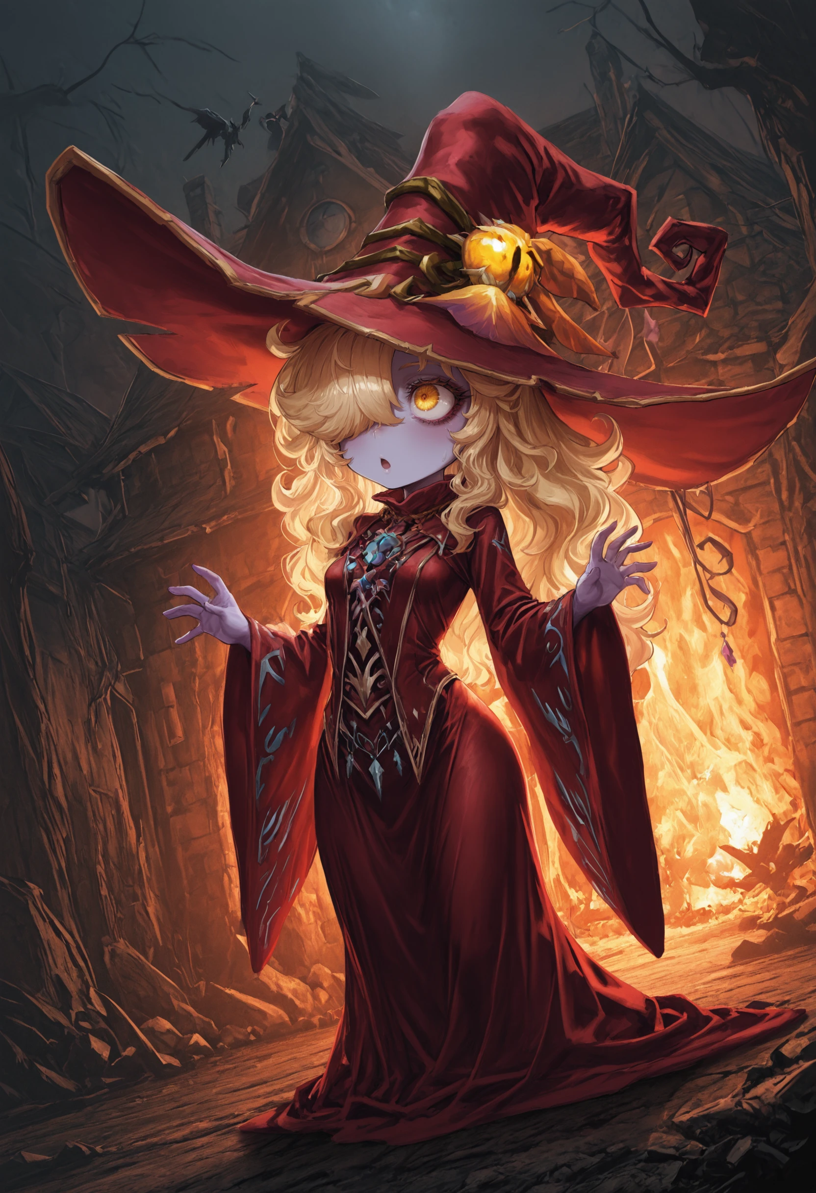mage \(summoners war\), coco \(summoners war\), hair over one eye, purple skin, witch hat, long hair, blonde hair, red headwear, shortstack, small breasts, yellow eyes, robe, red robe