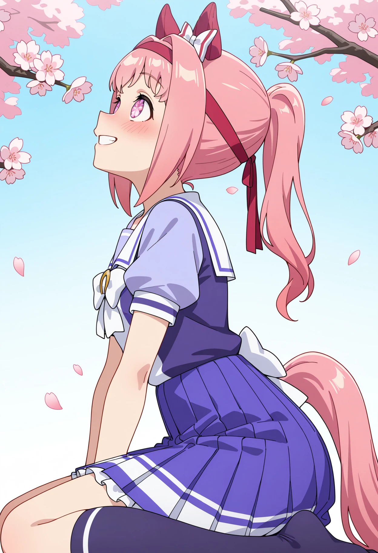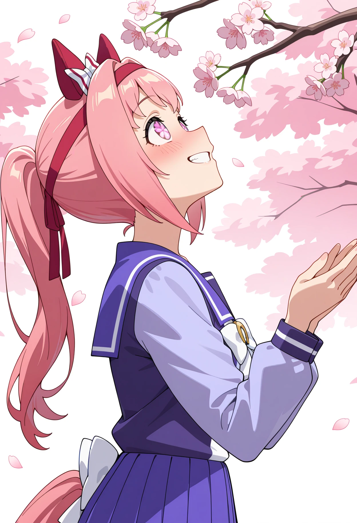 shiharuschool, long hair, pink hair, ponytail, blush, smile, grin, pink eyes, flower-shaped pupils, symbol in eye, animal ears, horse ears, ear covers, horse girl, horse tail, bowtie, red headband, hairband, purple shirt, white bow, purple skirt, school uniform, tracen school uniform, serafuku, sailor shirt, sailor collar, puffy short sleeves, long sleeves, tail through clothes,