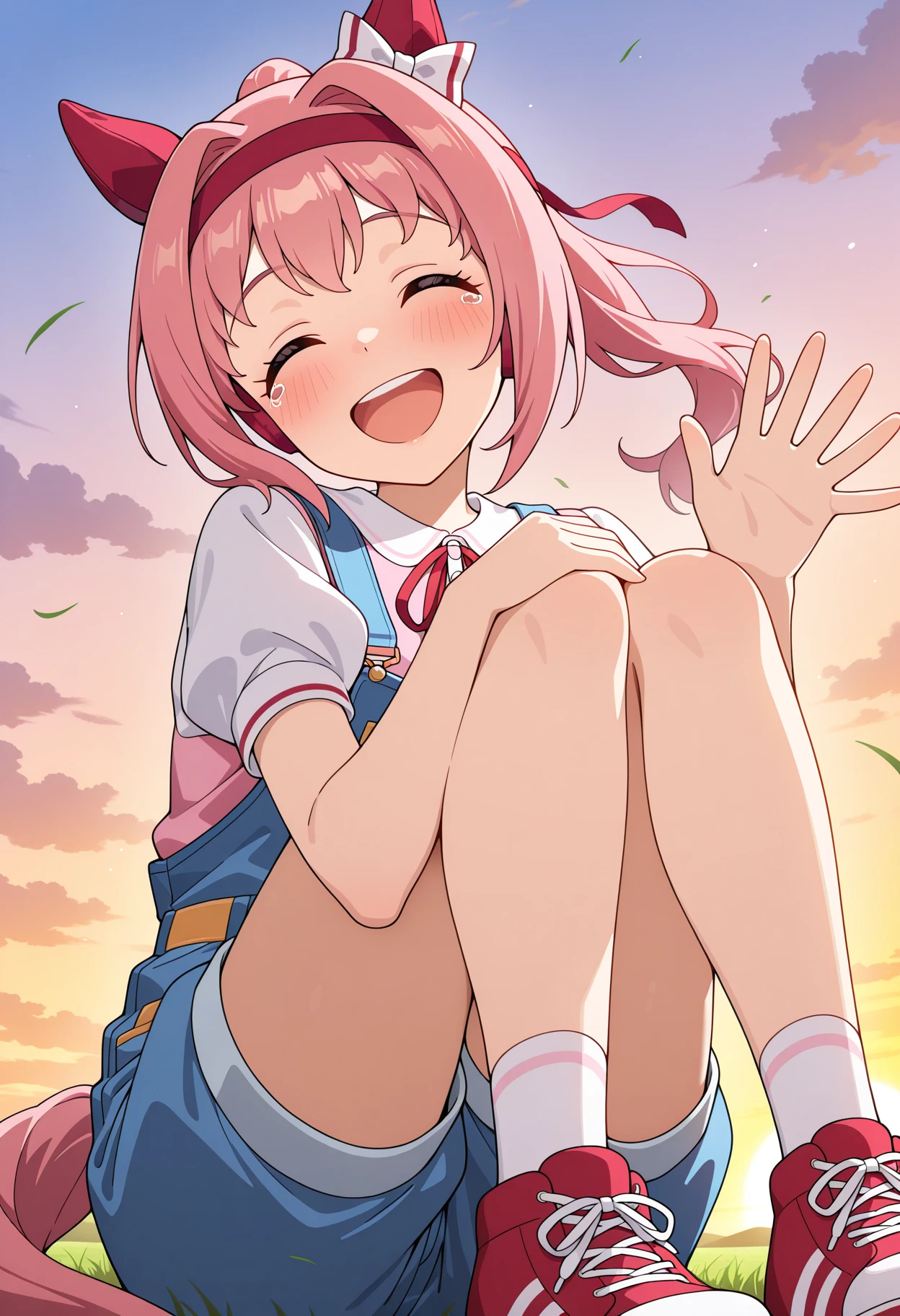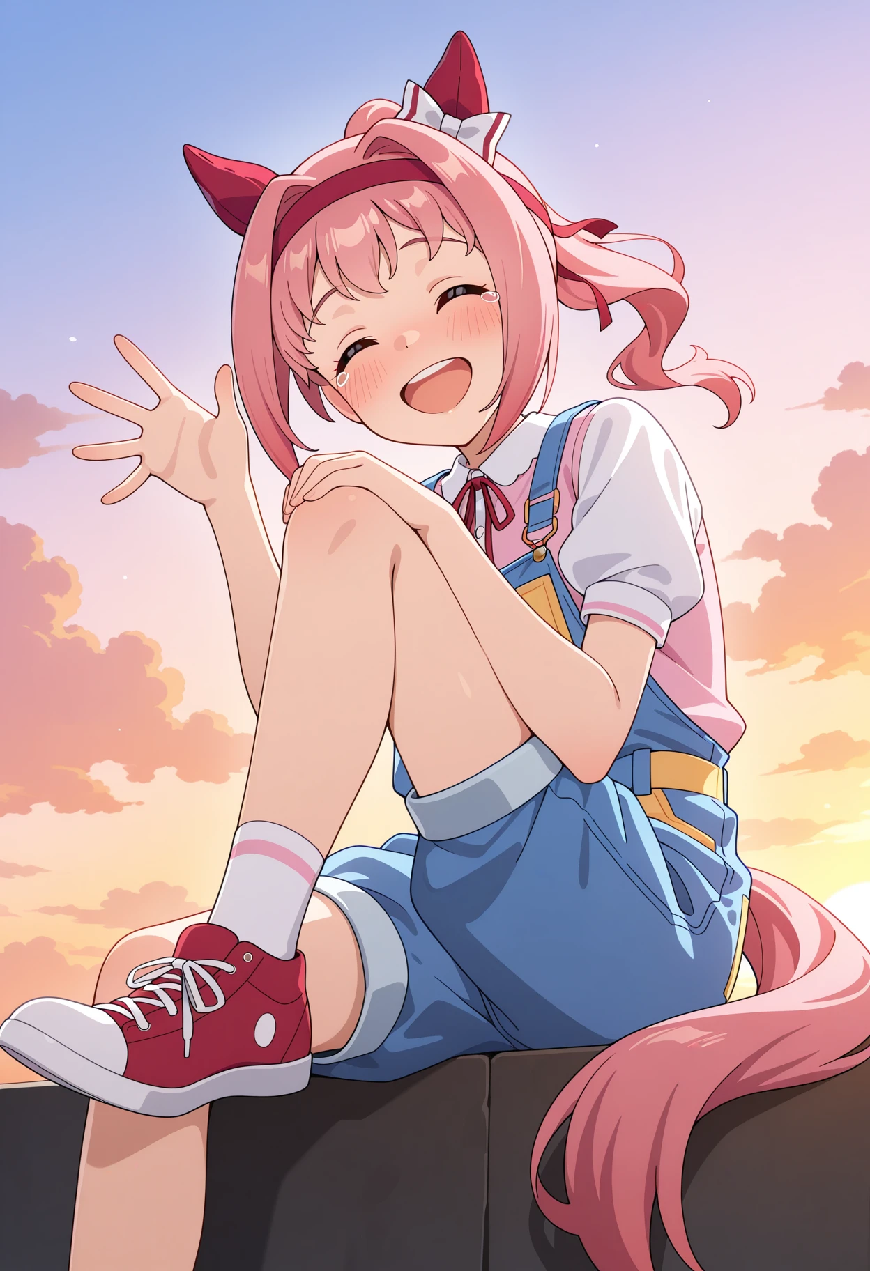 shiharucasual, long hair, pink hair, ponytail, hair intakes, animal ears, horse ears, horse tail, ear covers, ear bow, hairband, headband, red ribbon, neck ribbon, white bow, white shirt, pink shirt, collared shirt, puffy short sleeves, blue overalls, overall shorts, white socks, shoes, sneakers, red footwear,