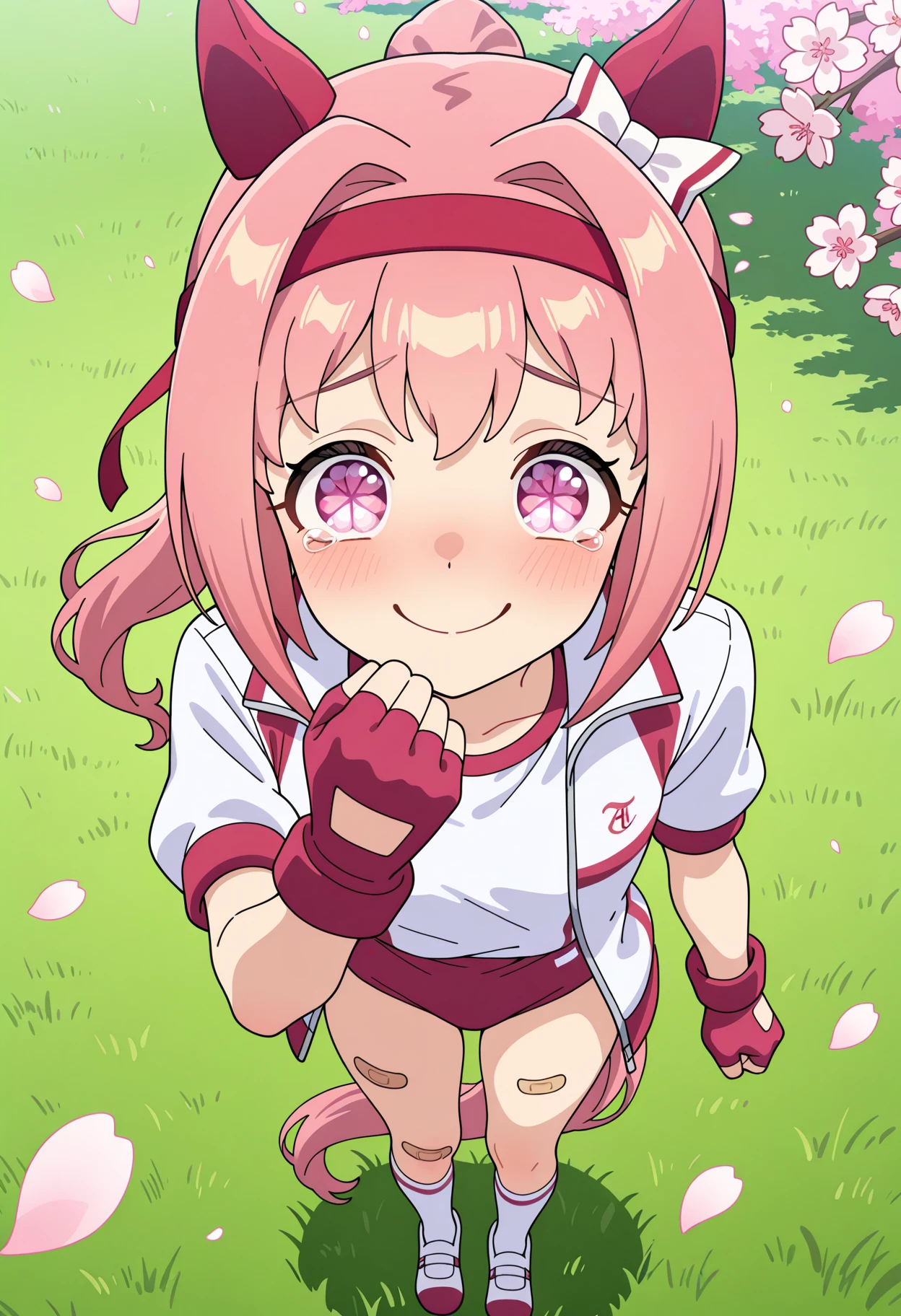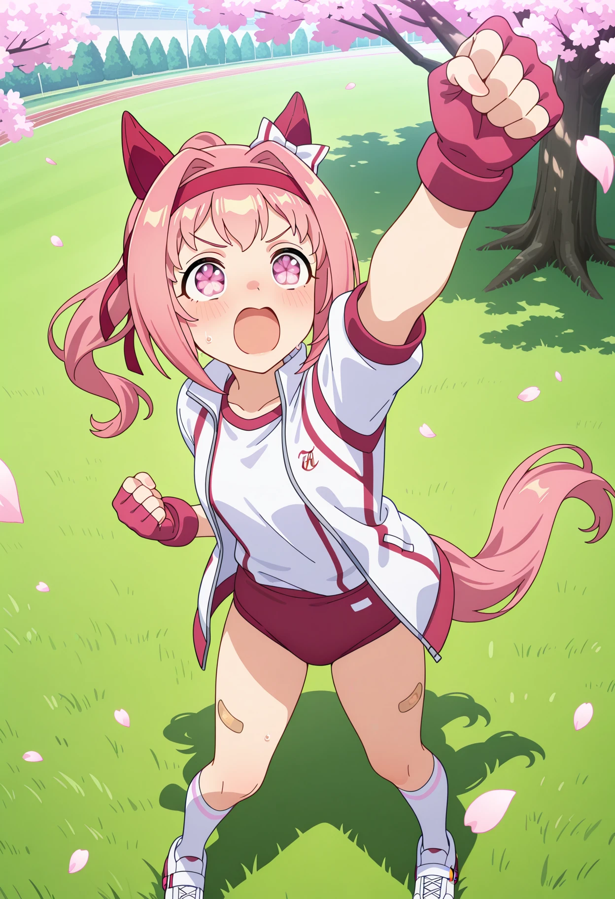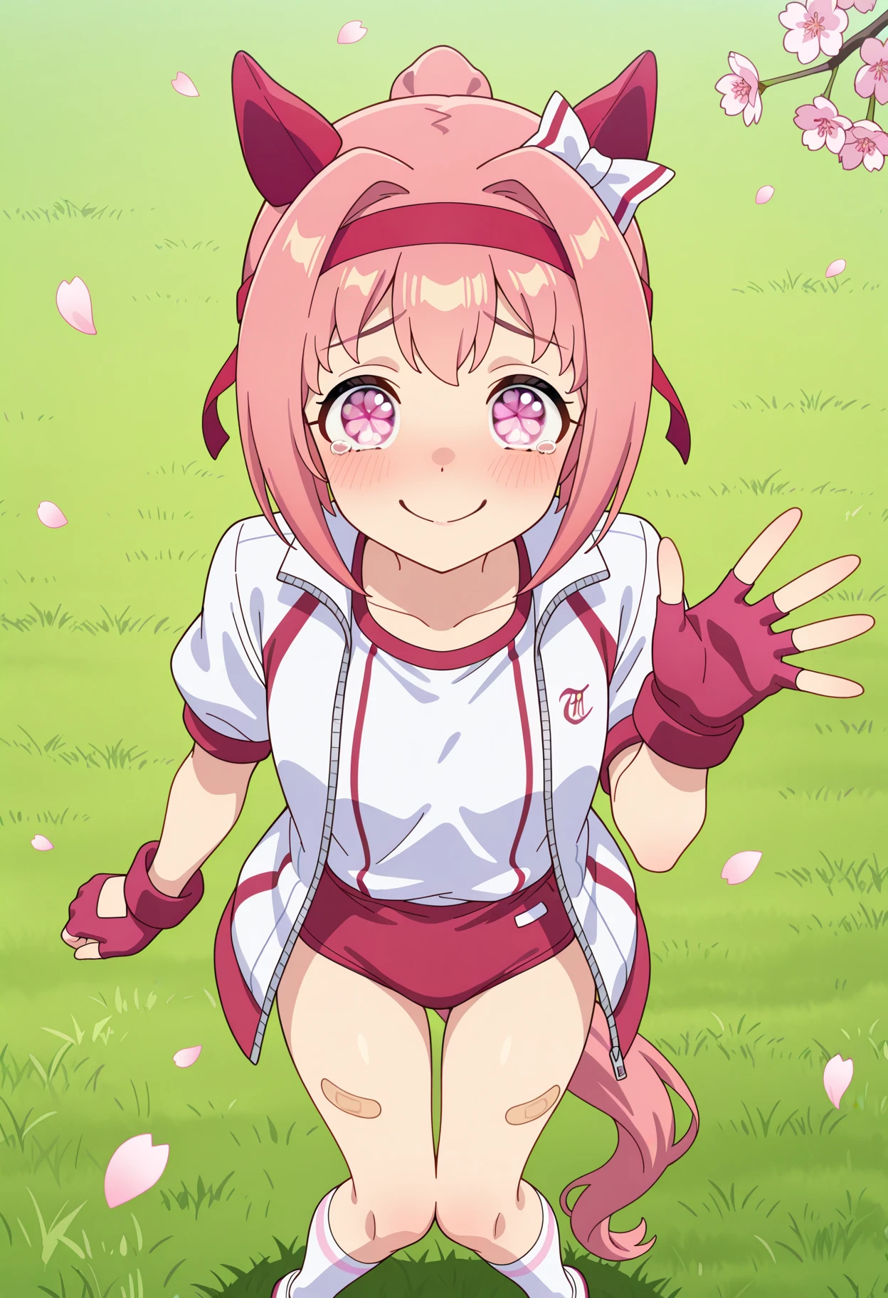 shiharugym, long hair, pink hair, ponytail, hair intakes, hair bow, red headband, horse girl, animal ears, horse ears, ear covers, pink eyes, symbol-shaped pupils, flower-shaped pupils, flower in eye, white shirt, short sleeves, long sleeves, open clothes, white jacket, track jacket, open jacket, bow, ribbon, gym uniform, fingerless gloves, pink gloves, red gloves, red buruma, thighs, kneehighs, white socks, shoes, white footwear, horse tail, tail through clothes,