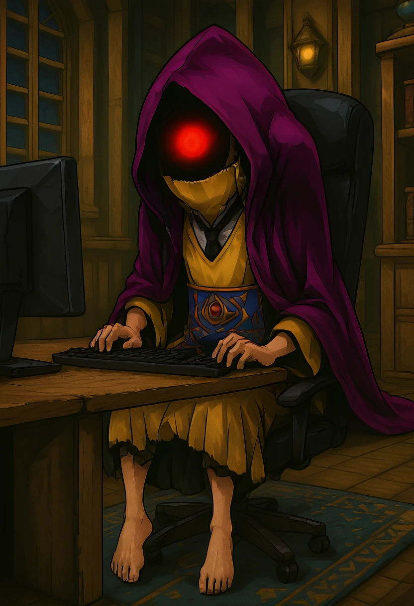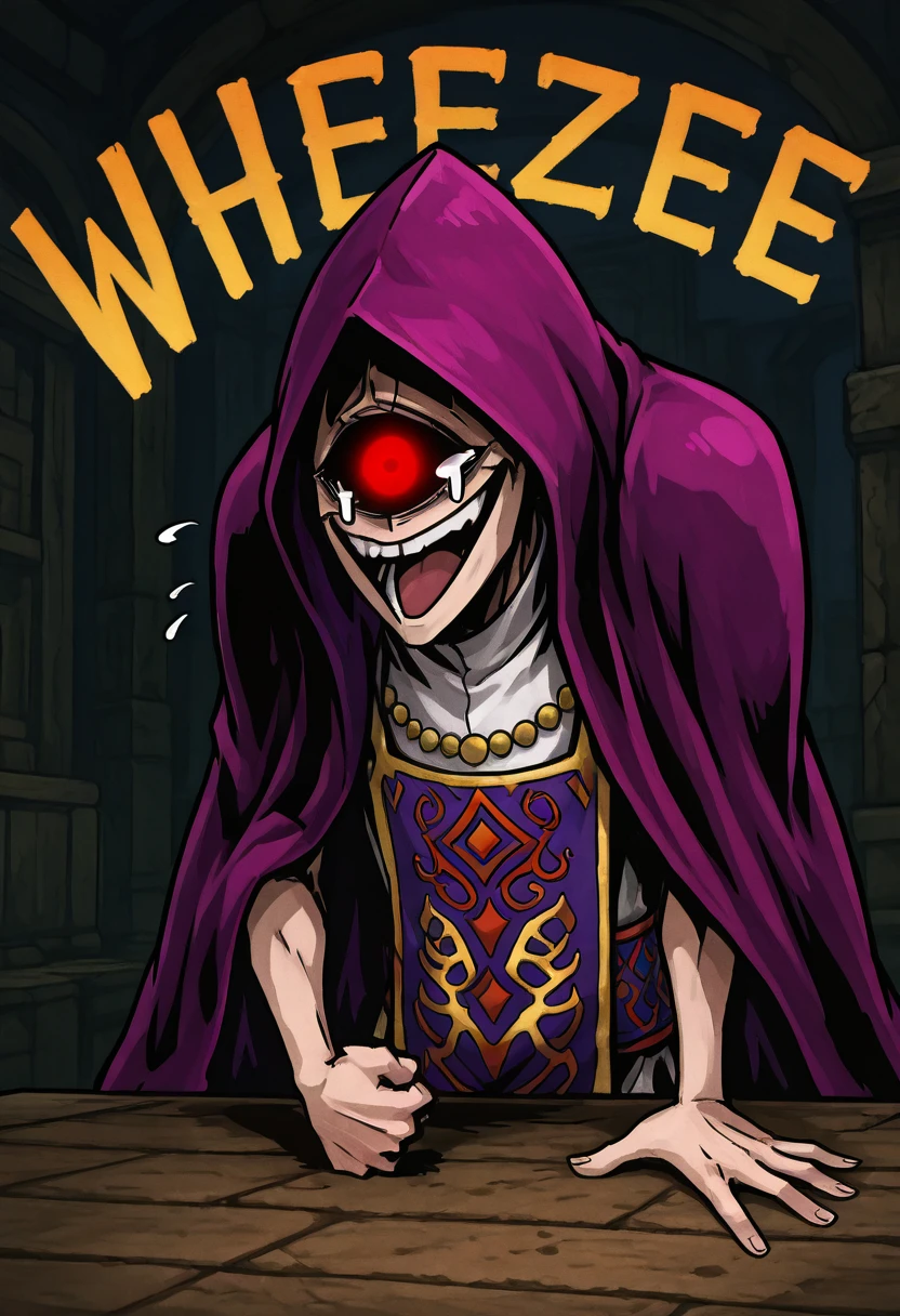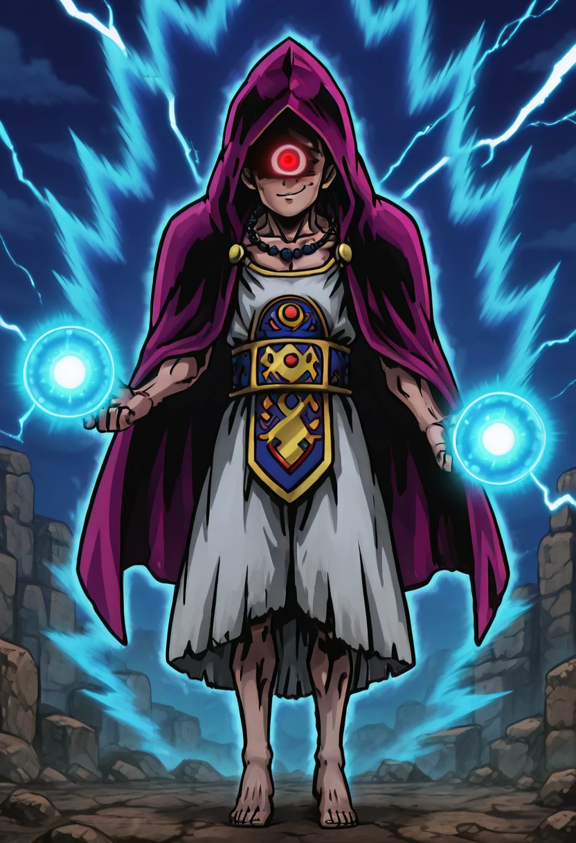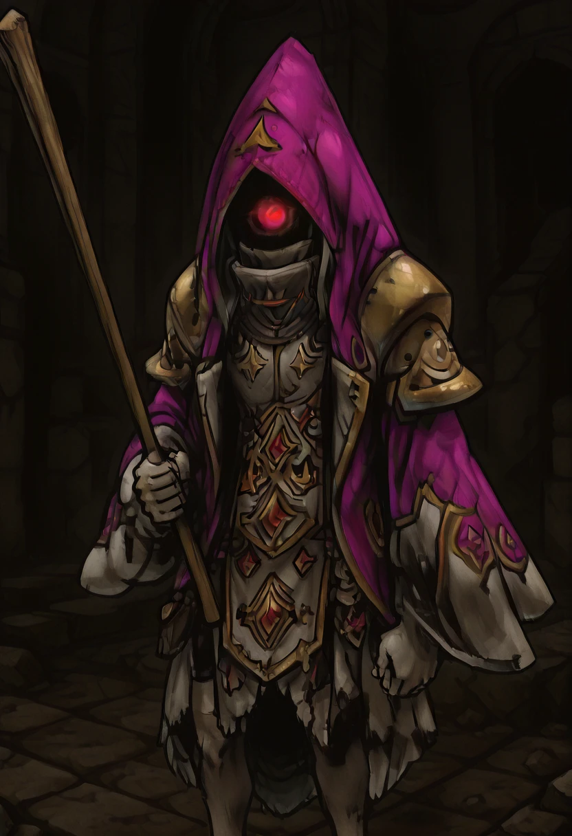 zzP03Collector, one-eyed, red eyes, glowing eye, hooded cloak,