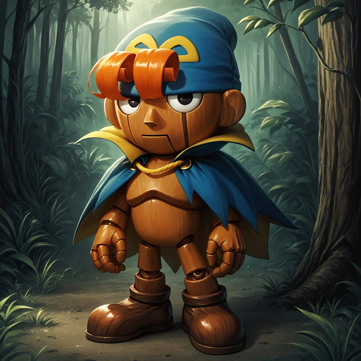 Illustrious tags: genomario, 1boy, solo, full body, puppet, blue cape, blue hat, joints, doll joints, dark skin, black eyes, orange hair, shoes