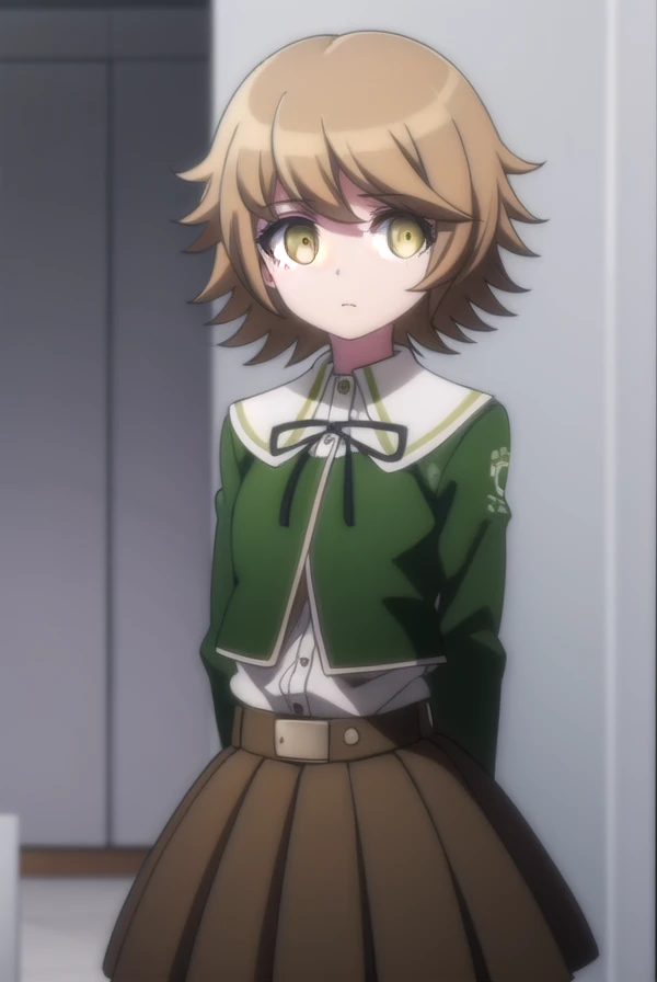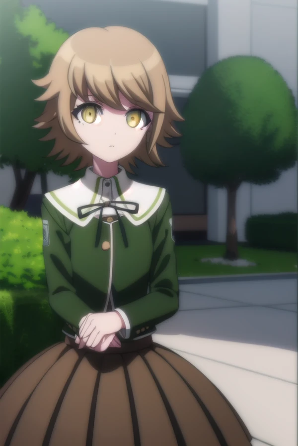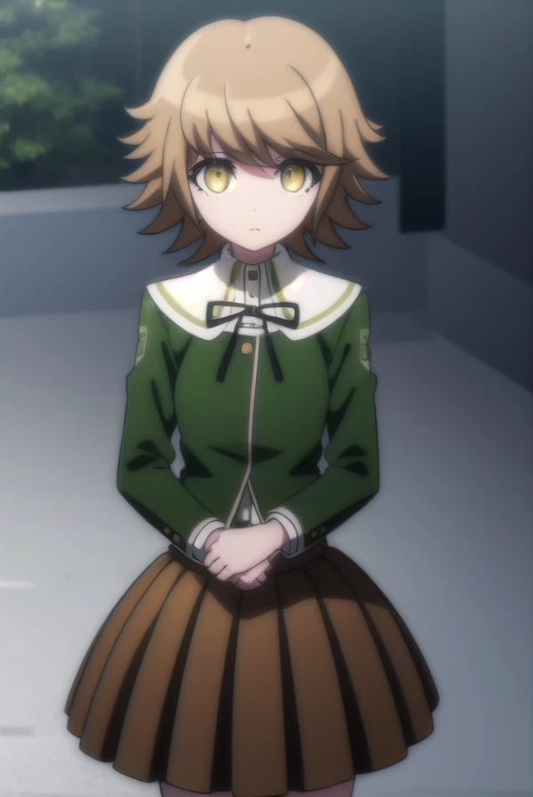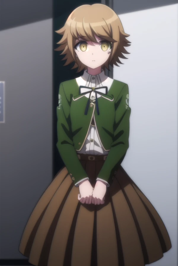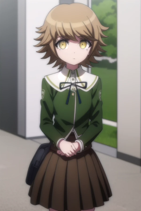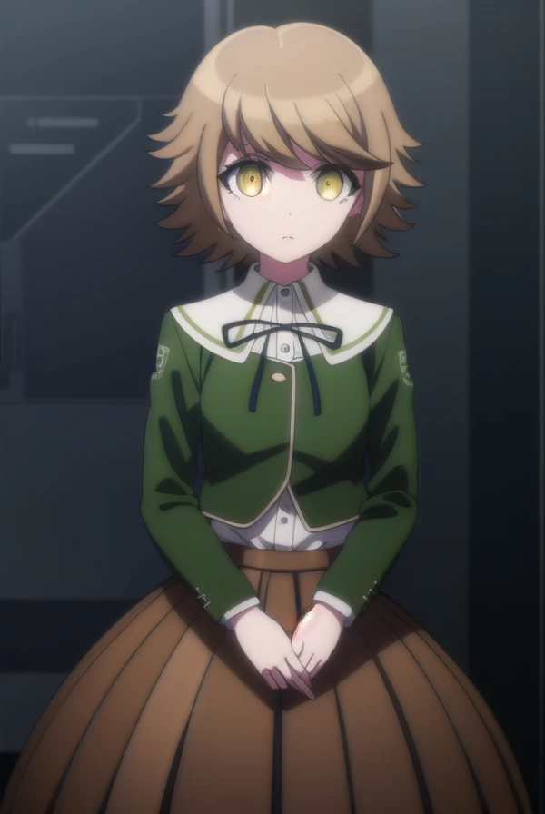 skirt, shirt, long sleeves, ribbon, school uniform, jacket, pleated skirt, black ribbon, neck ribbon, brown skirt, green jacket,