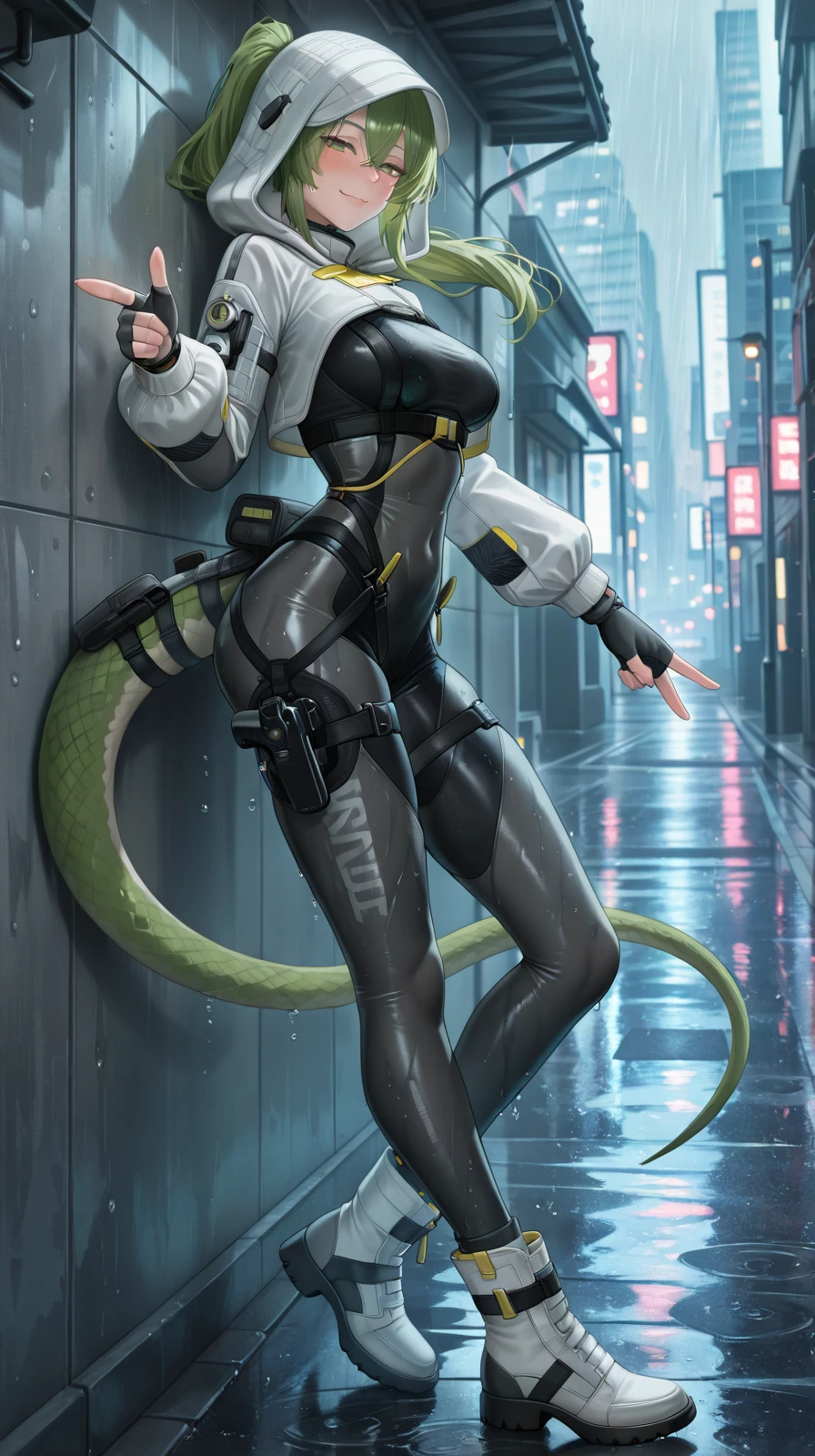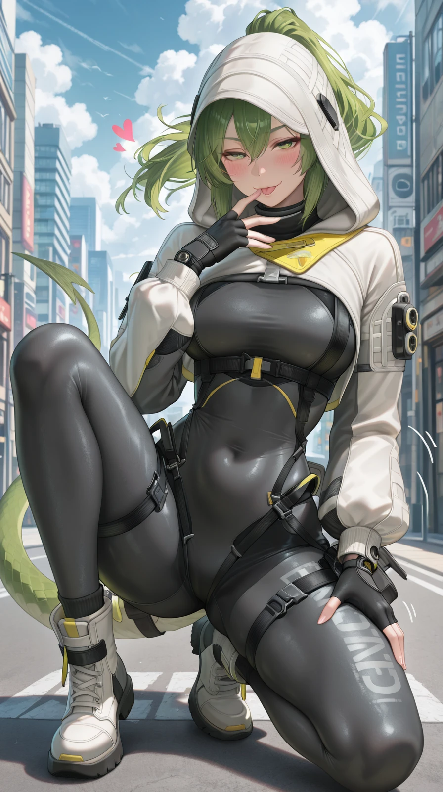 Fluorite, green hair, ponytail, hair between eyes, green eyes, hood, crop jacket, white jacket, puffy sleeves, yellow accents, black fingerless gloves, grey skintight, textured , chest harness, hip harness, thigh straps, holsters, tail pouch, green tail, tail pouch, white footwear, ankle boots,