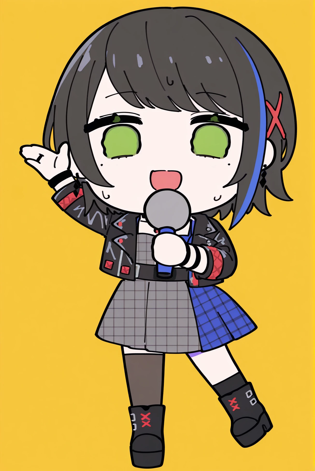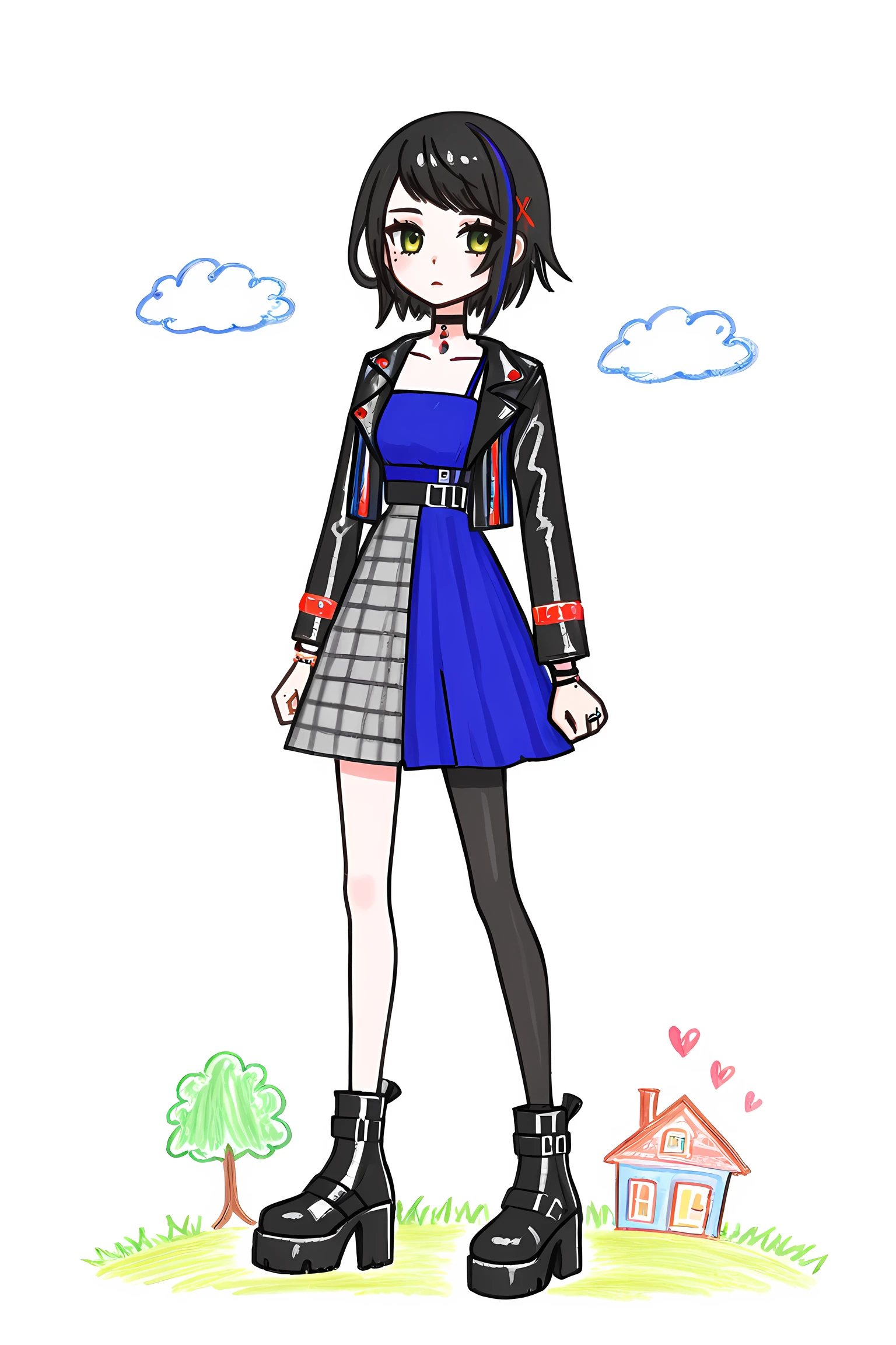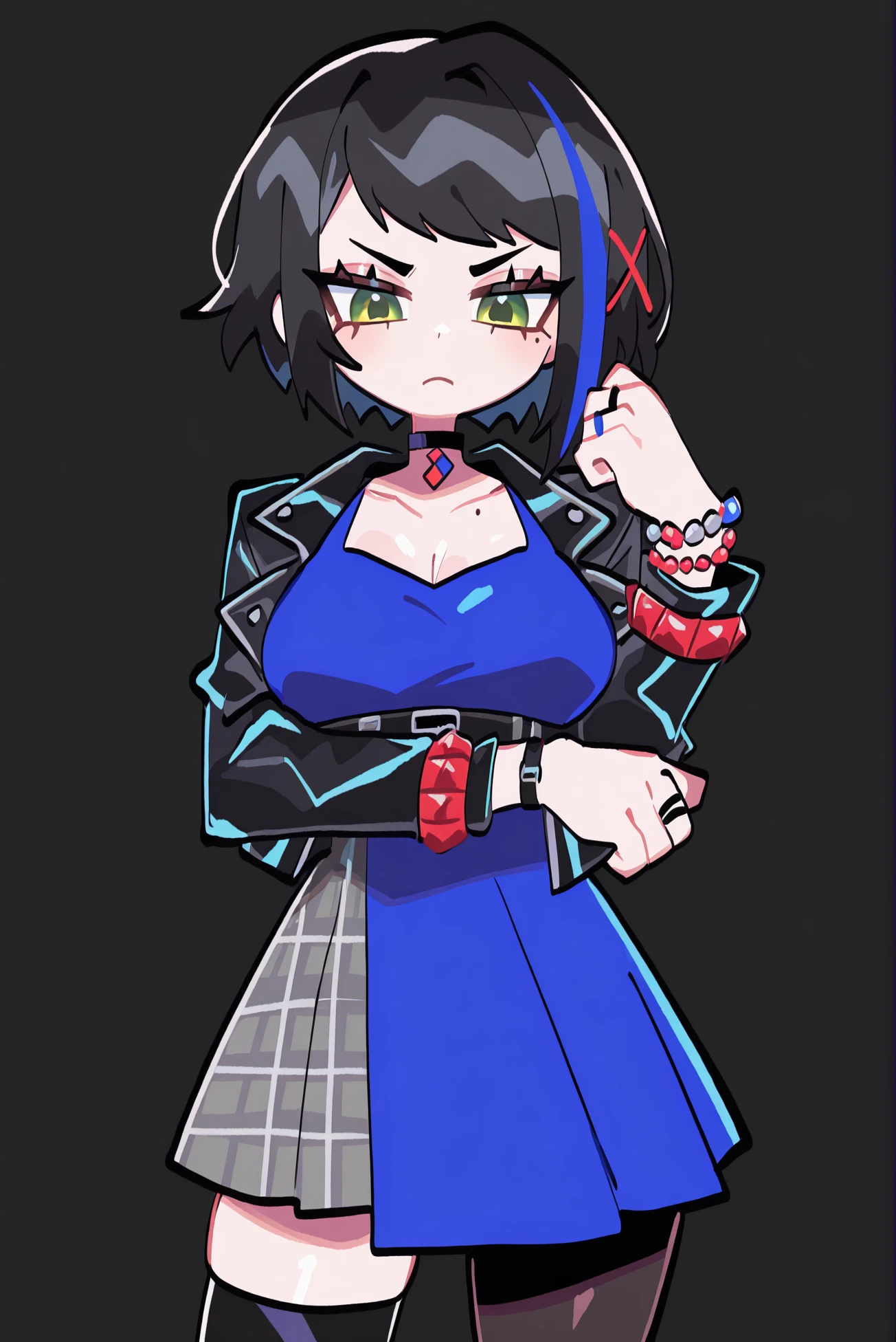 setomitsuki, green eyes, black hair, short hair, black hair, blue hair, streaked hair, swept bangs, x hair ornament, mole, mole under eye, black choker, jacket, black jacket, blue dress, multicolored dress, grey dress, long sleeves, open clothes, collarbone, underbust, black belt, black ring, bracelet, leather jacket, plaid, uneven legwear, single leg pantyhose, single thighhigh, black thighhighs, zettai ryouiki, black pantyhose, ankle boots, platform boots, high heels