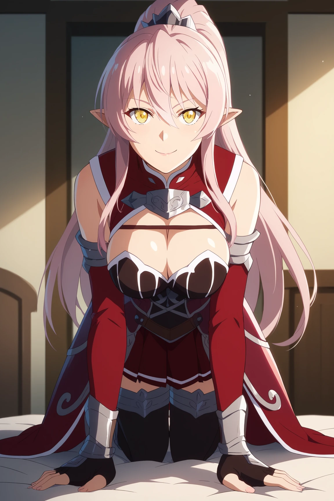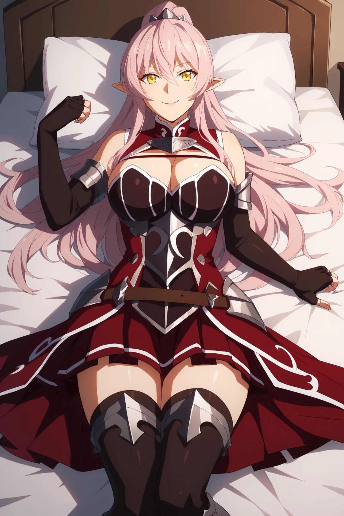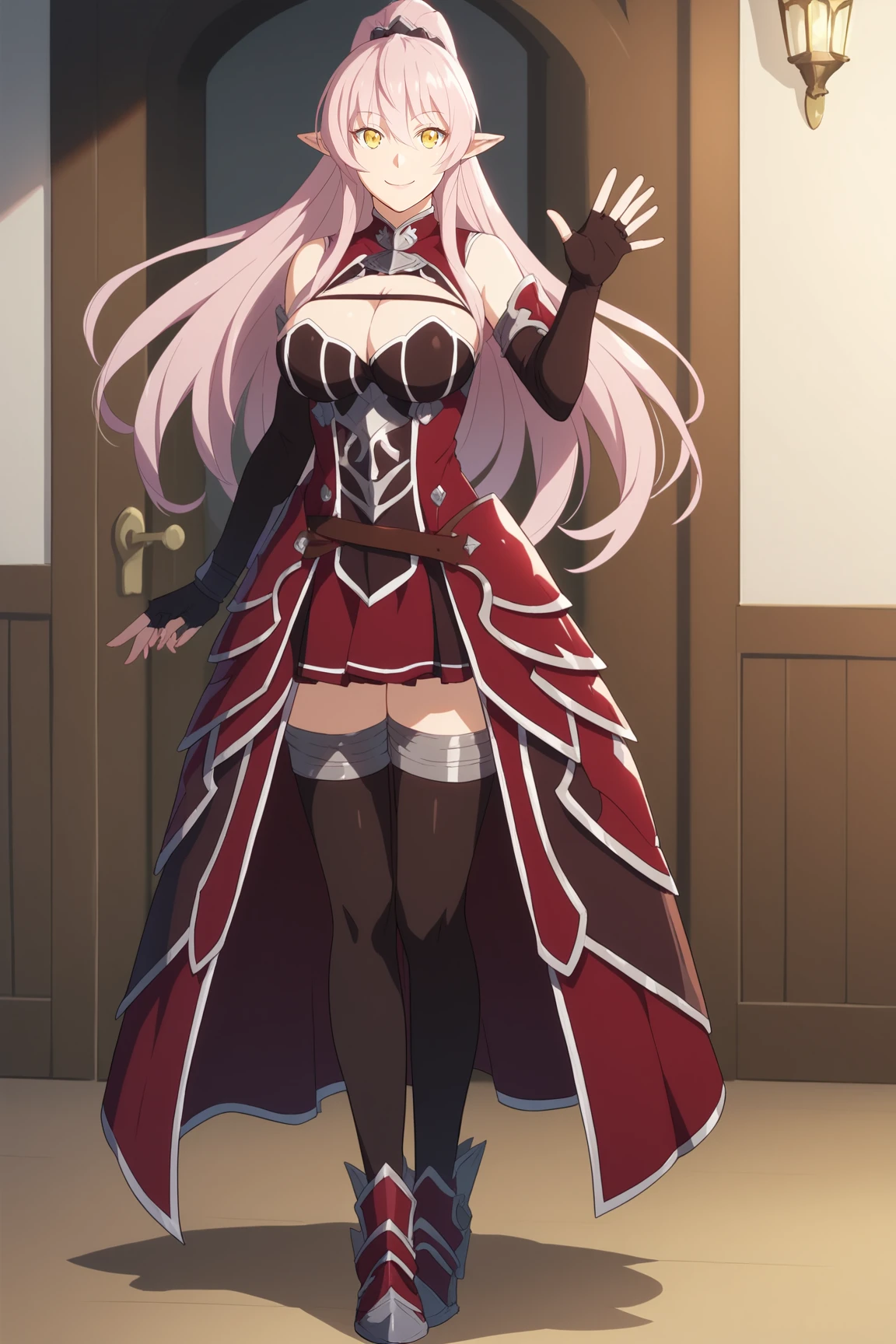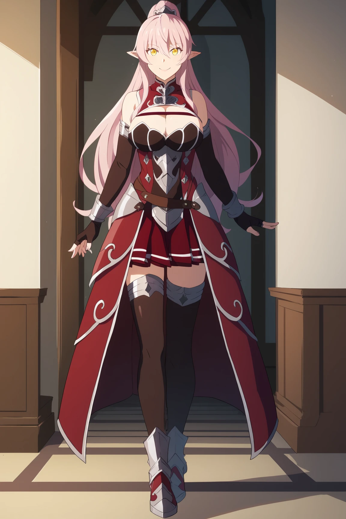ArianeGlenysMapleSKAXL, yellow eyes, pink hair, long hair, high ponytail, hair between eyes, long sidelocks, pointy ears, large breasts, detached sleeves, red dress, brown corset, cleavage cutout, bridal guantlets, black elblow gloves, fingerless gloves, red skirt, pleated skirt, black thighhighs, red armored boots