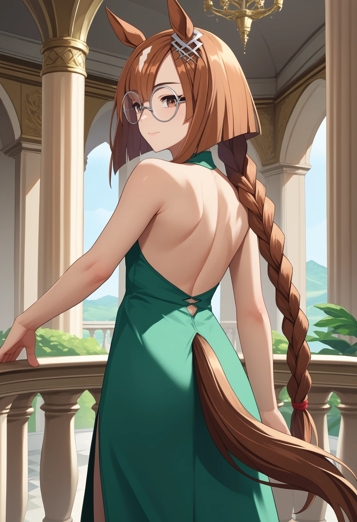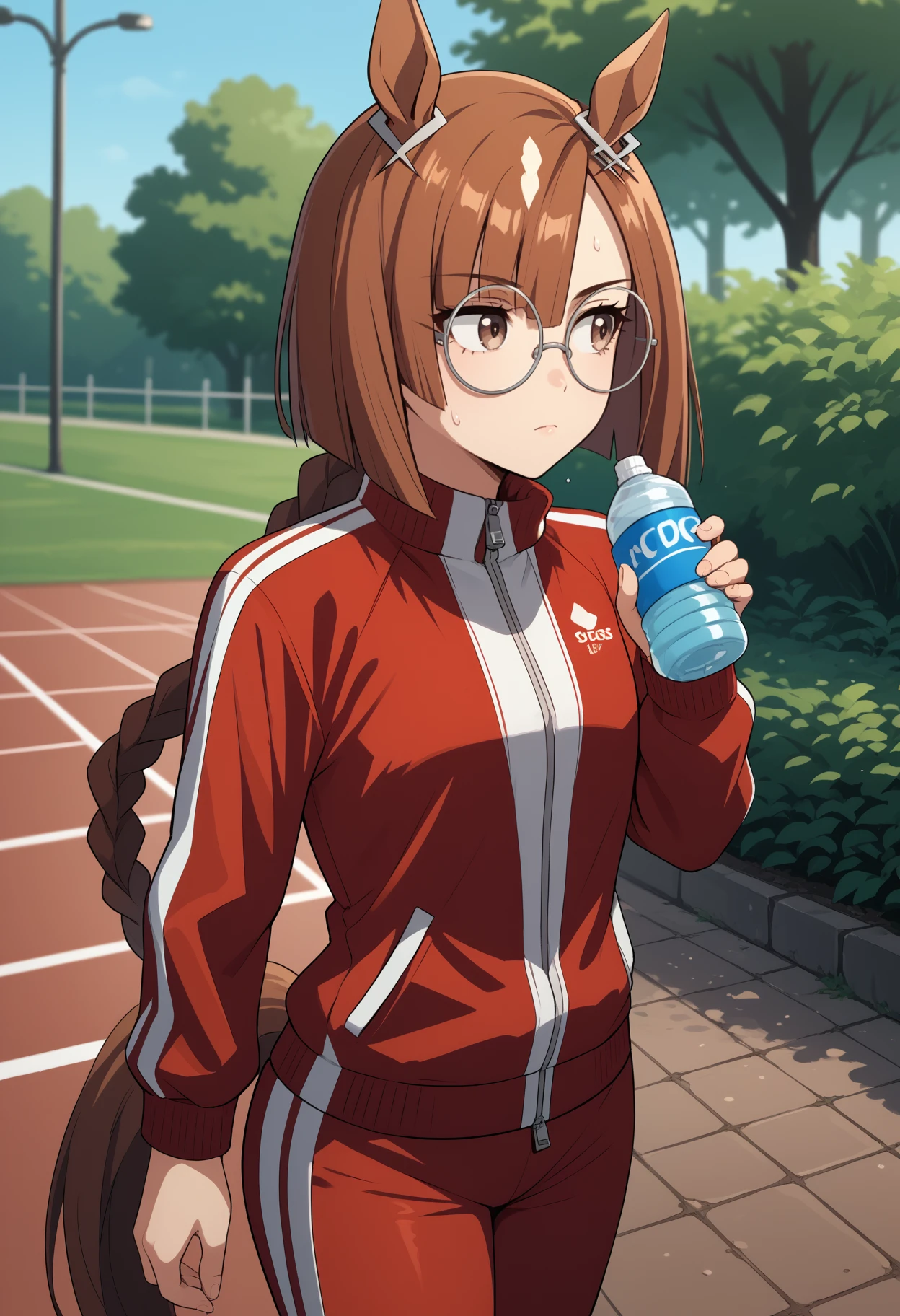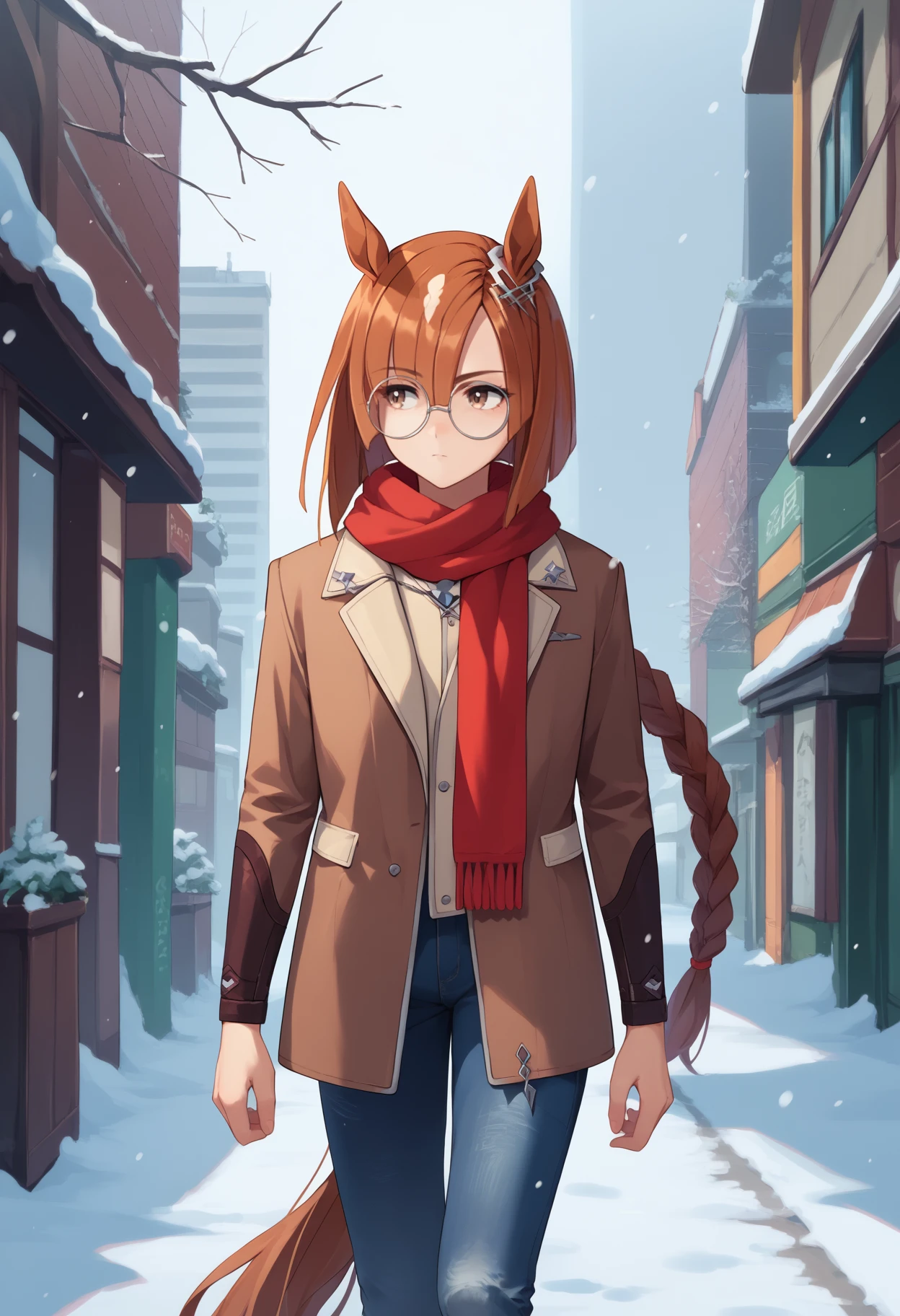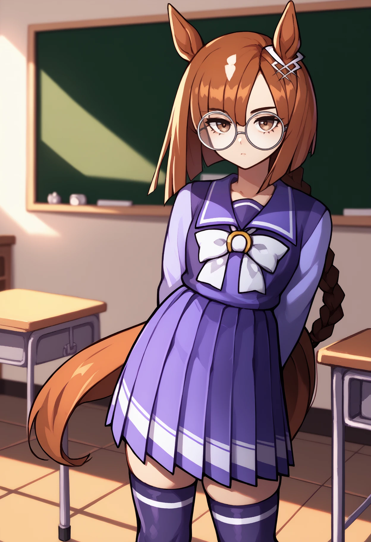 Trigger + Appearance: ikuno dictus, horse tail, long hair, multicolored hair, brown hair, asymmetrical bangs, braided ponytail, single braid, animal ears, ear ornament, brown eyes