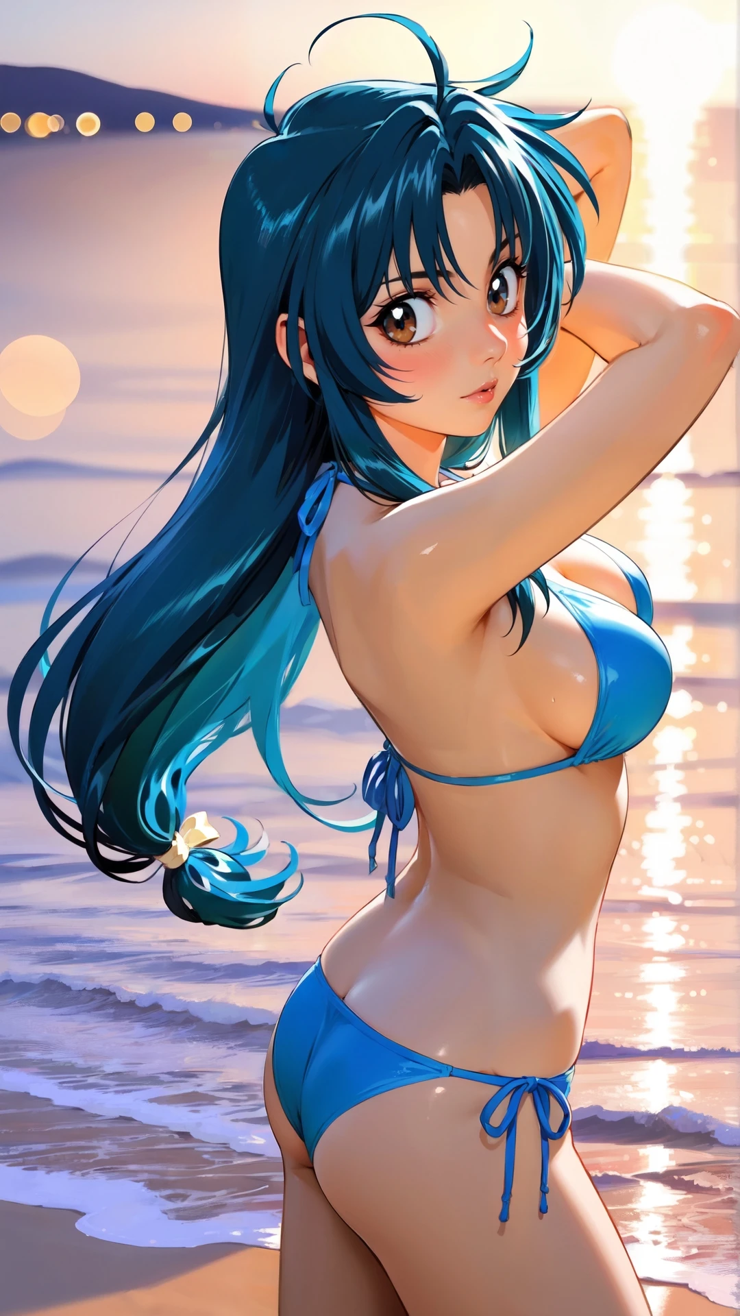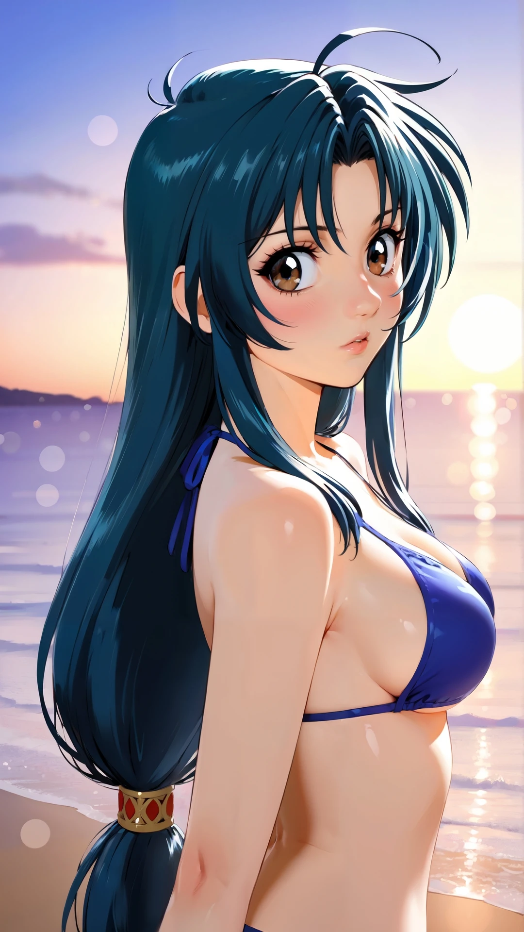 chidori_kaname, an anime girl, 1girl, solo, long hair, breasts, brown eyes, blue hair, swimsuit, bikini, outdoors, day, beach