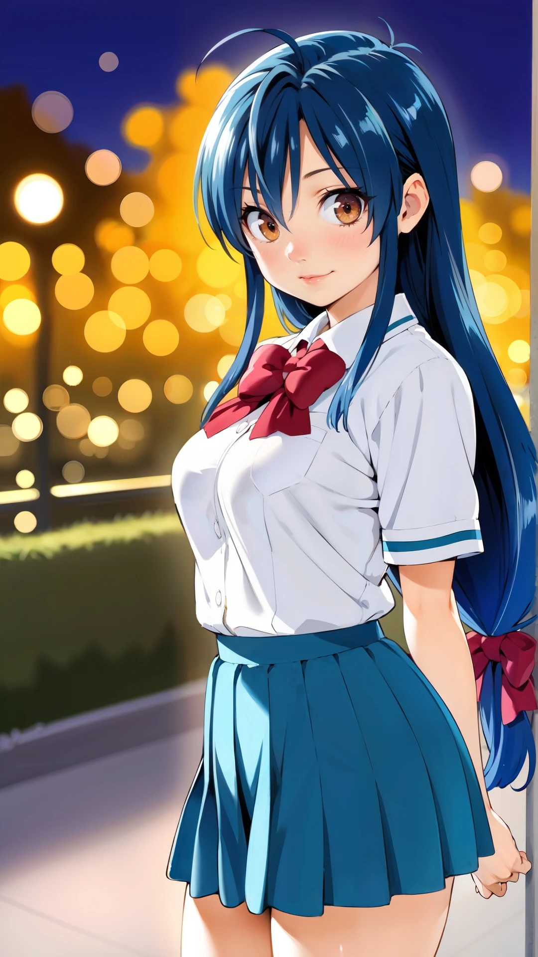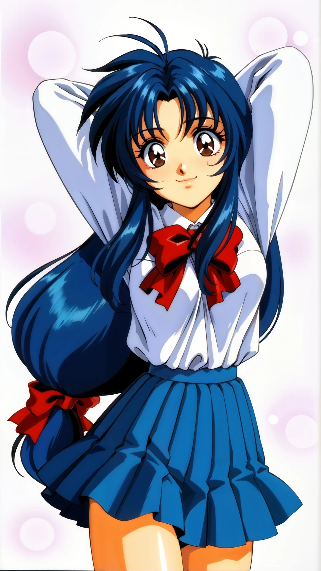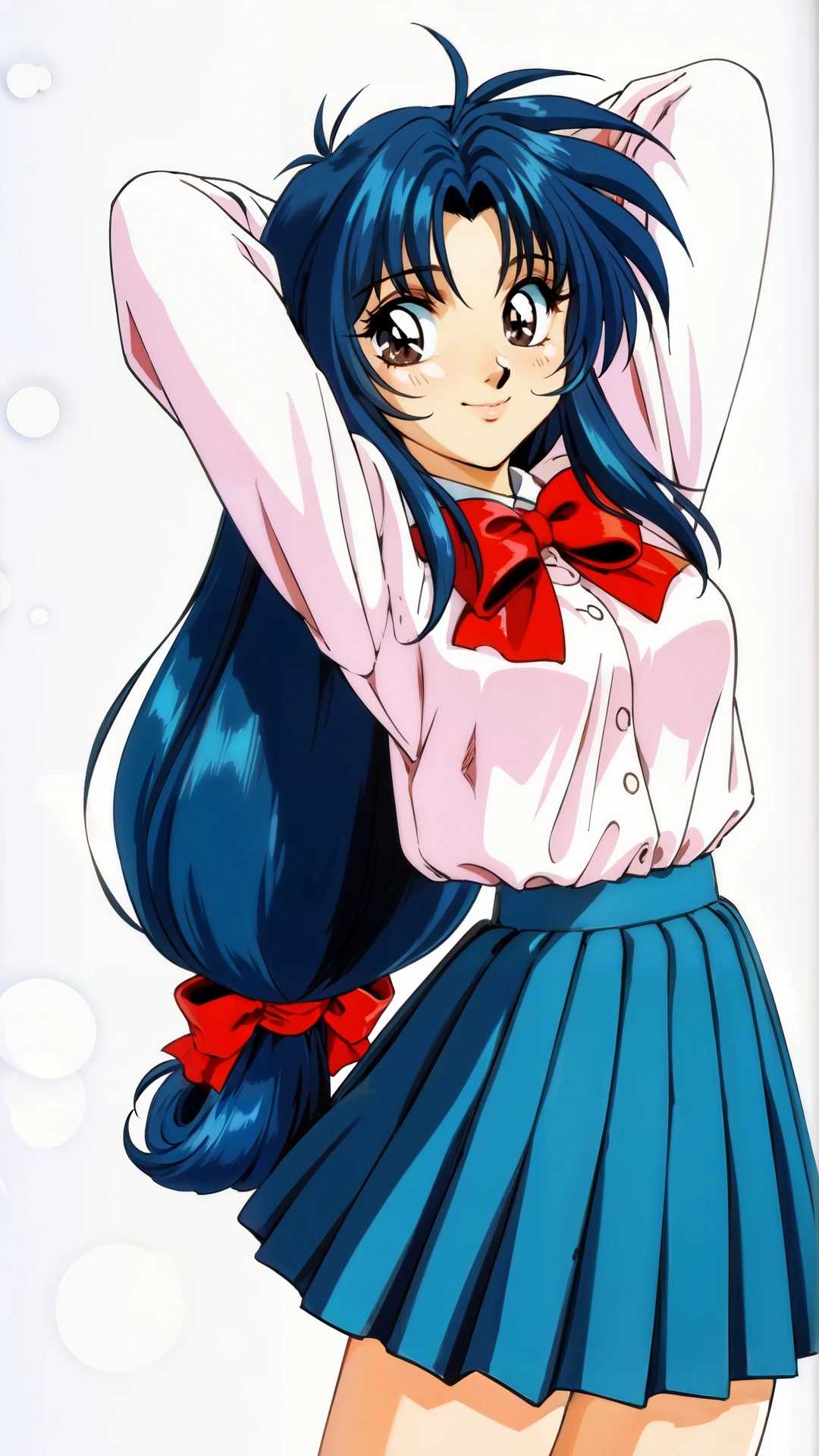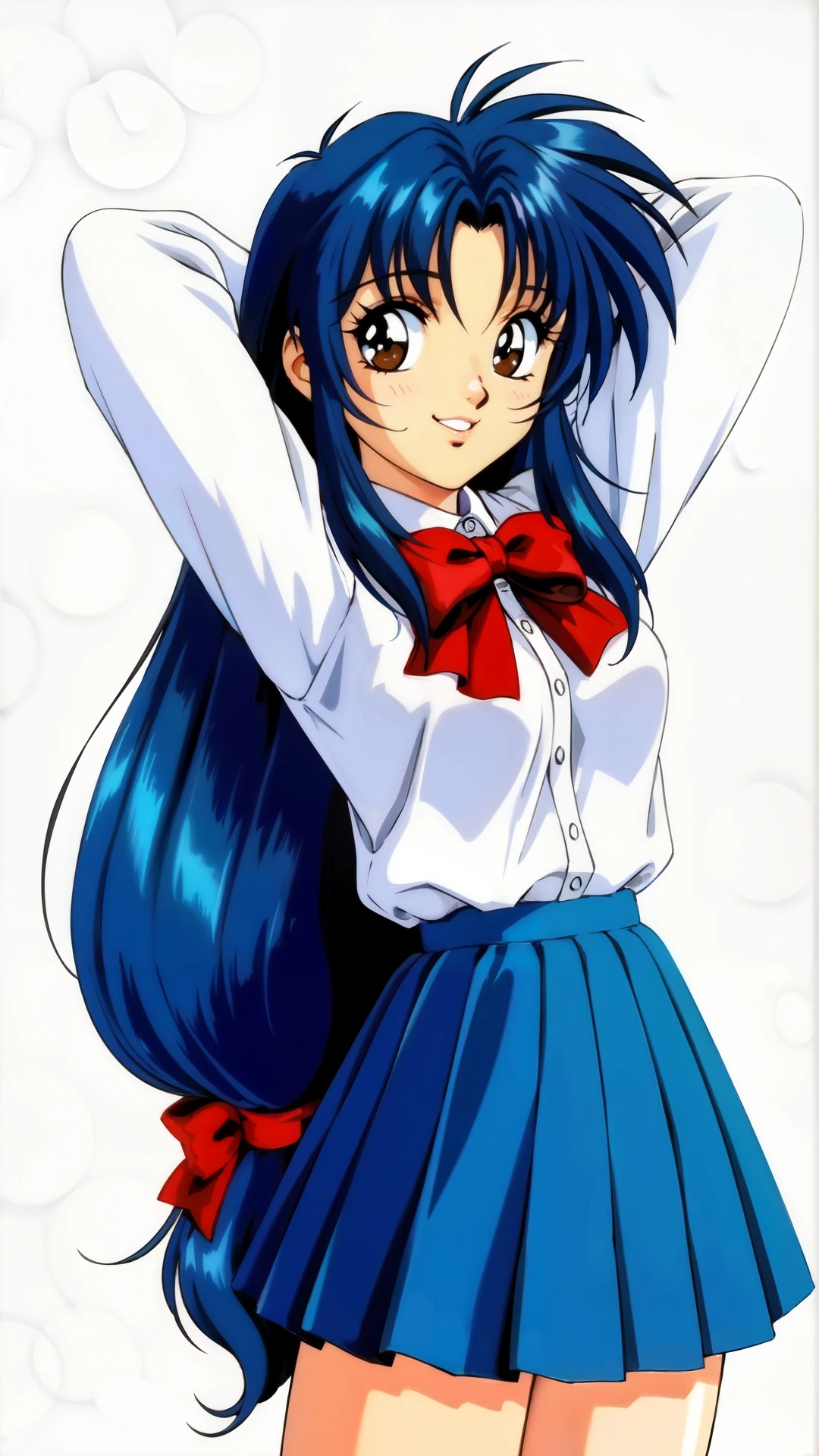 chidori_kaname, an anime girl, 1girl, solo, long hair, looking at viewer, smile, skirt, simple background, long sleeves, white background, bow, ribbon, brown eyes, school uniform, blue hair, pleated skirt, red bow, arms up, arms behind head, low-tied long hair, retro artstyle, 1990s (style)