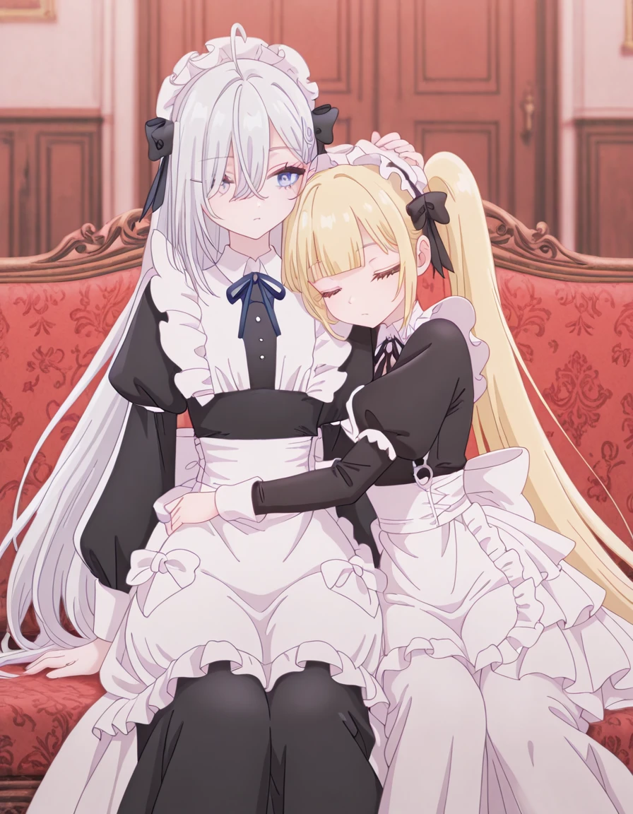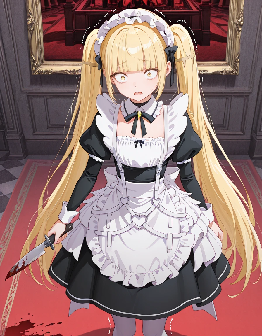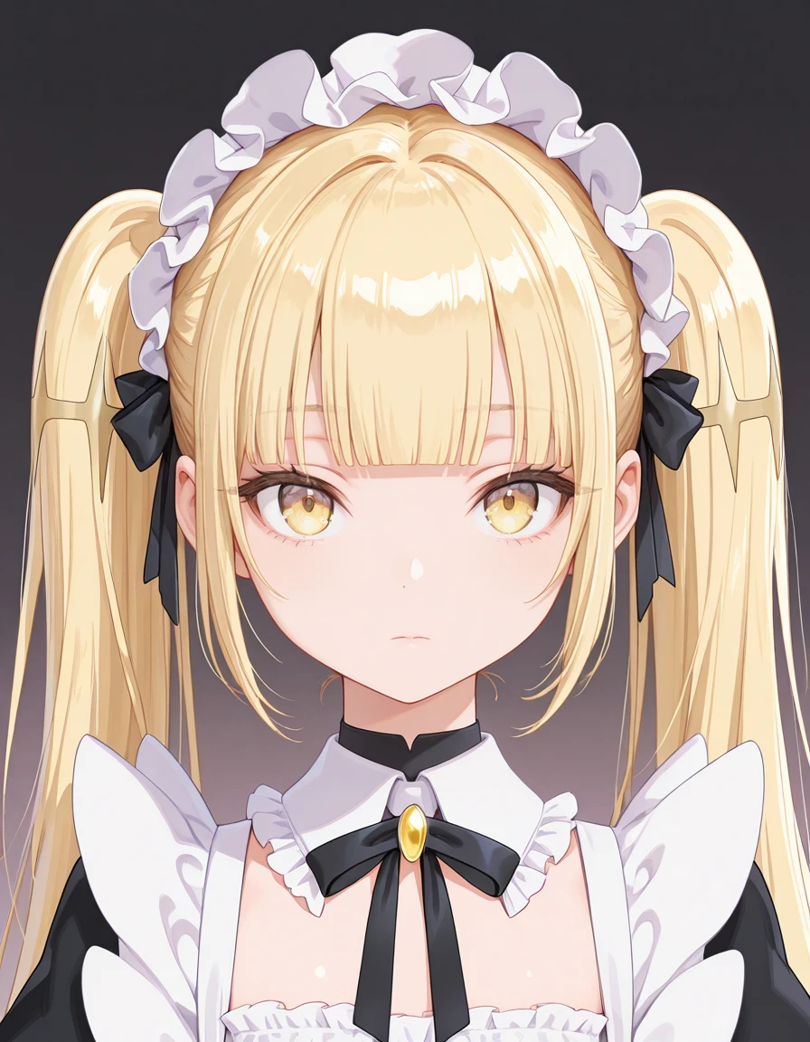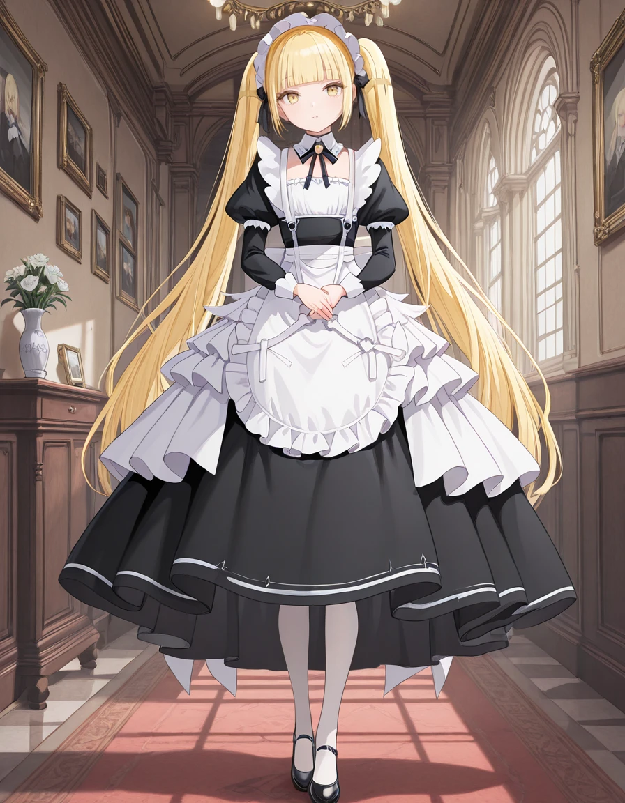<lora:kinko-shiboyugi_s1-v2-ixl-anime-soralz:1>, kinko (shiboyugi), very long hair, blonde hair, twintails, blunt bangs, sidelocks, yellow eyesOutfit - Maid