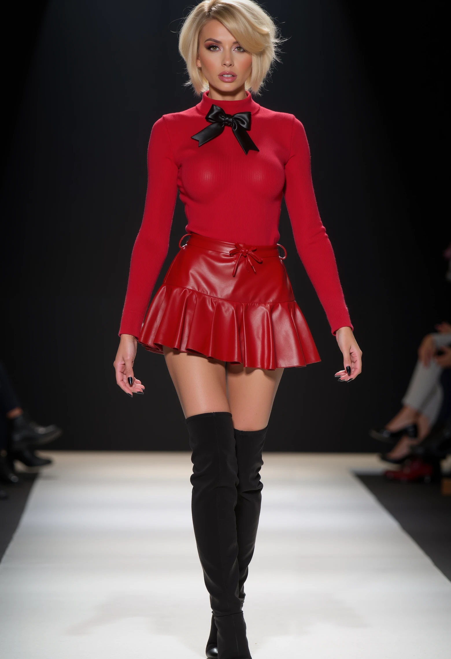 clo024, beige ribbed sweater with a black bow detail, tiered black faux leather mini skirt and knee-high black boots