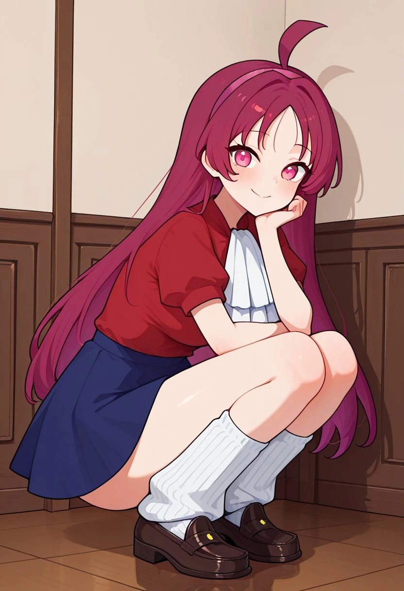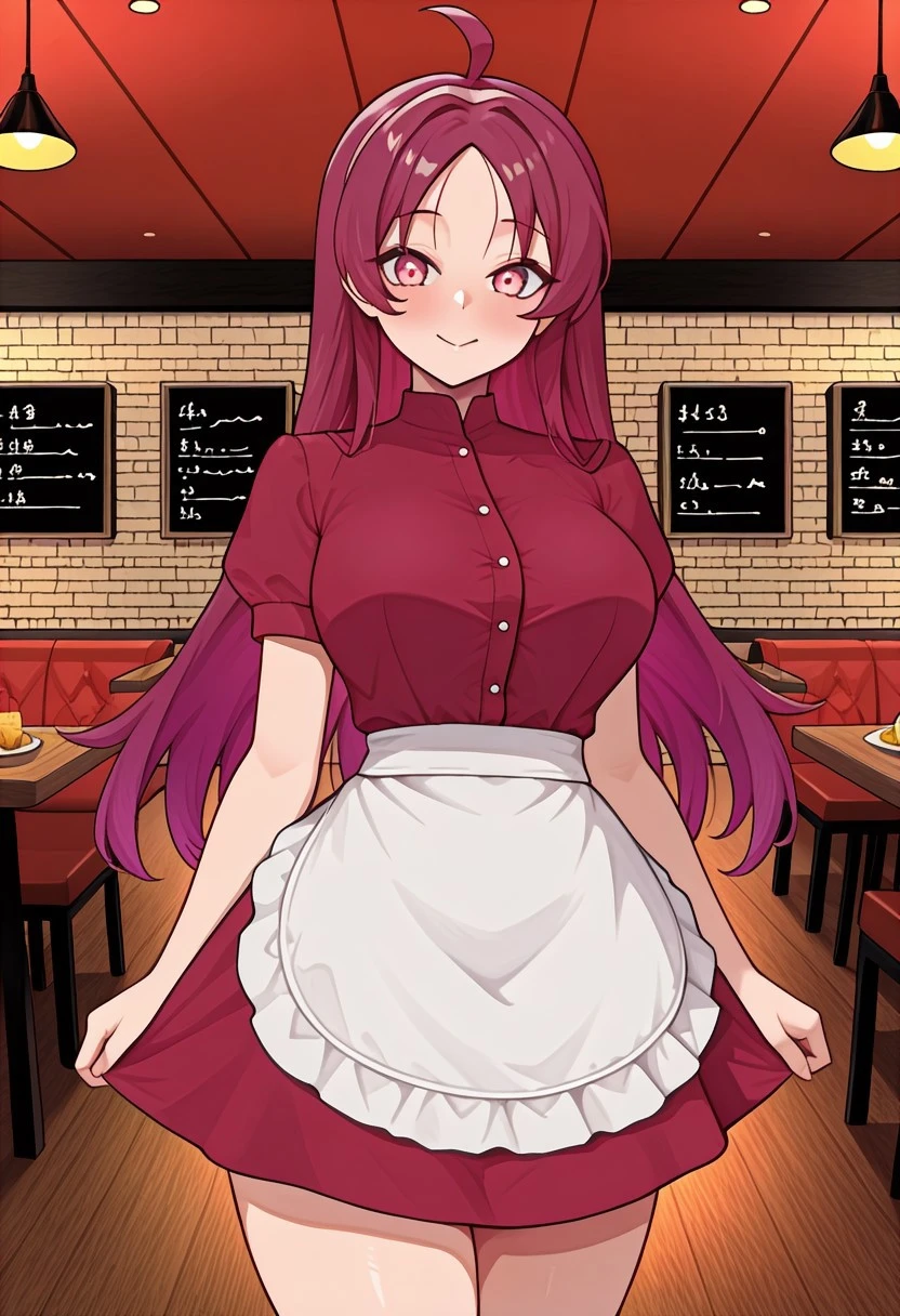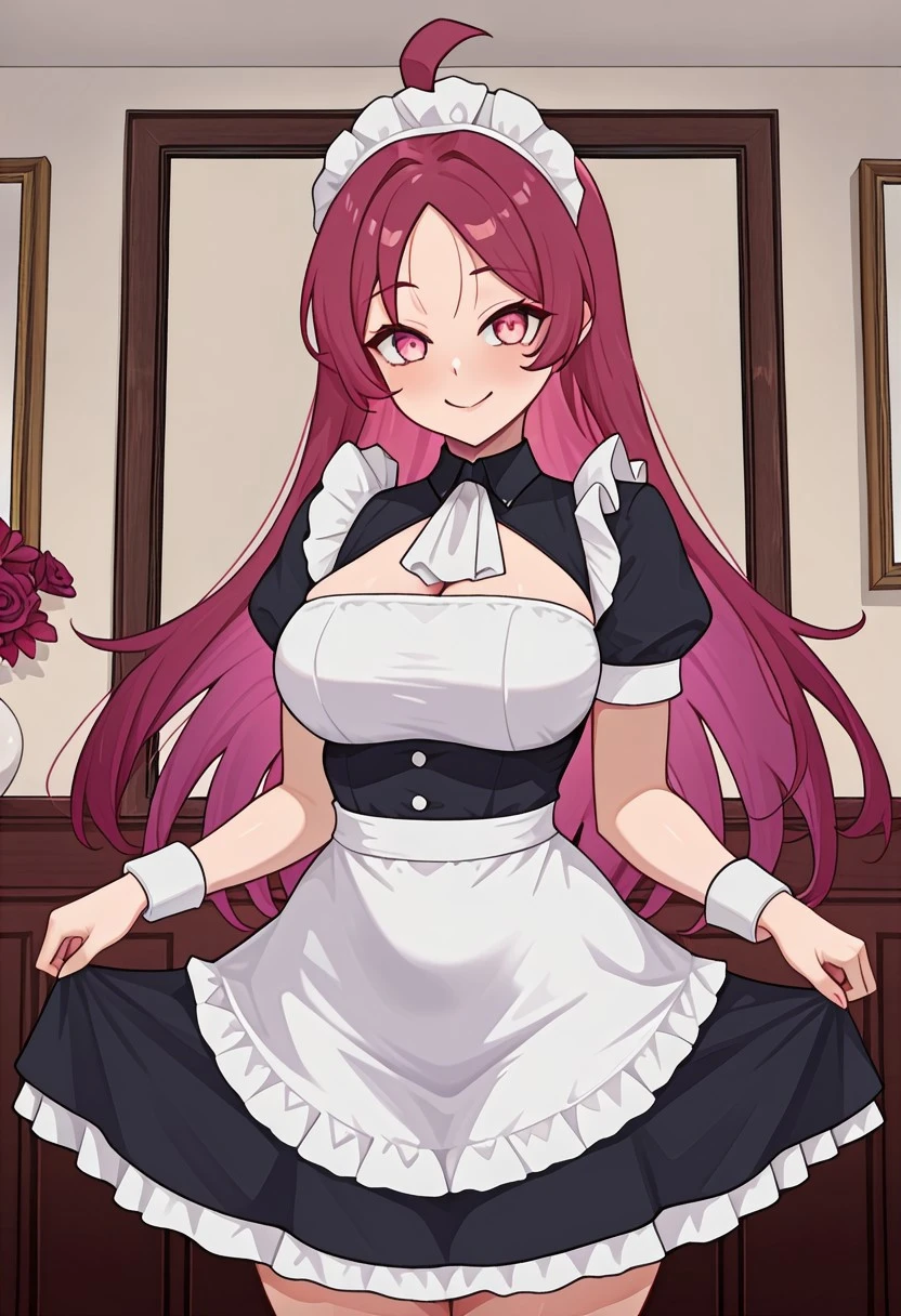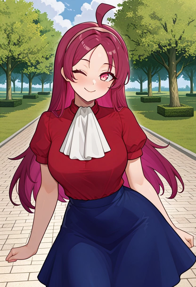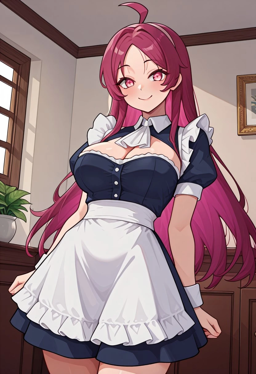 ahoge ,pink eyes,waist-length hair, long hair ,straight hair ,magenta hair ,pink hairband ,parted bangs ,