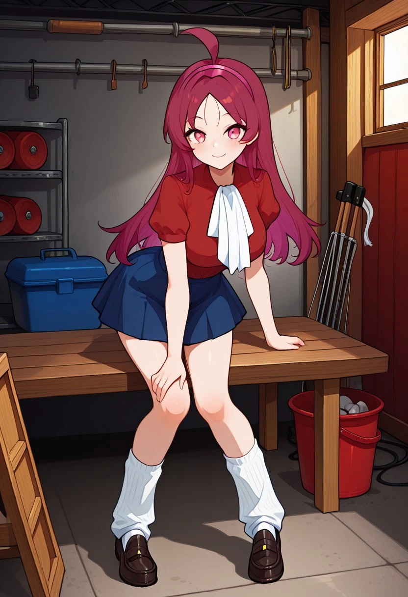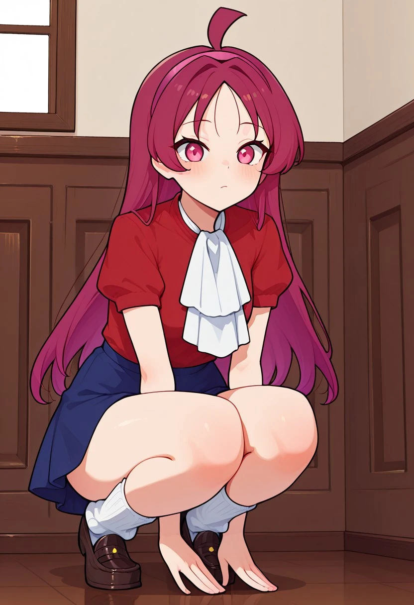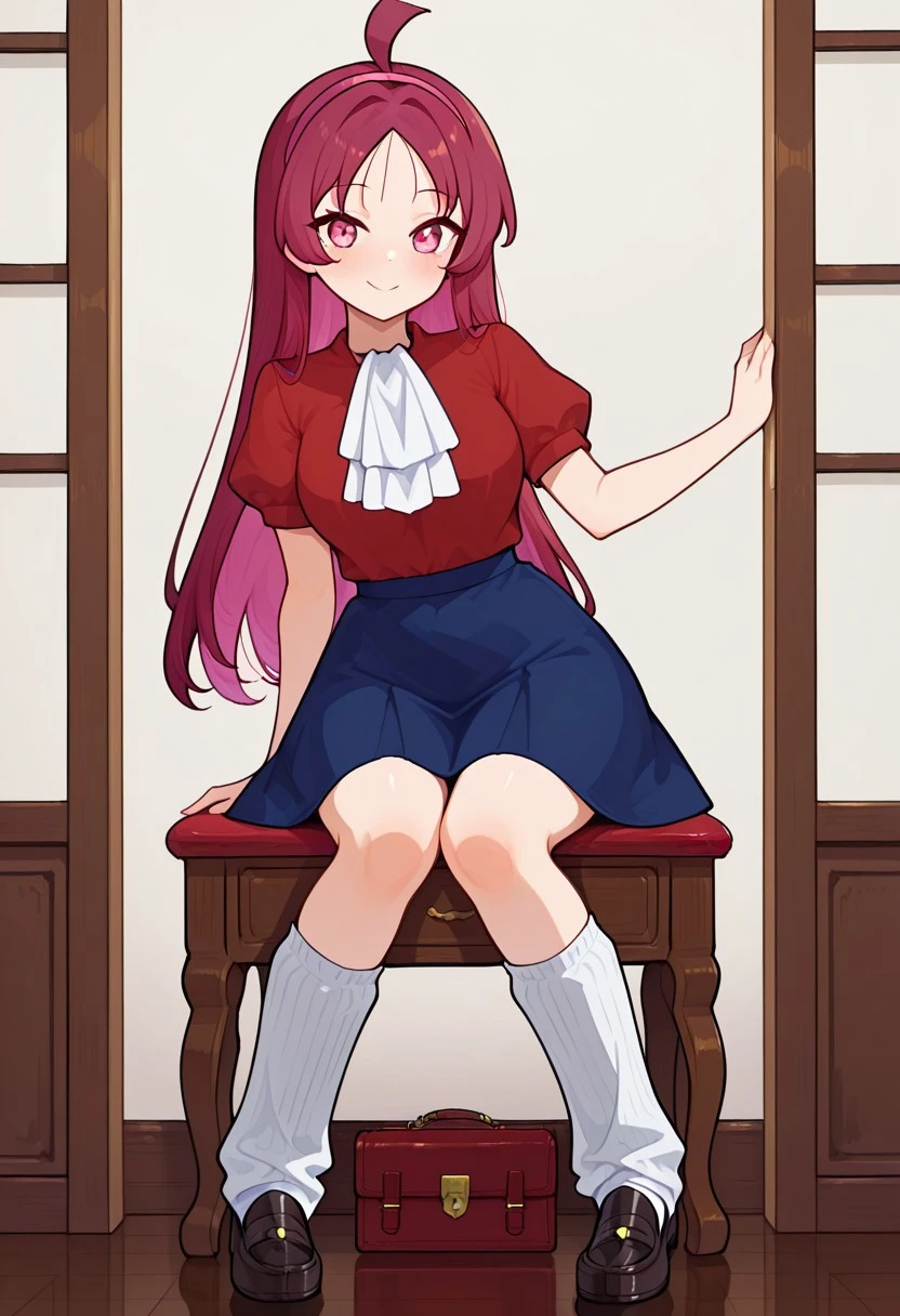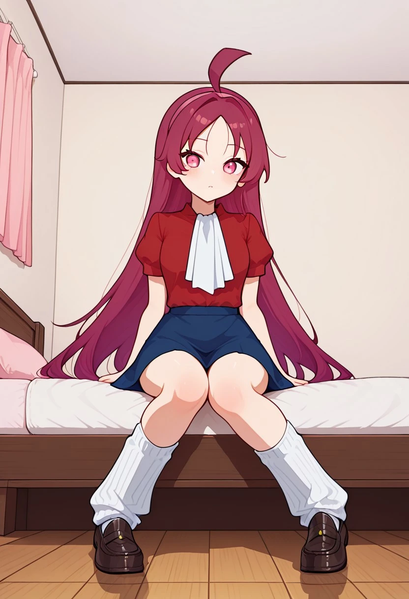 solid shirt ,red shirt, puff sleeve,short sleeves, white ascot,long ascot, blue skirt, white loose socks ,loafer,button on footwear,