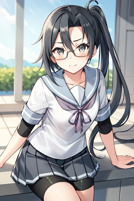 amagiriKC, 1girl, solo, long hair,school uniform, ponytail, short sleeves, pleated skirt, glasses, serafuku, grey skirt, asymmetrical bangs, undershirt, grey sailor collar, grey ribbon,bike shorts,