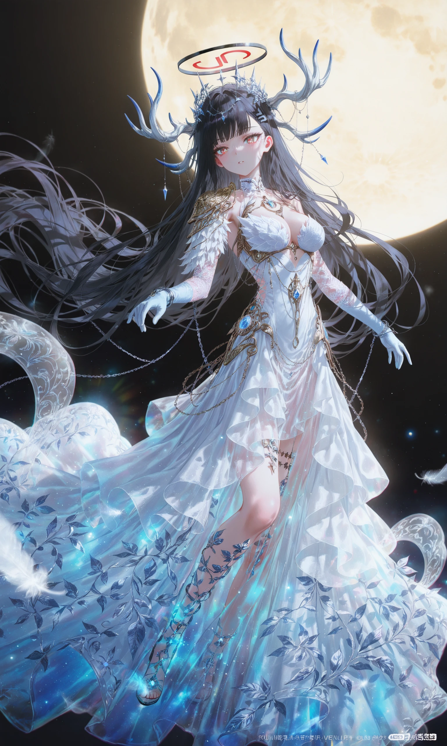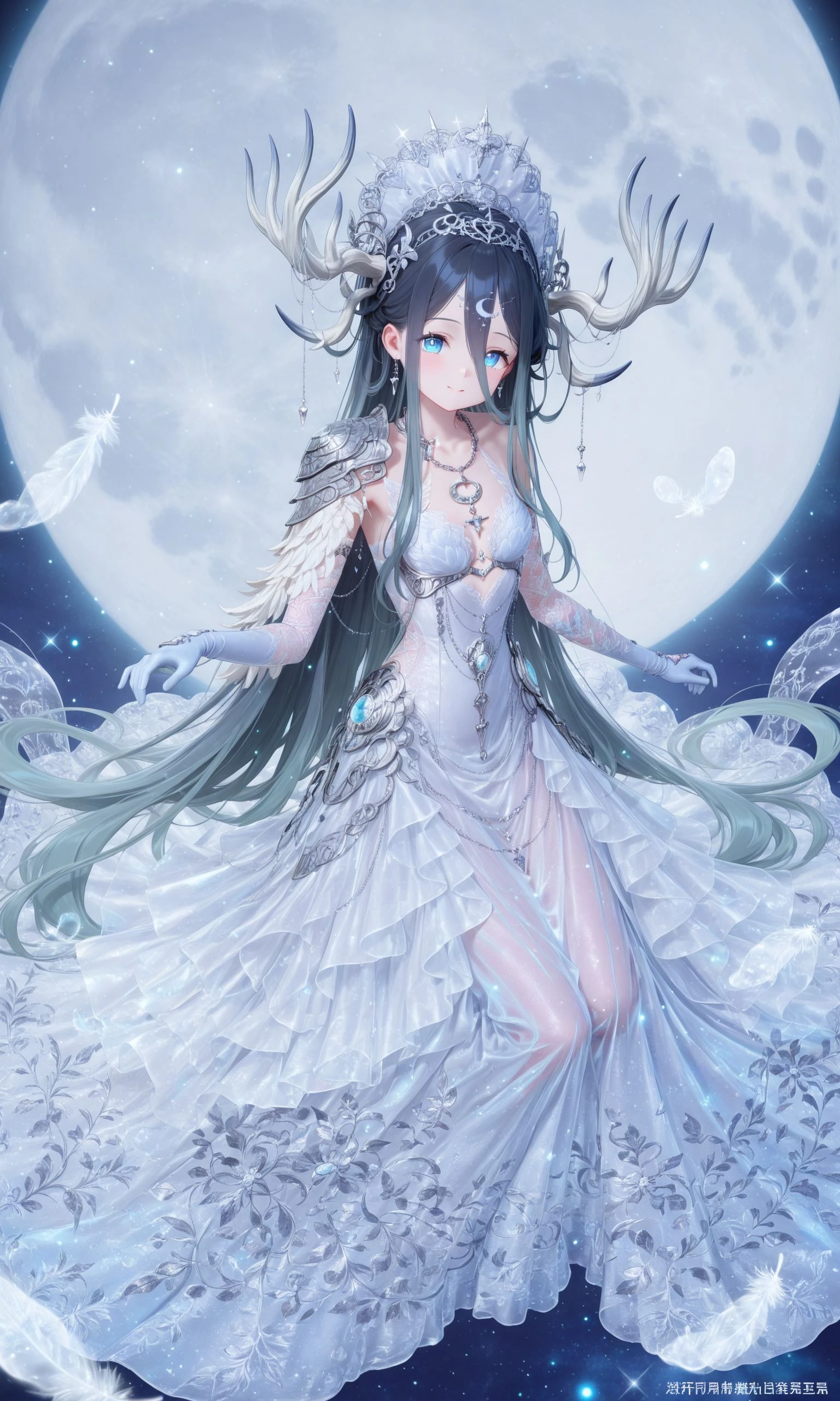 ,shuoyue\(shenlin\),silver jewelry,chain,antler,see-through,dress,horns,armor,pauldron,feather,lace pattern,elbow gloves,shiny,Moon shaped headwear,cosmetic decoration on the forehead,Particle effects,sparkling effects,