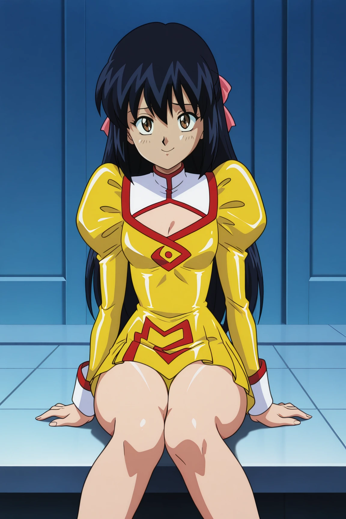 1girl, rie petoriyacowa, agent aika, black hair, brown eyes, long hair, hair ribbon, pink ribbon,