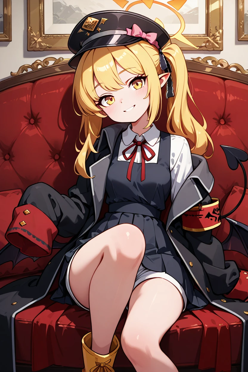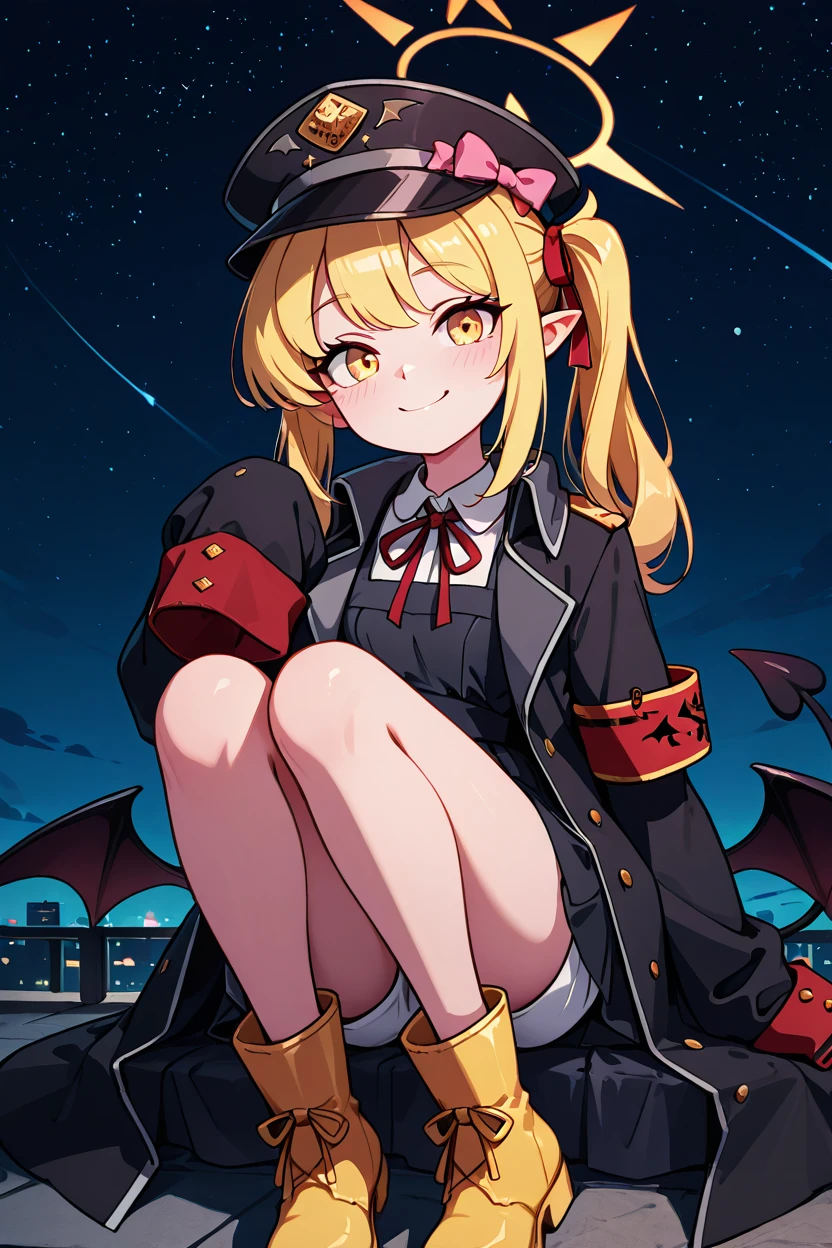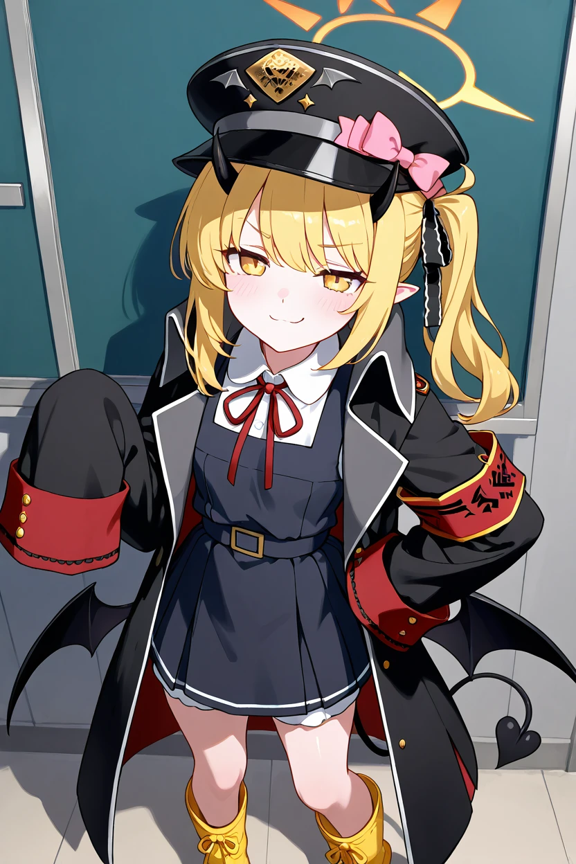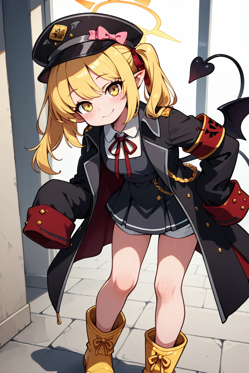 zzIbuki, yellow eyes, yellow halo, blonde hair, long hair, tail, side ponytail, horns, demon horns, black horns, hair ribbon, pointy ears, wings, demon wings, black wings, tail, demon tail, horns, black tail, demon horns, black horns, demon girl, low wings, hair ribbon, neck ribbon, black headwear, red ribbon, peaked cap, black coat, collared shirt, long sleeves, open coat, pinafore dress, sleeves past fingers, black dress, hat bow, white shirt, yellow footwear, boots, white bloomers, oversized clothes, red armband, military hat, pink bow,