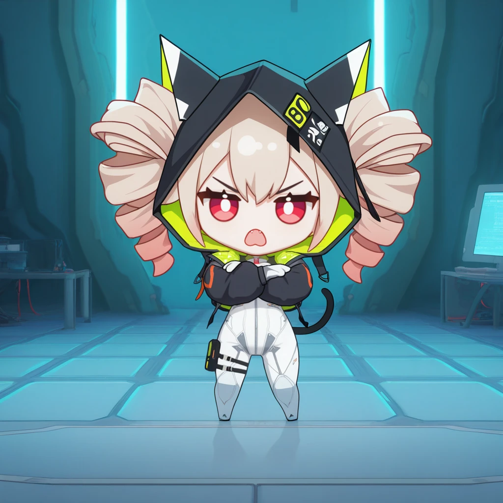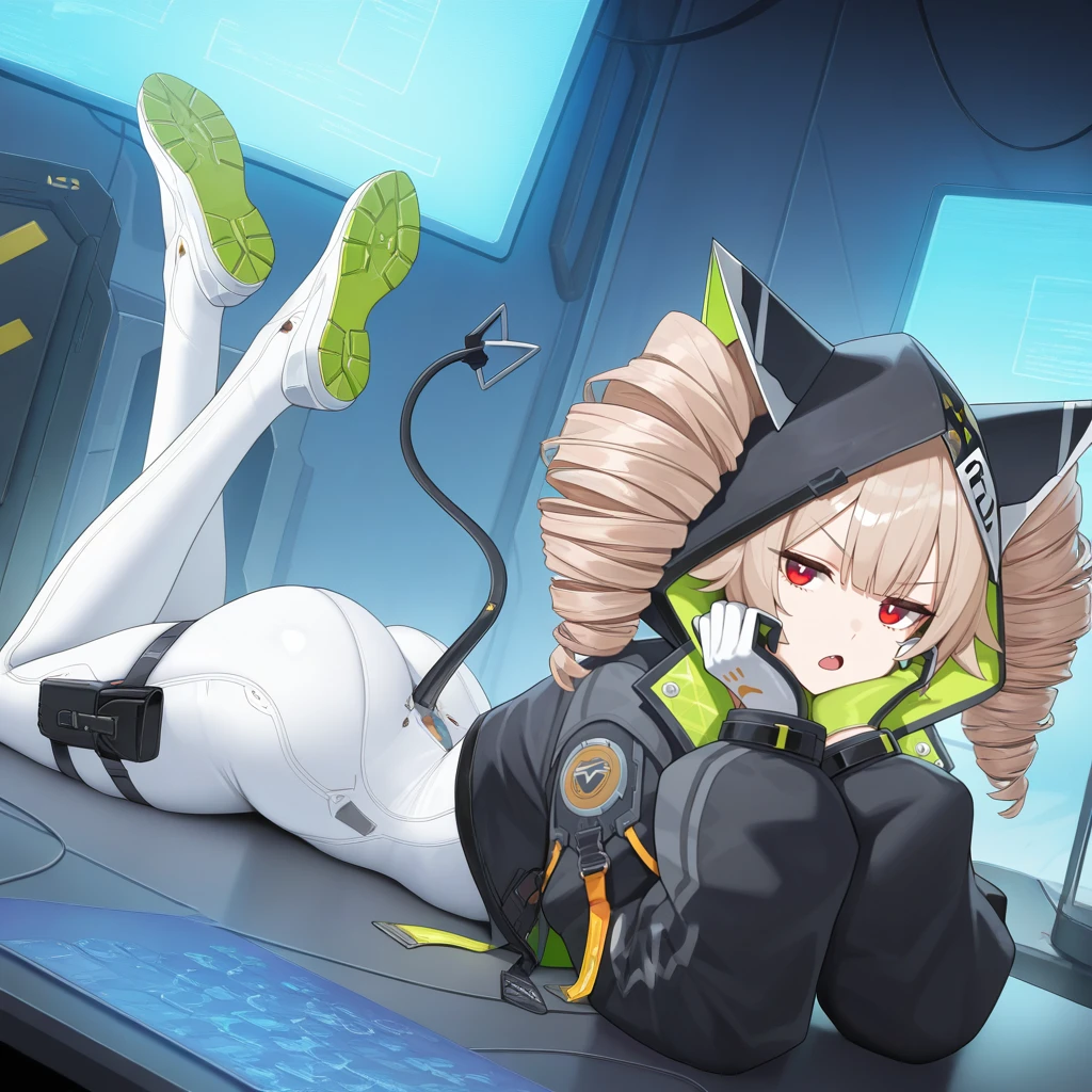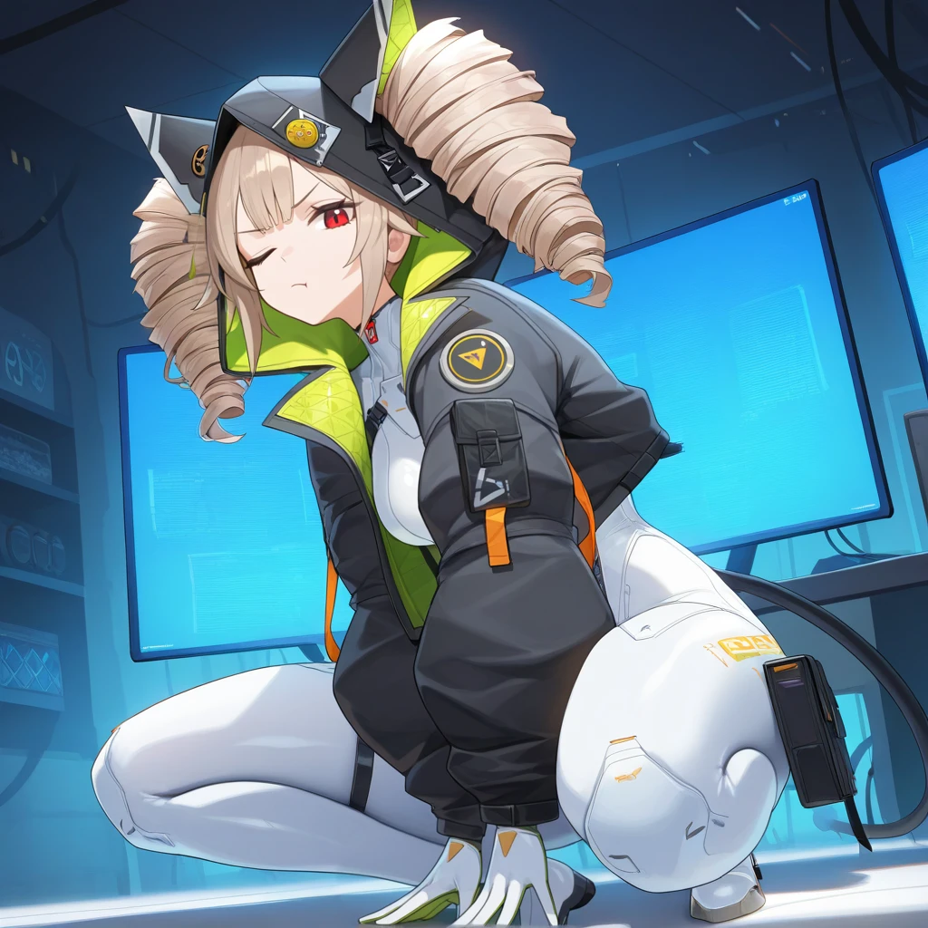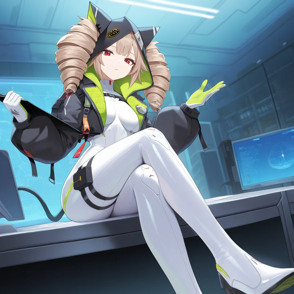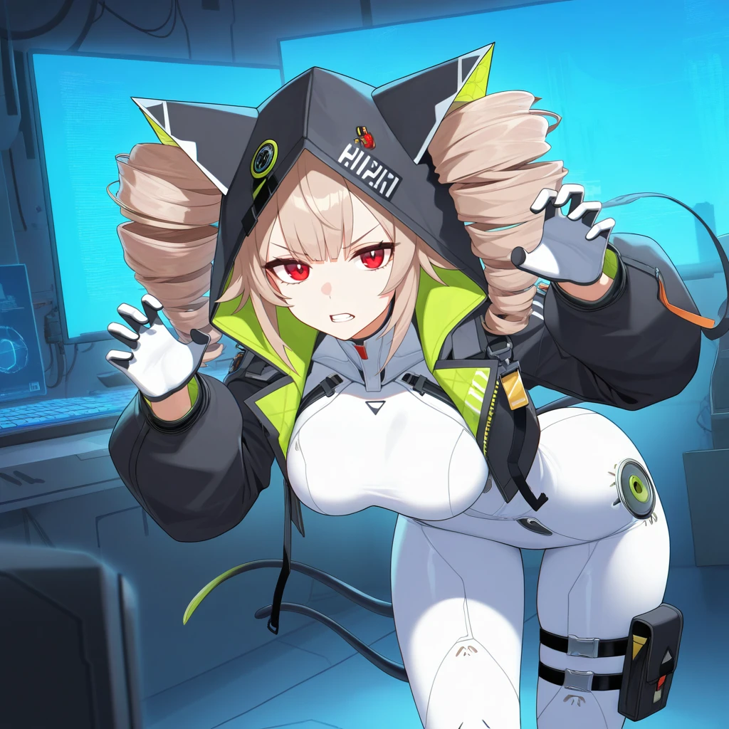 ShiroTof, Shr_Def, twin drills, red eyes, light brown hair, white bodysuit, bodysuit, zipper, white legwear, two-sided hood, black hood, animal hood, black jacket, hooded jacket, hair through hood, cropped jacket, puffy long sleeves, turtleneck, open jacket, black sleeves, two-sided gloves, white gloves, thigh boots, black tail, white footwear, thigh pouch, black thigh strap,Ascended Outfit: