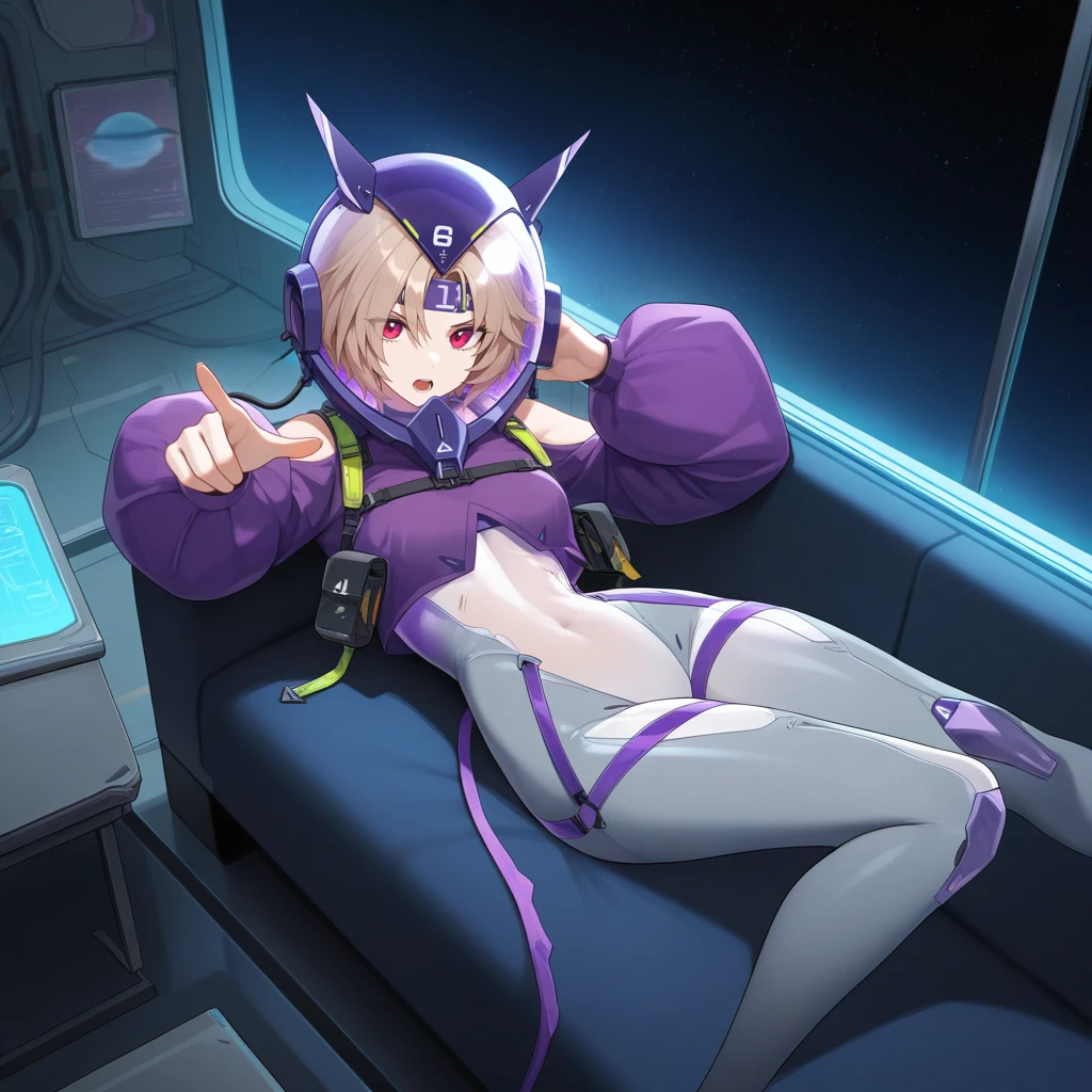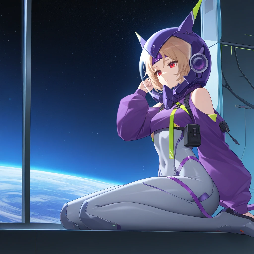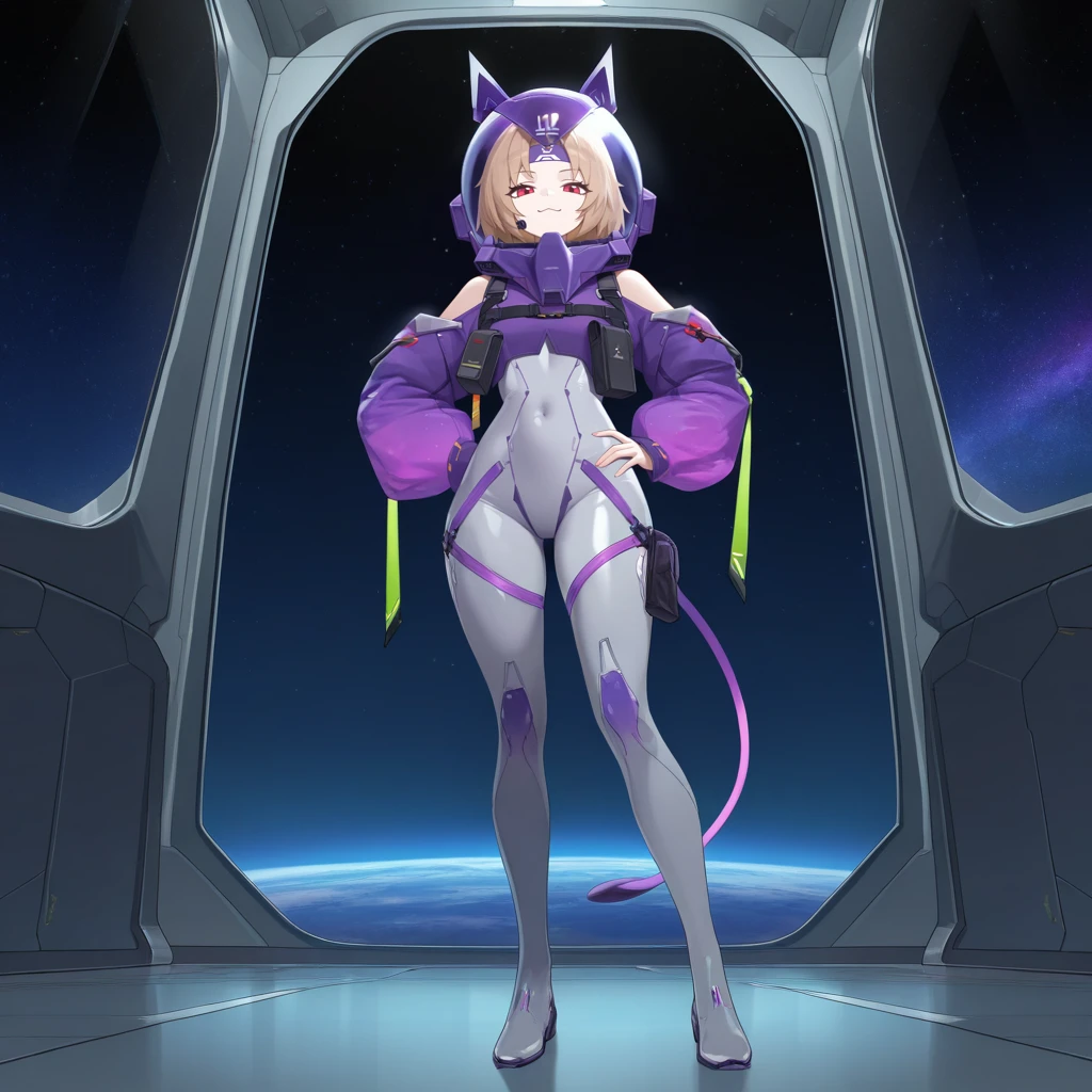 ShiroTof, Shr_Awk, red eyes, light brown hair, short hair, space helmet, purple headwear, see-through, shoulder cutout, bare shoulders, crop top, purple shirt, headgear, off-shoulder shirt, armored collar, pouch, chest harness, harness, headband, puffy sleeves, long sleeves, purple sleeves, magenta trim, stole, covered navel, sleeveless bodystocking, white bodystocking, grey bodysuit, sleeveless bodysuit, grey legwear, grey thigh boots, purple strap, purple thigh strap, purple tail, antenna,The results of your generations are dependent on the additional LoRAs, weights, and models you use, so it may not work or come out as consistent as my sample images.