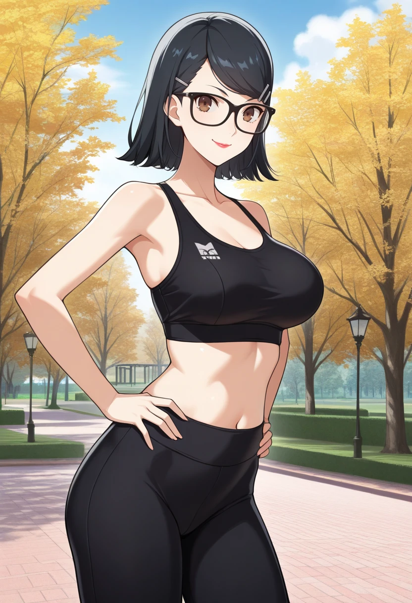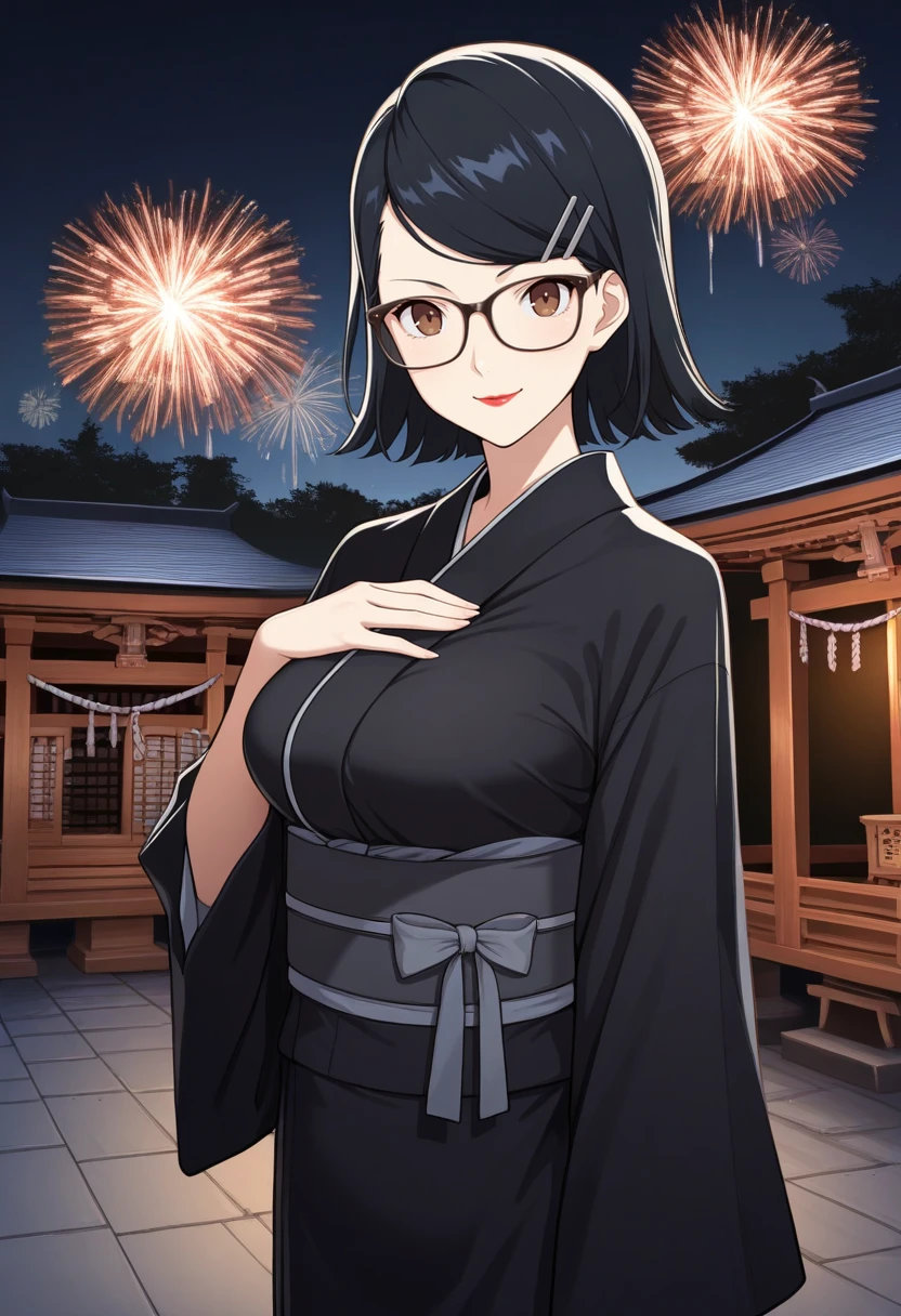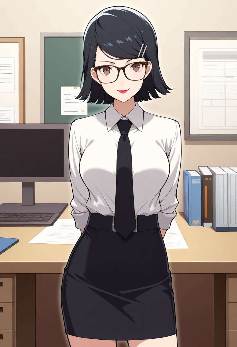 tags: k4t4yamap5x, black hair, short hair, brown eyes, hairclip, glasses, lipstick, necklace, black dress, turtleneck, belt,