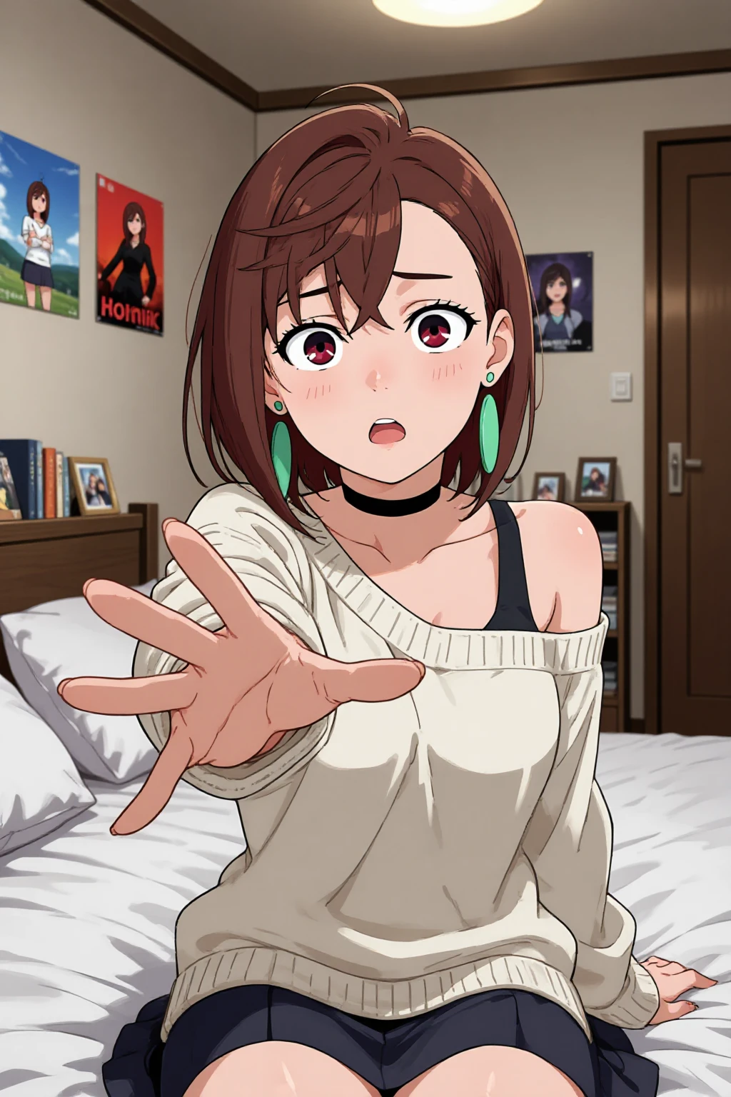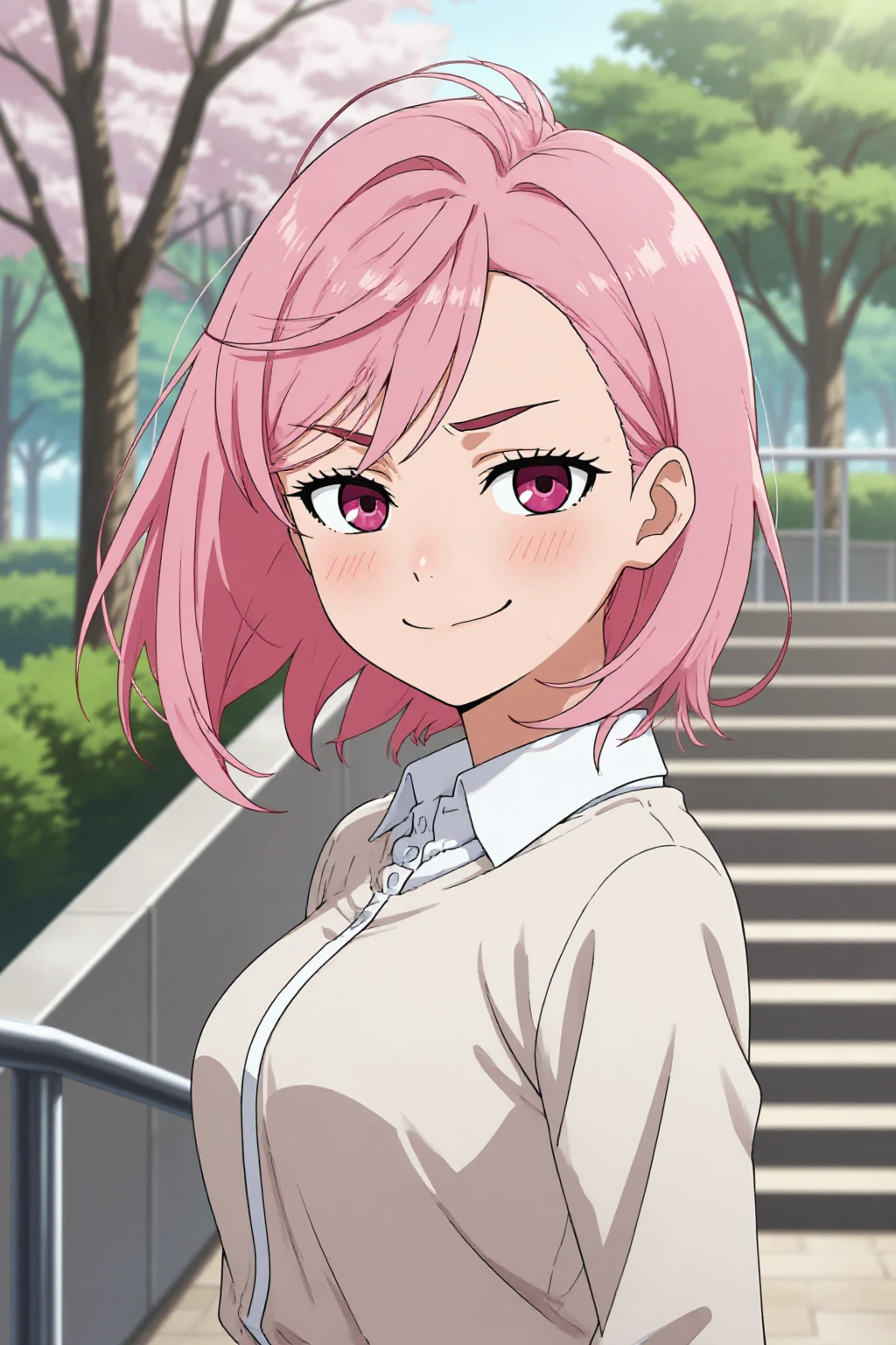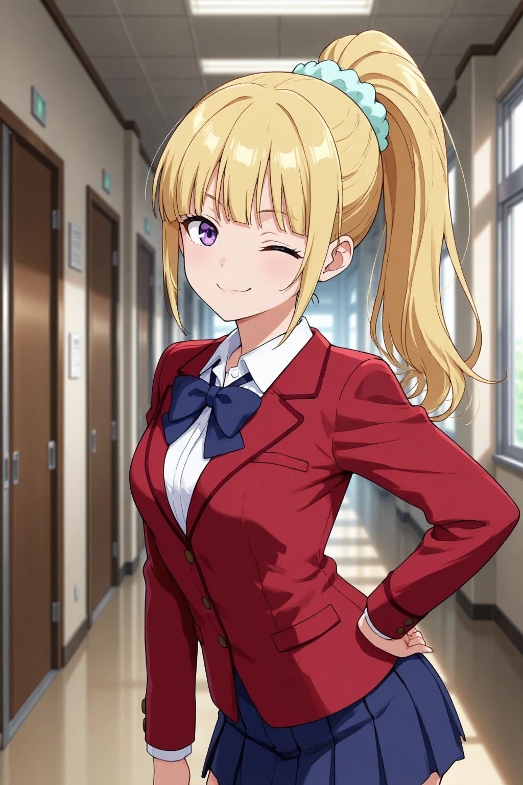A confident anime warrior with short dark hair and sharp blue eyes,