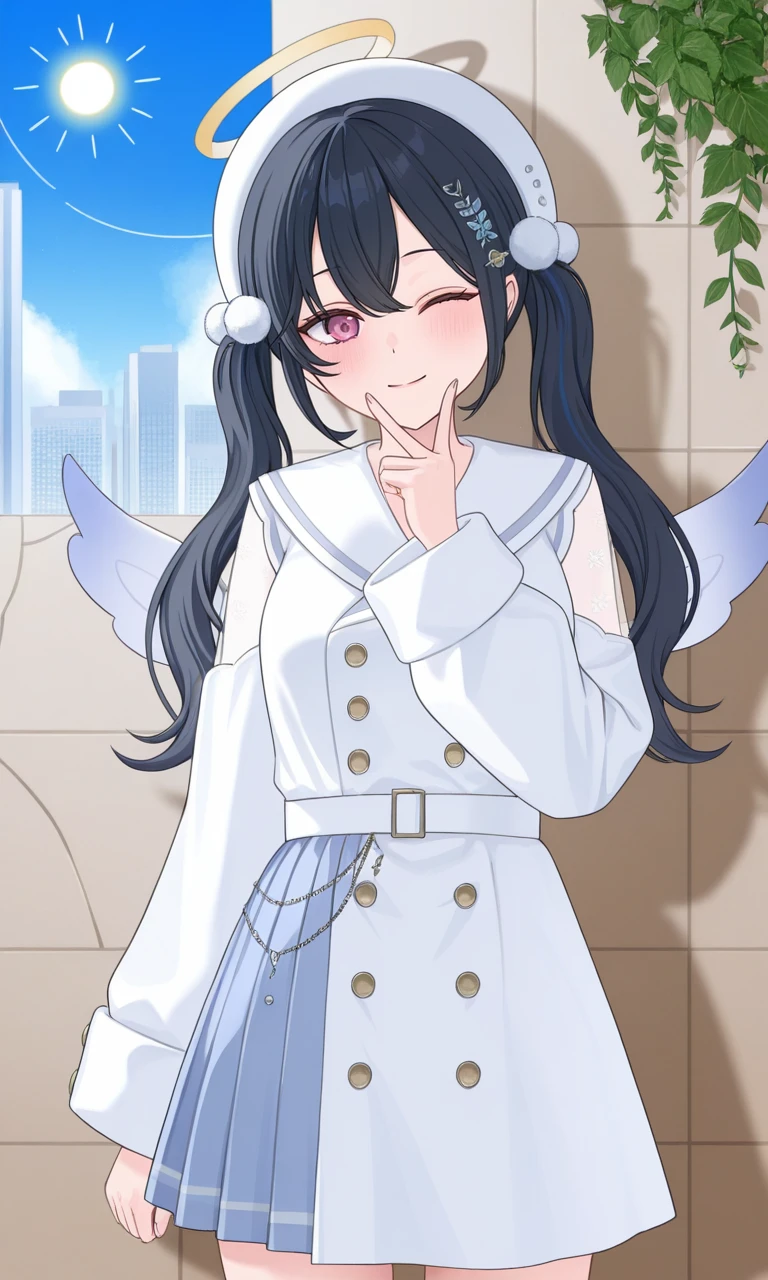 • no capelet : white sailor collar, white dress, double-breasted, long sleeves, see-through sleeves, mini wings, white belt, blue skirt, pleated skirt