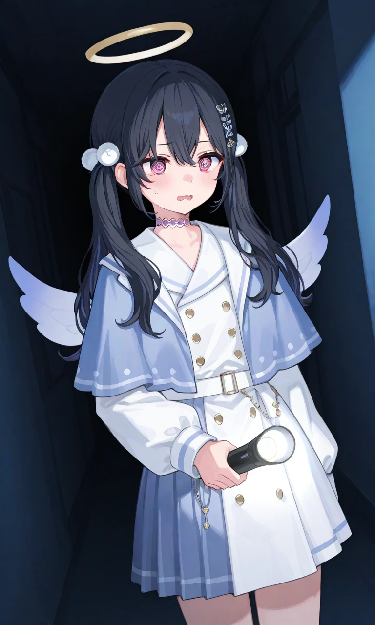 • capelet : blue capelet, white dress, double-breasted, long sleeves, mini wings, white belt, blue skirt, pleated skirt