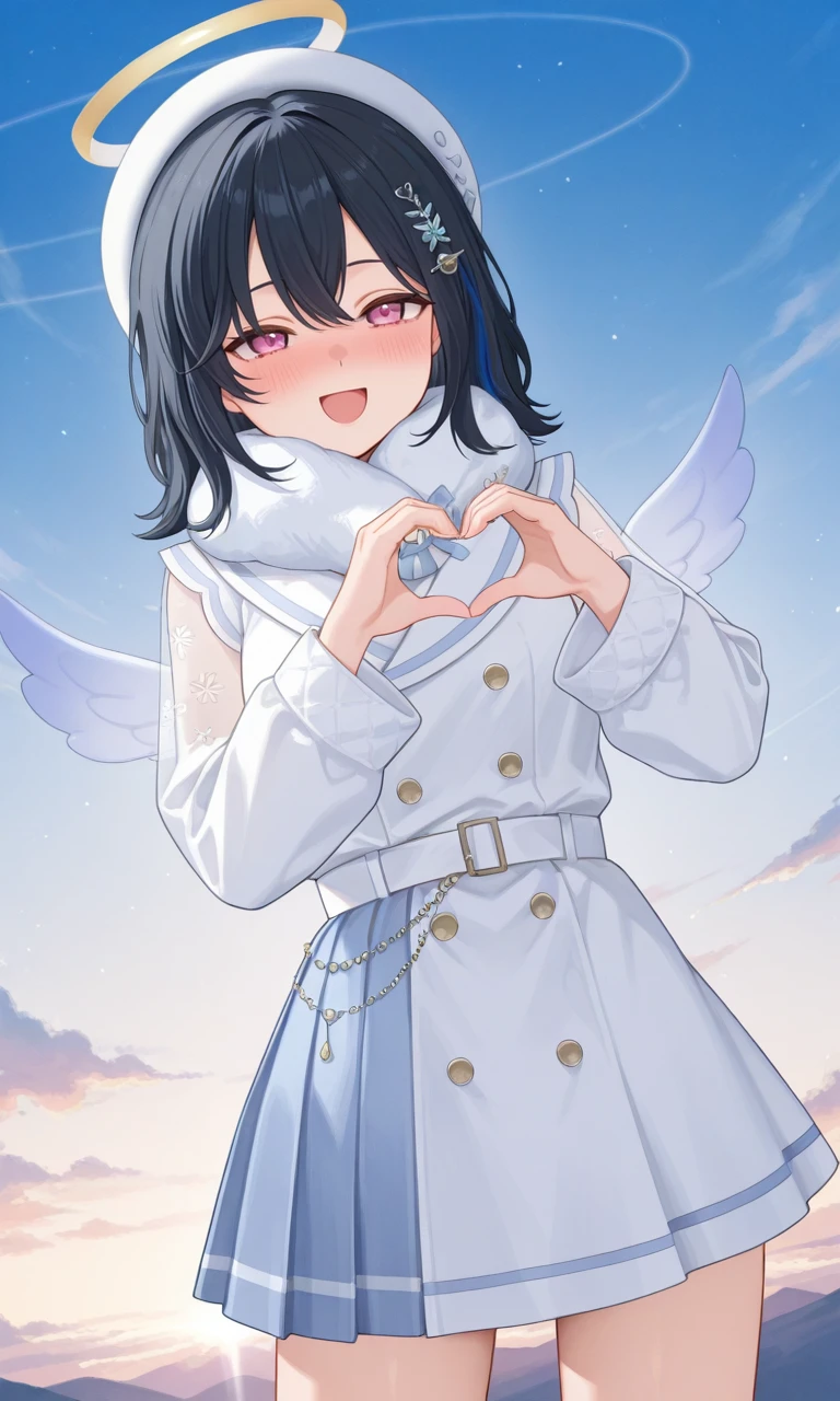 blue capelet, white dress, double-breasted, long sleeves, mini wings, white belt, blue skirt, pleated skirt