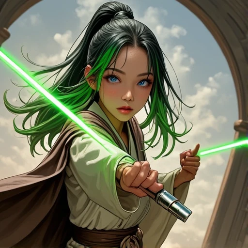 Shelly Weed, multicolored hair, Green hair with dark green streaks, high ponytail with face-framing tendrils, shoulder length hair, silk like hair, bright blue eyes, pale clean skin, medium breasts, oval face, tanned, tan lines, perfect eyes, cute nose, small, slim,